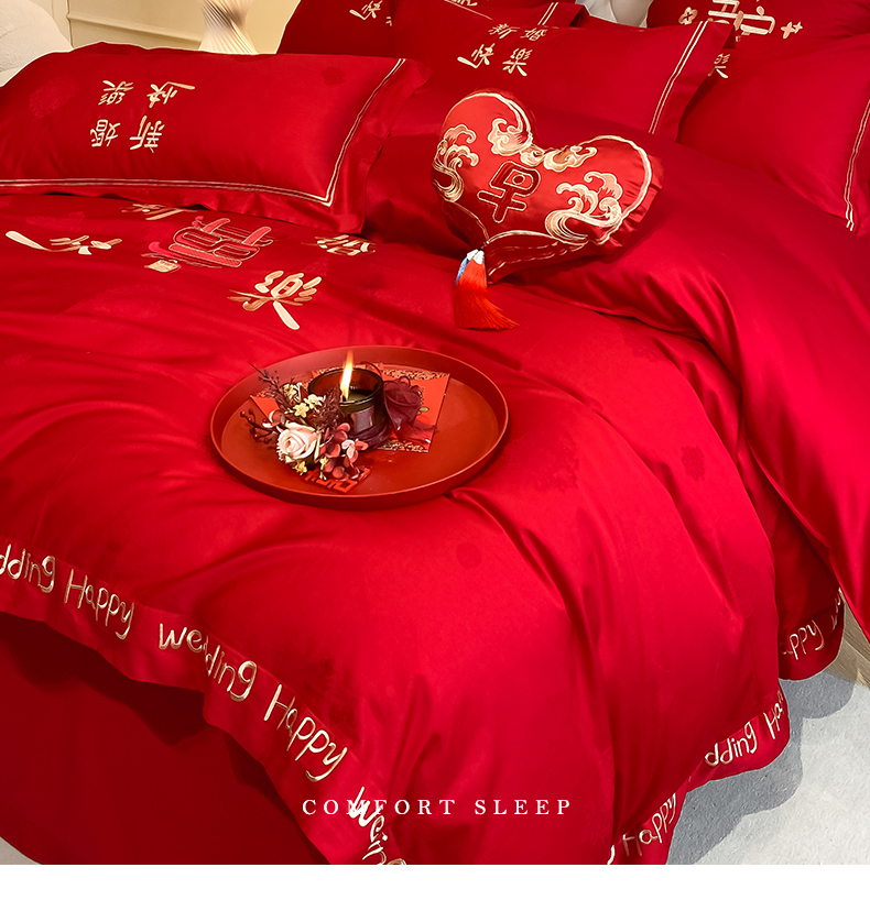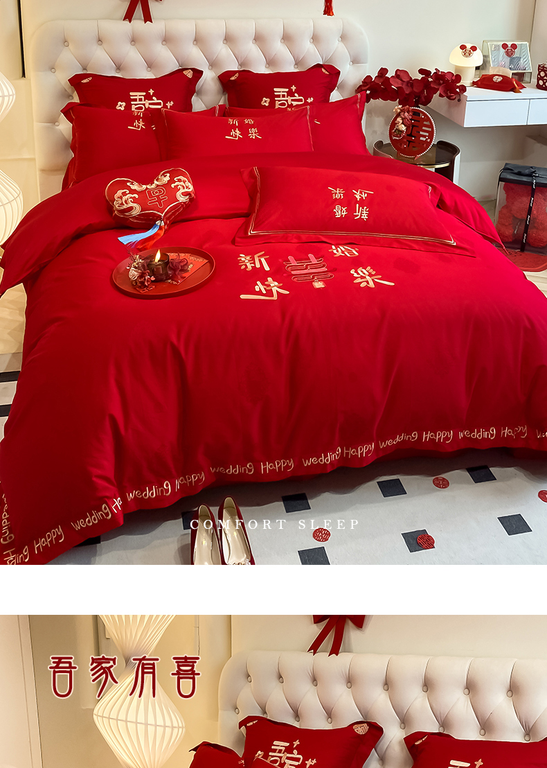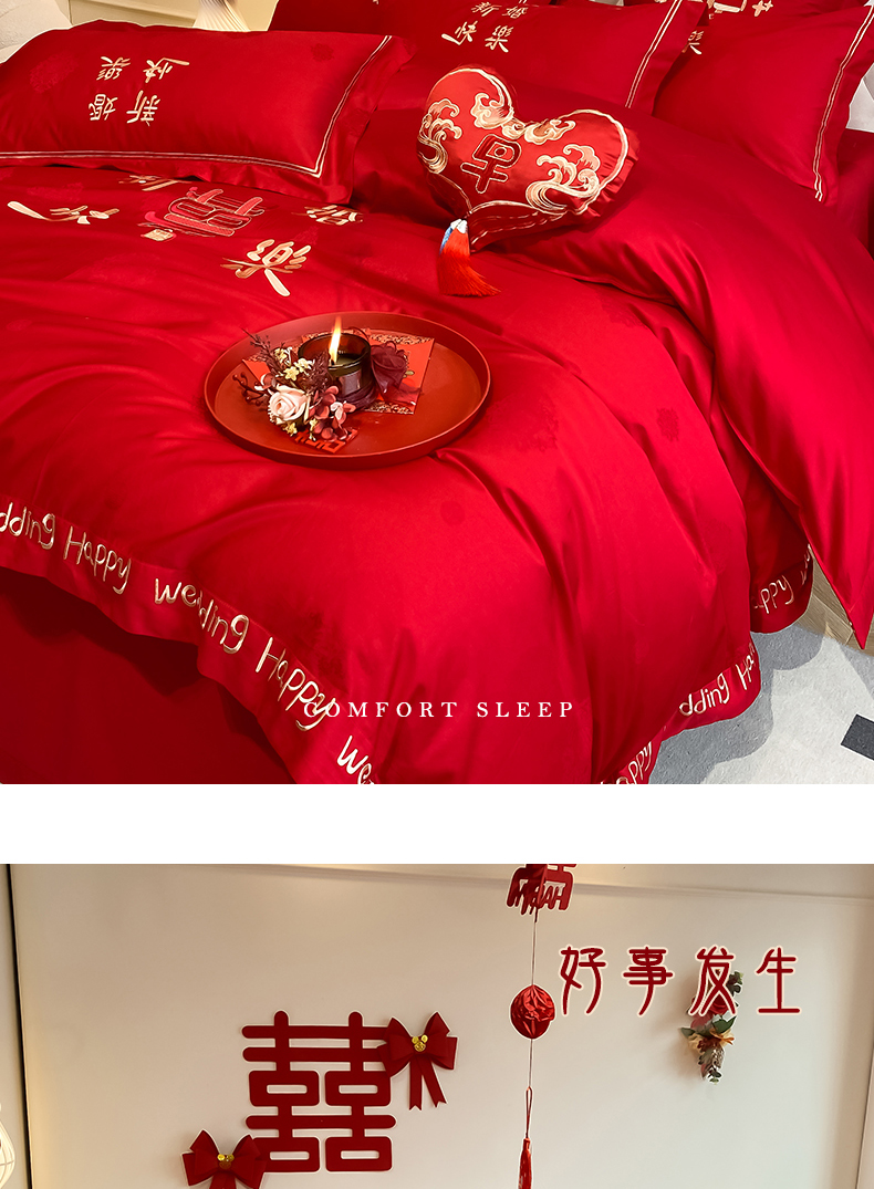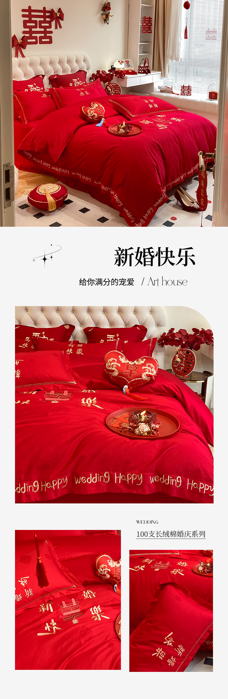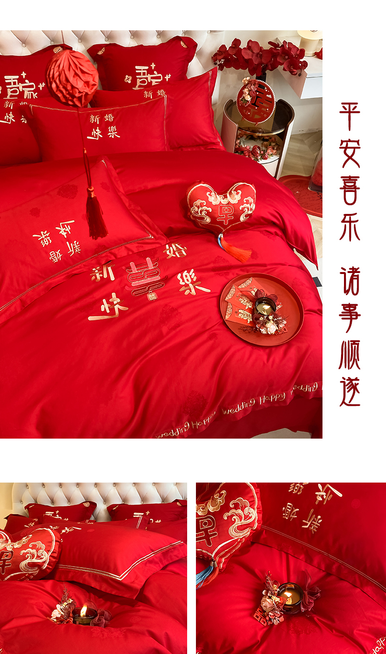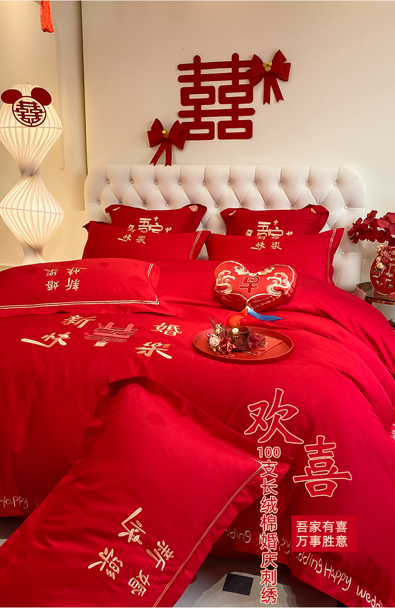 当前位置: 91家纺网 > 商品网购 > 床品套件 > 四件套 > 婚庆四件套 > 玉雅家纺 2025新款100支长绒棉高档提花刺绣婚庆四件套 新婚快乐