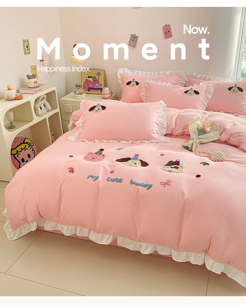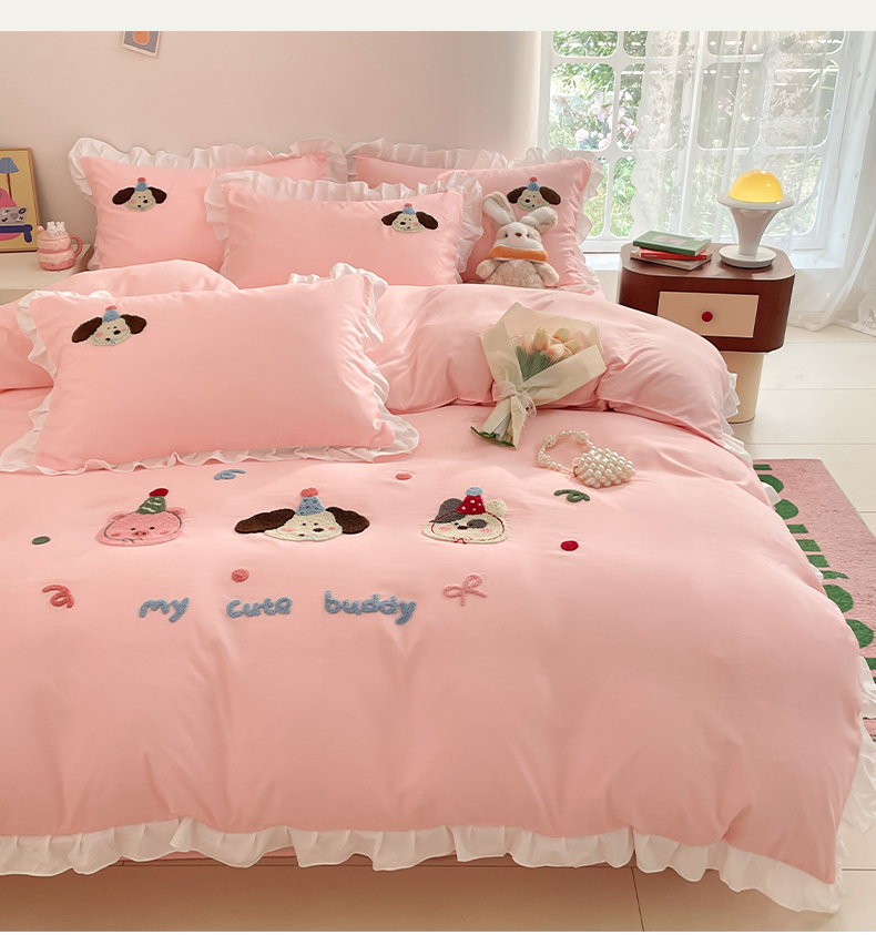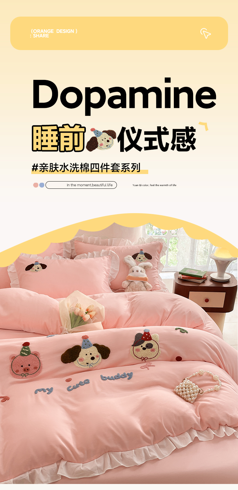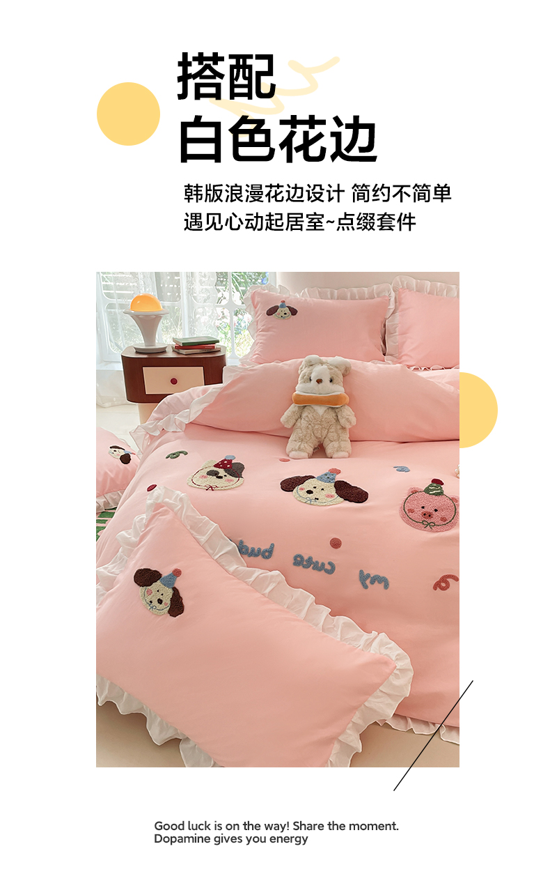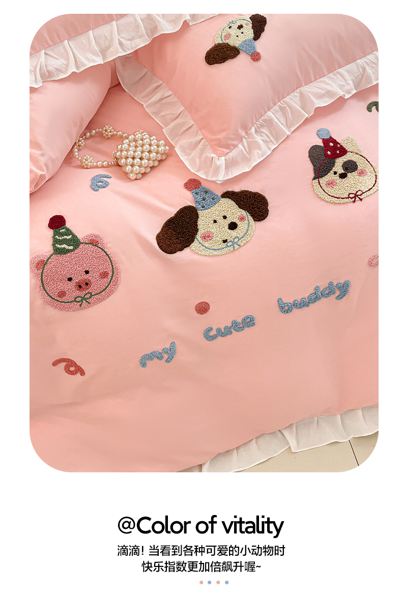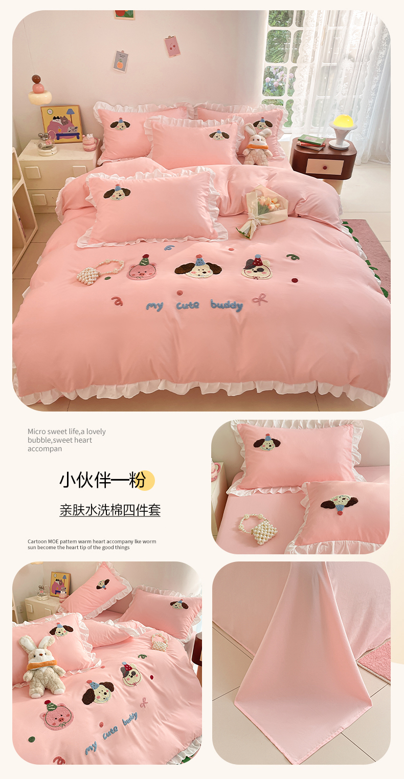 当前位置: 91家纺网 > 商品网购 > 床品套件 > 四件套 > 毛巾绣四件套 > 易禾家纺 2024新款专板花型亲肤水洗棉毛巾绣花边四件套-小伙伴 小伙伴-粉