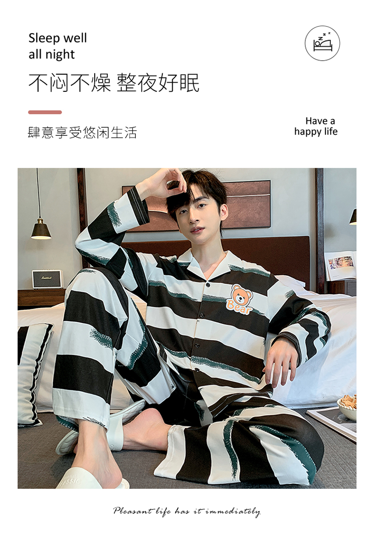 春秋季新款纯棉休闲简约睡衣高级质量家居服夏季男士宽松舒适睡衣翻领 89297