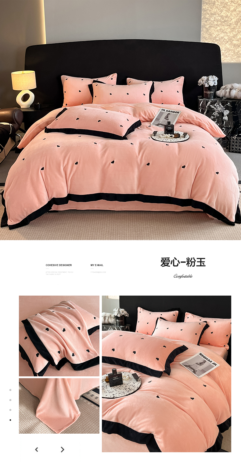 商品名称:米彩家纺 2024新款A类轻奢风牛奶绒绣花四件套-爱心蝴蝶结系列 爱心-粉玉