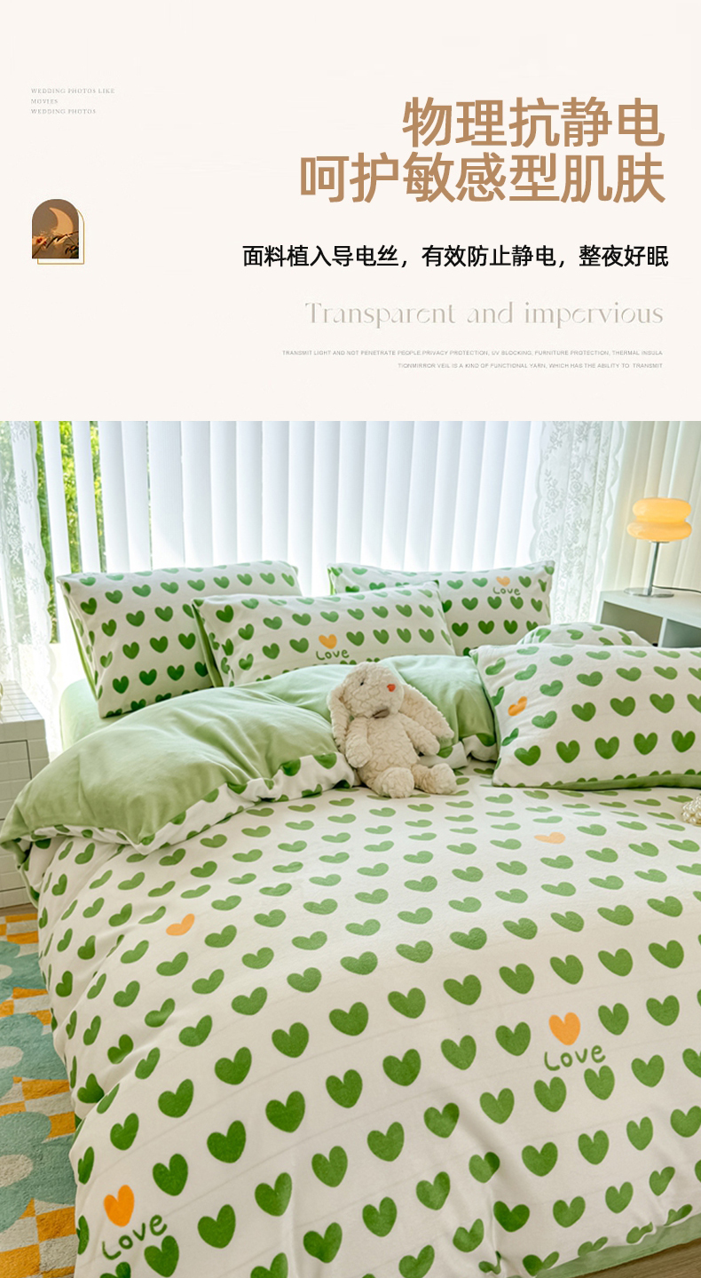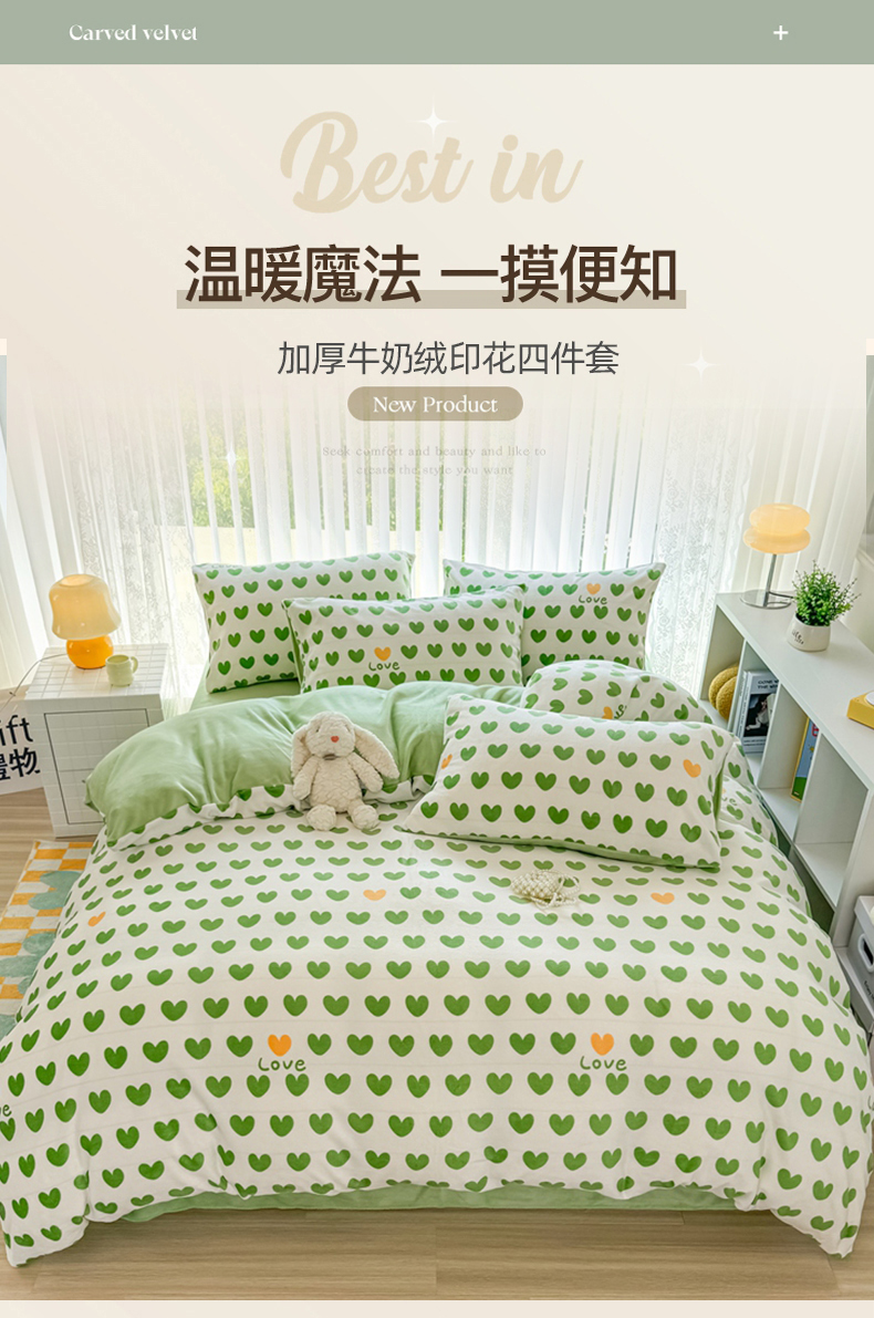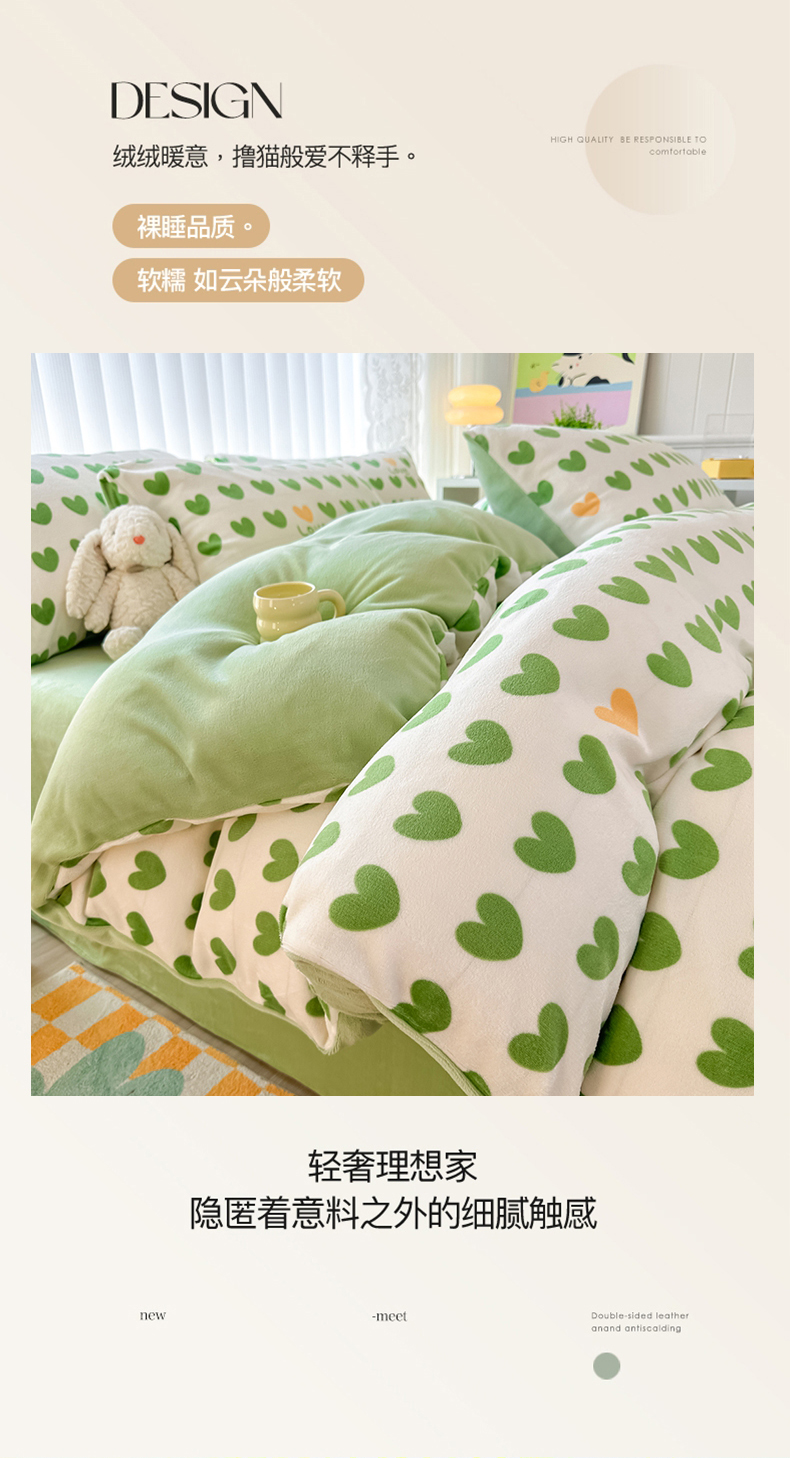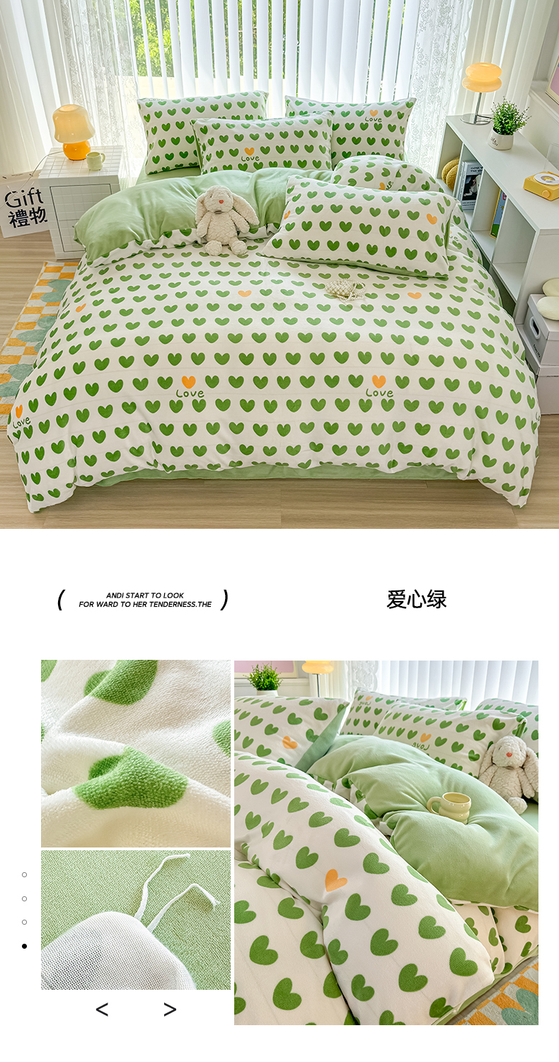当前位置: 91家纺网 > 商品网购 > 床品套件 > 四件套 > 牛奶绒四件套 > 觅妮家纺 2025新款高克重秋冬加厚印花牛奶绒四件套 爱心绿