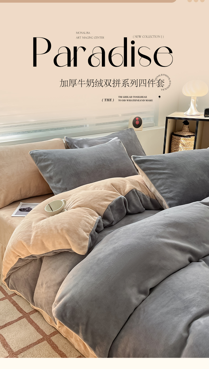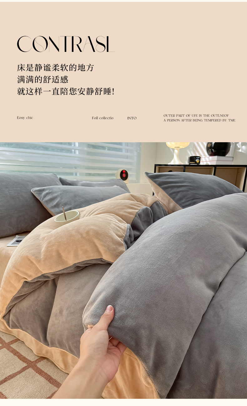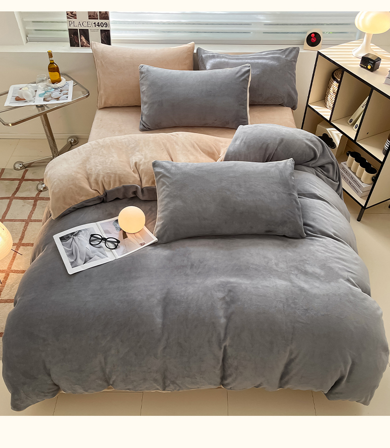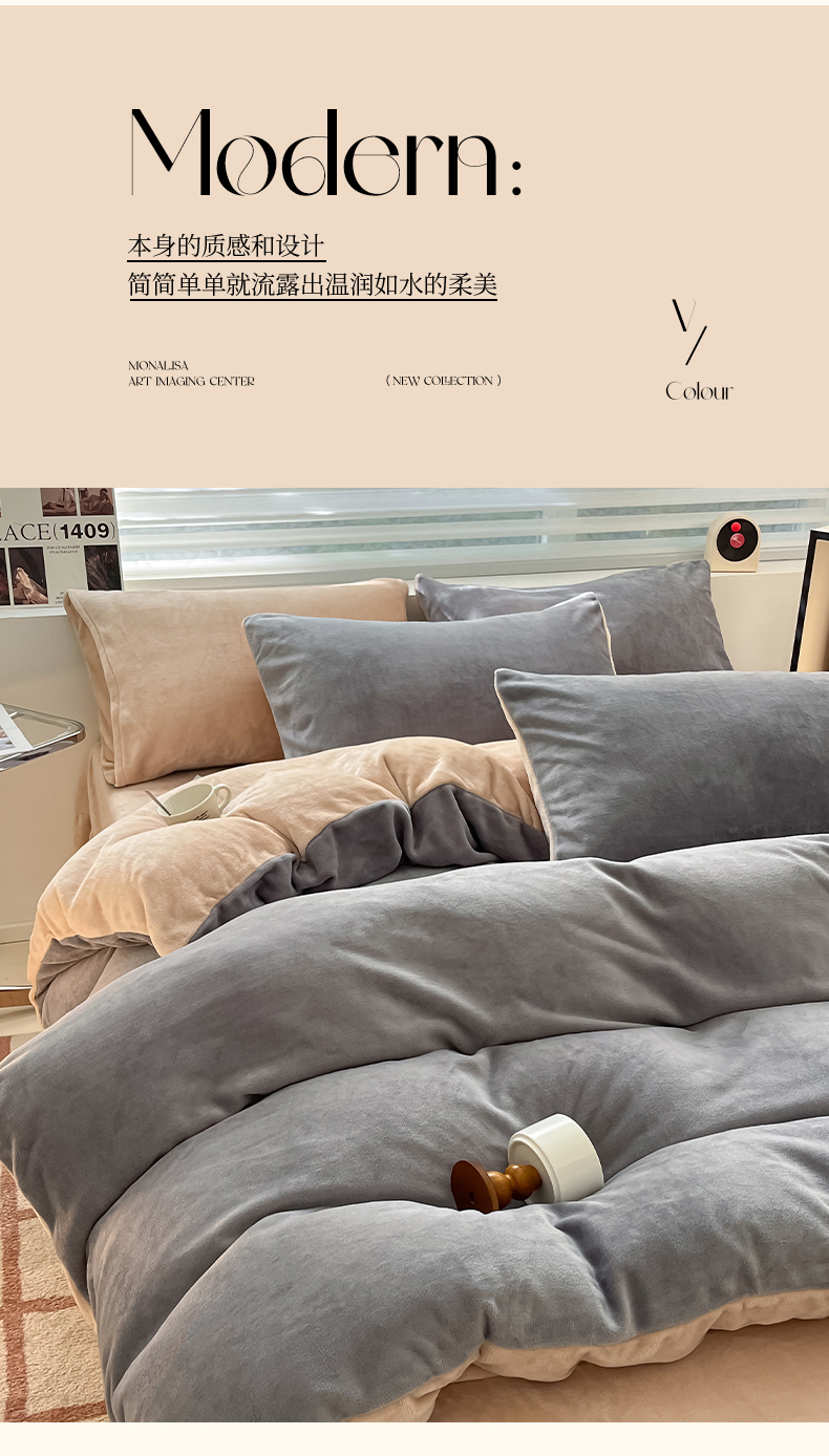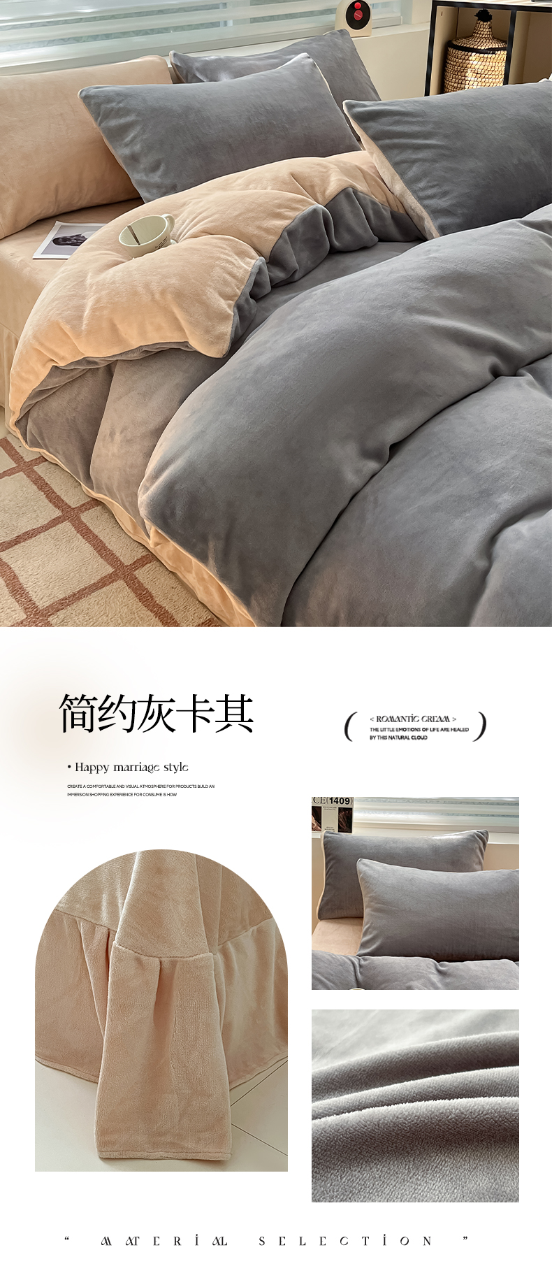 商品名称:绘萱 2025新款高克重纯色双拼牛奶绒四件套 简约灰卡其