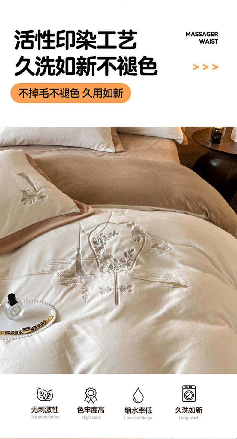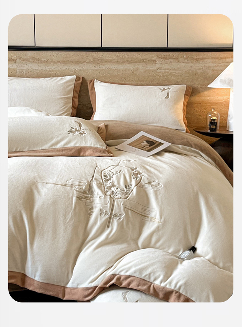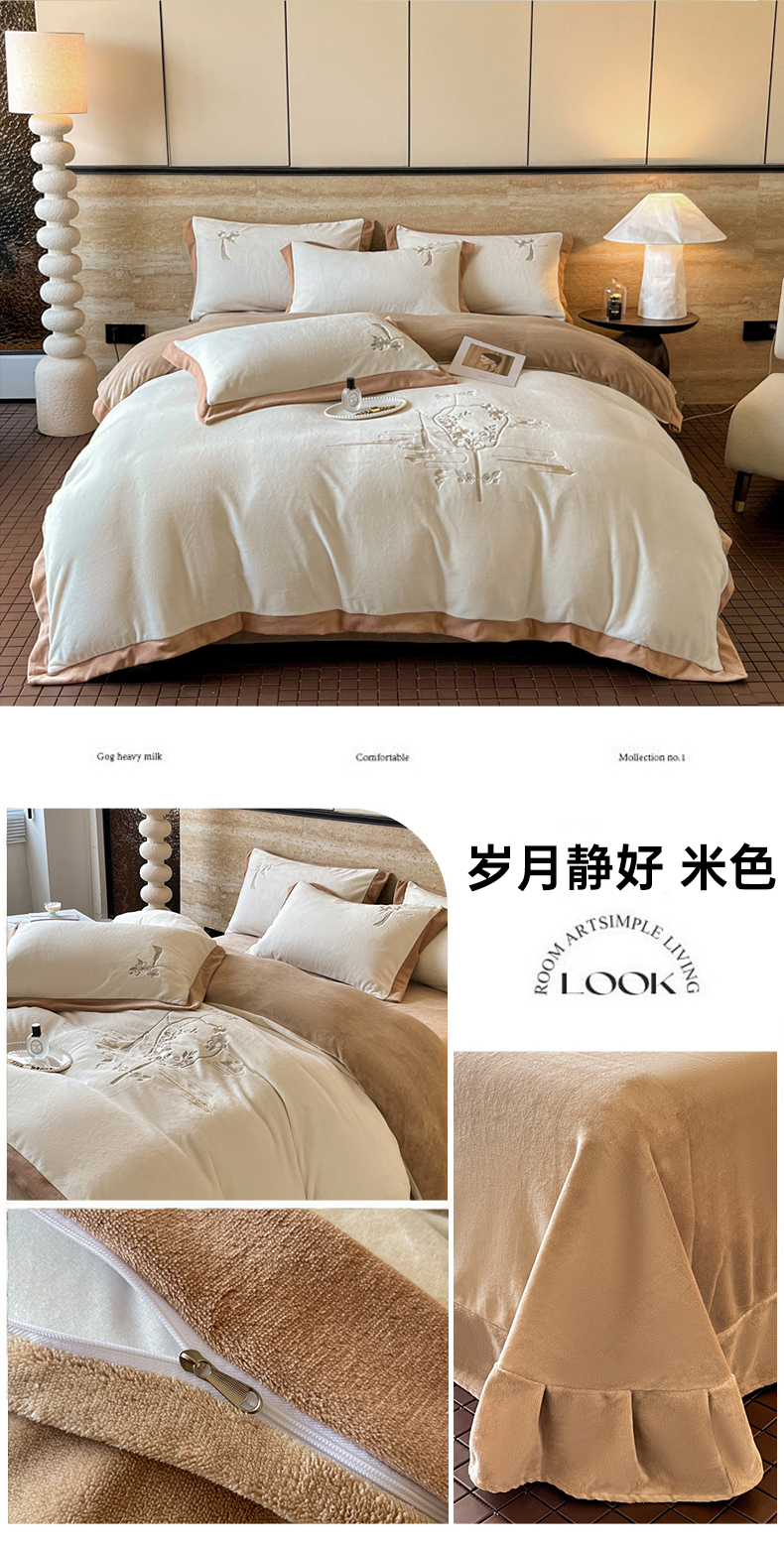 恋佳居 2025新款牛奶绒高克重平绣四件套 岁月静好-米色