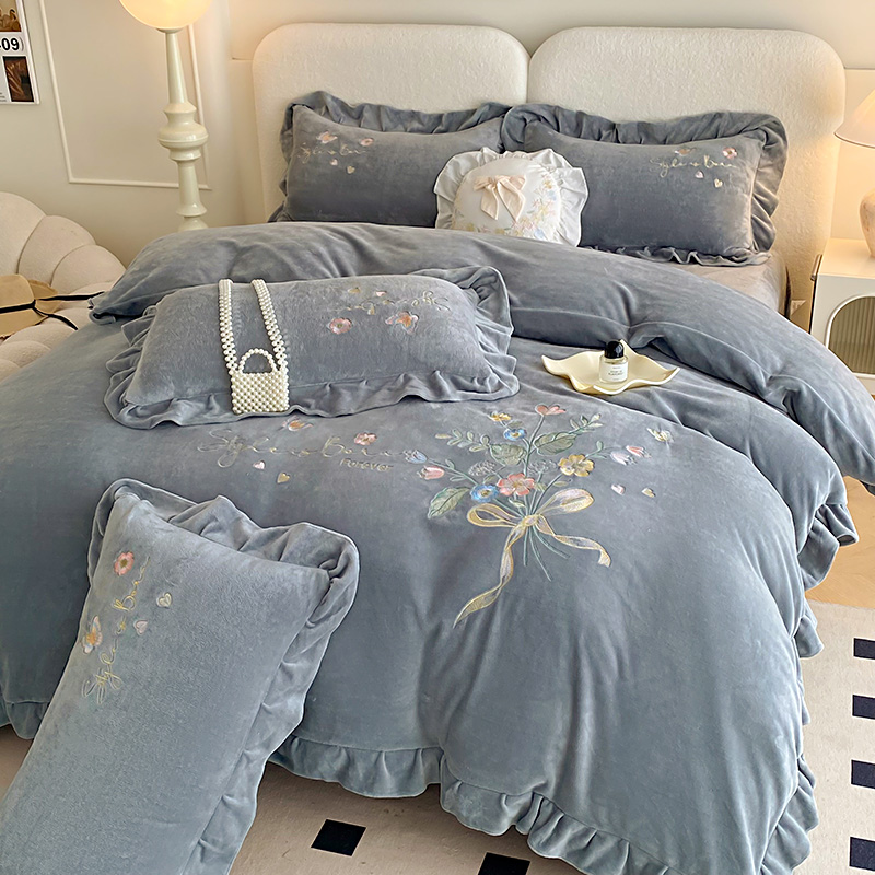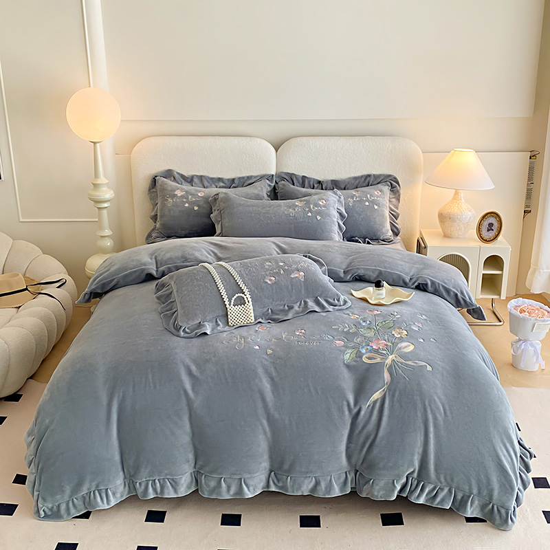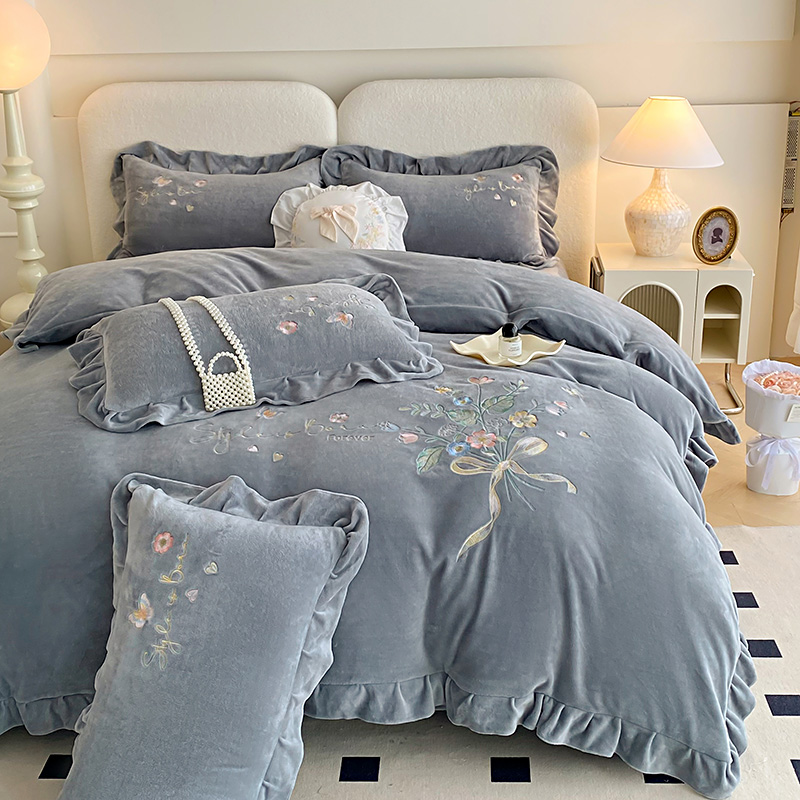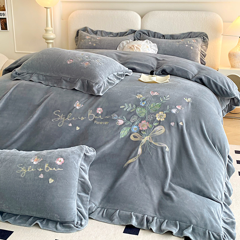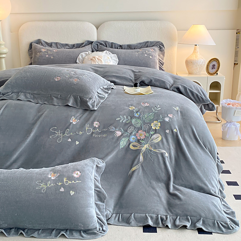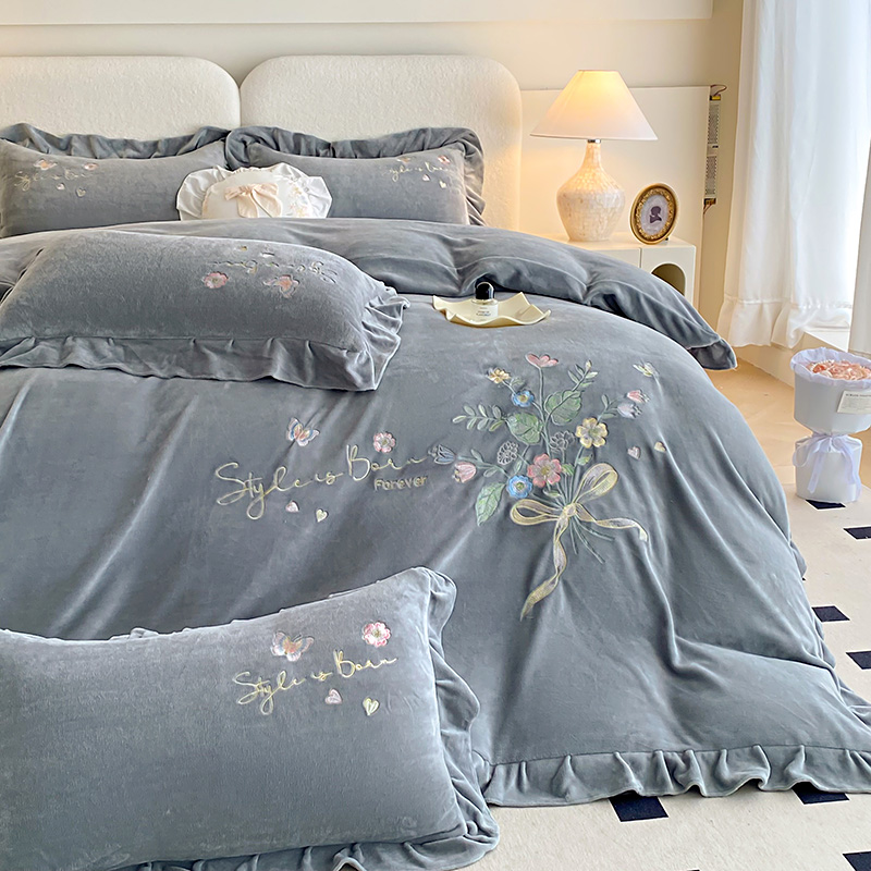 航途席业 2025新款高克重牛奶绒刺绣四件套-浪漫满屋 浪漫满屋-高级灰