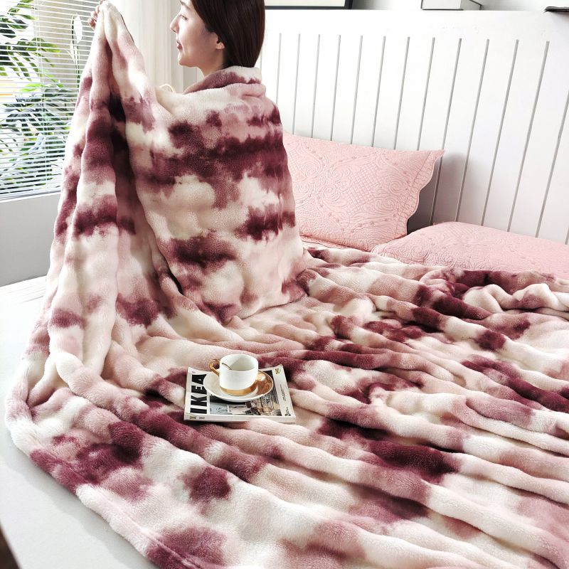 千荨 2024新款跨境印花扎染泡泡绒毛盖毯 酒红