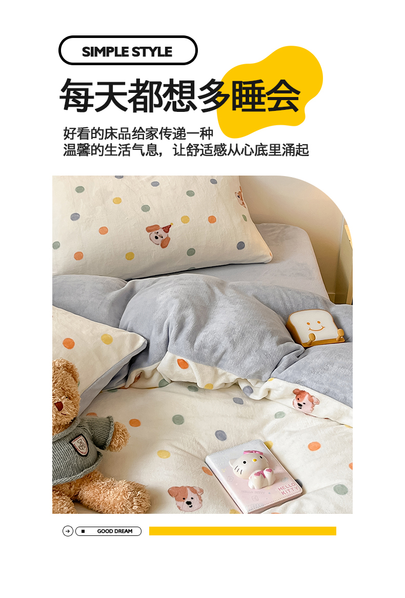 商品名称:2024新款200g加厚防静电牛奶绒小清新四件套 绒-泡泡狗