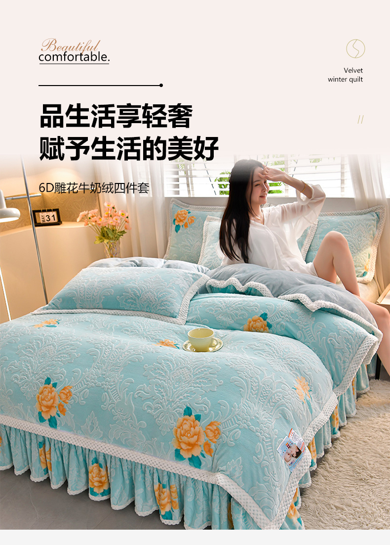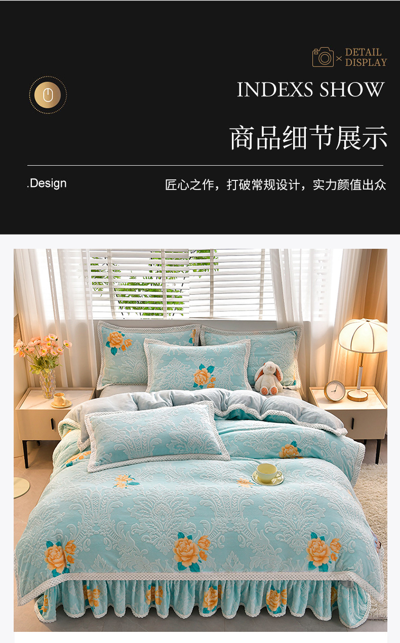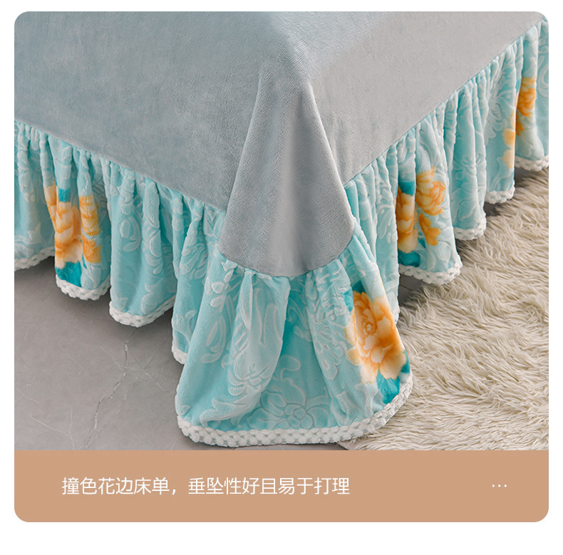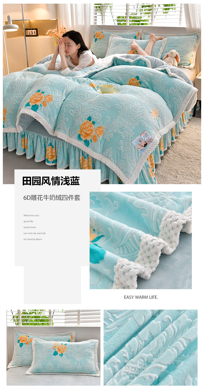 商品名称:妮恒美 2025款9斤欧式5D雕花纯色牛奶绒四件套法莱绒印花床裙 田园风情浅蓝