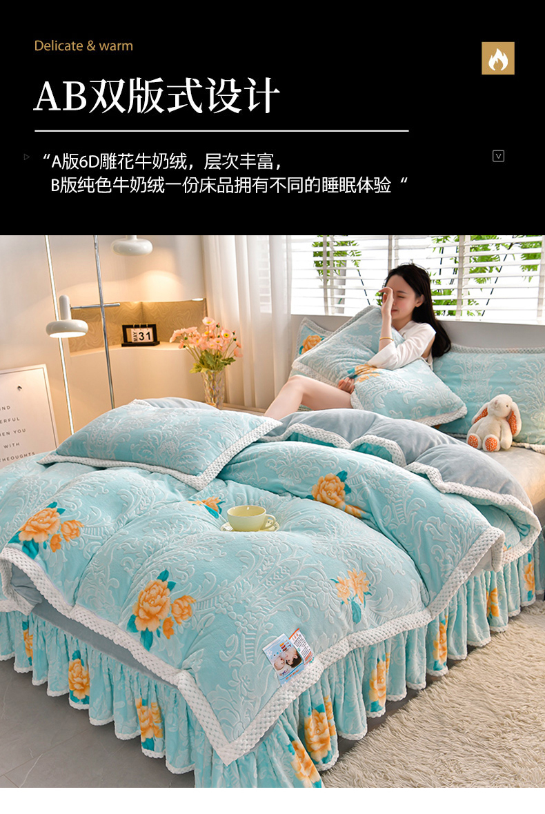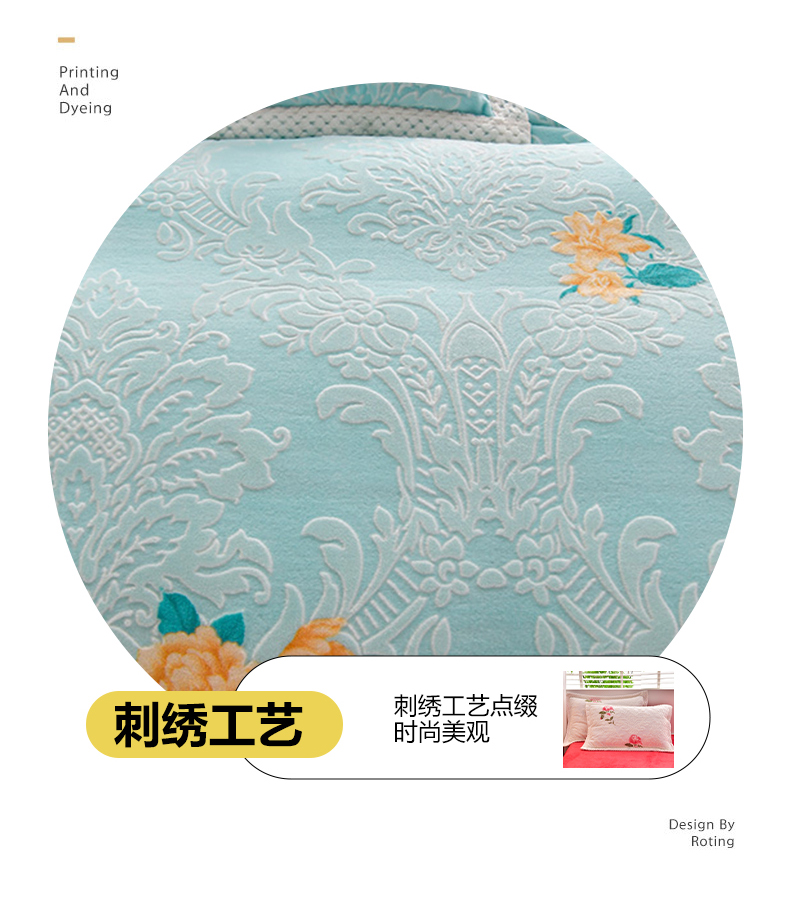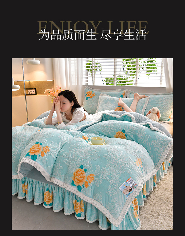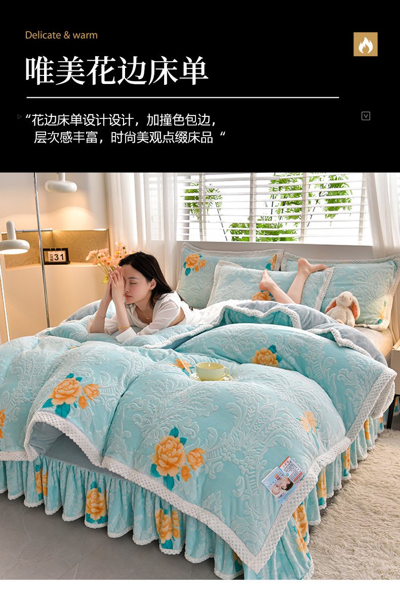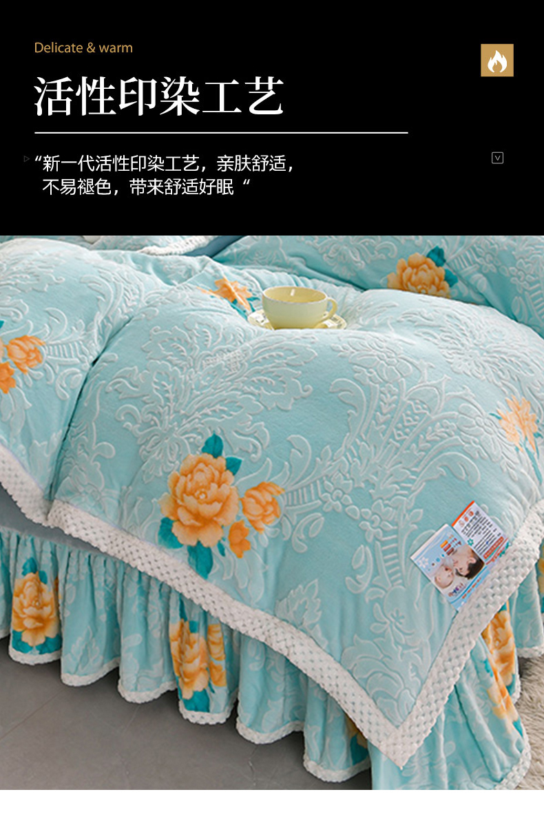 商品名称:妮恒美 2025款9斤欧式5D雕花纯色牛奶绒四件套法莱绒印花床裙 田园风情浅蓝