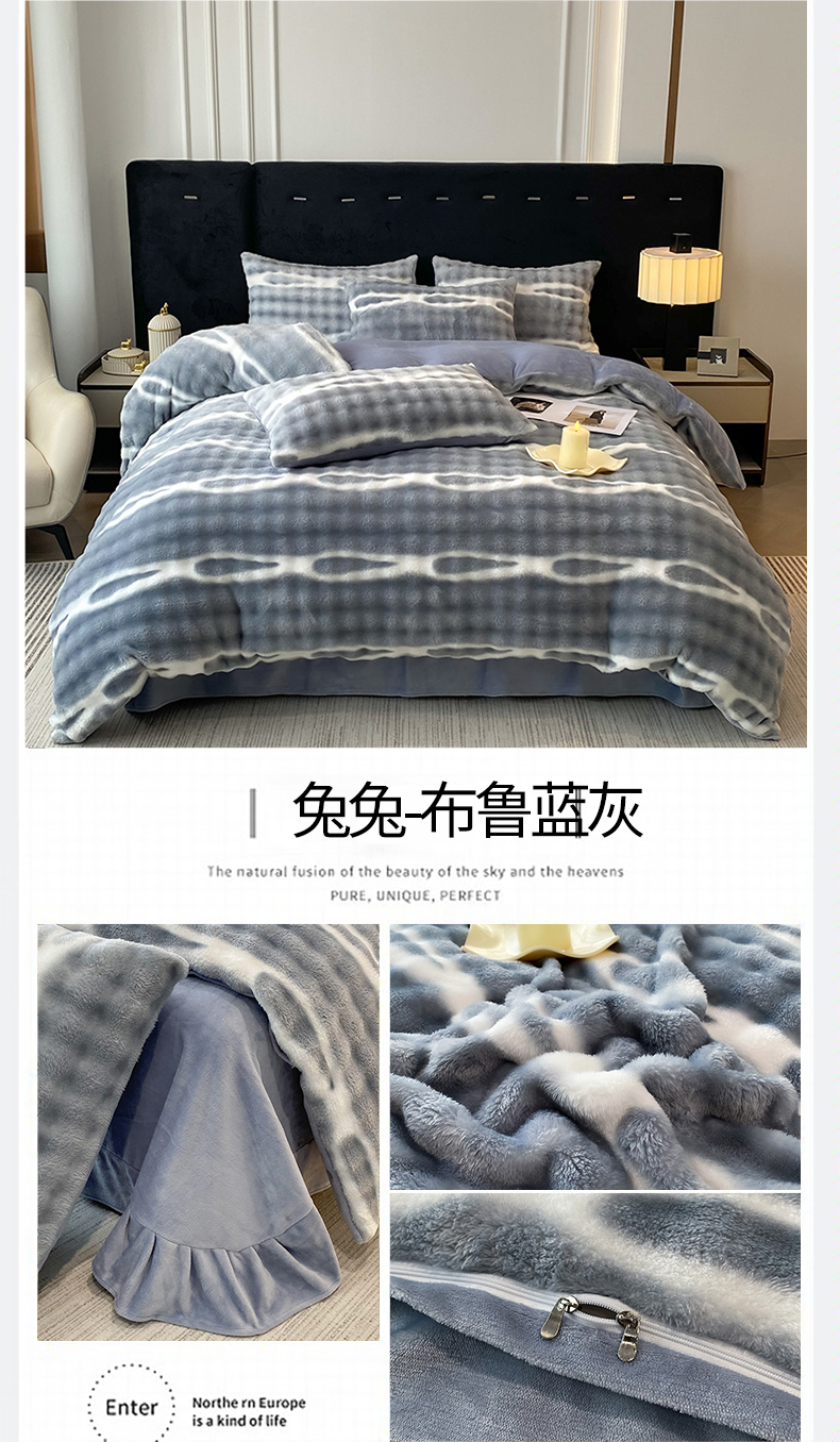 商品名称:妮恒美 2024新款轻奢兔毛泡泡牛奶绒四件套 兔兔-布鲁蓝灰