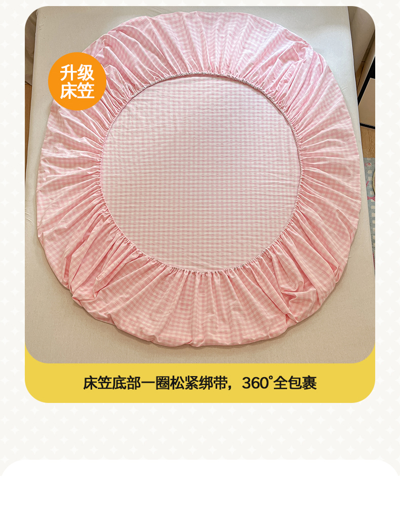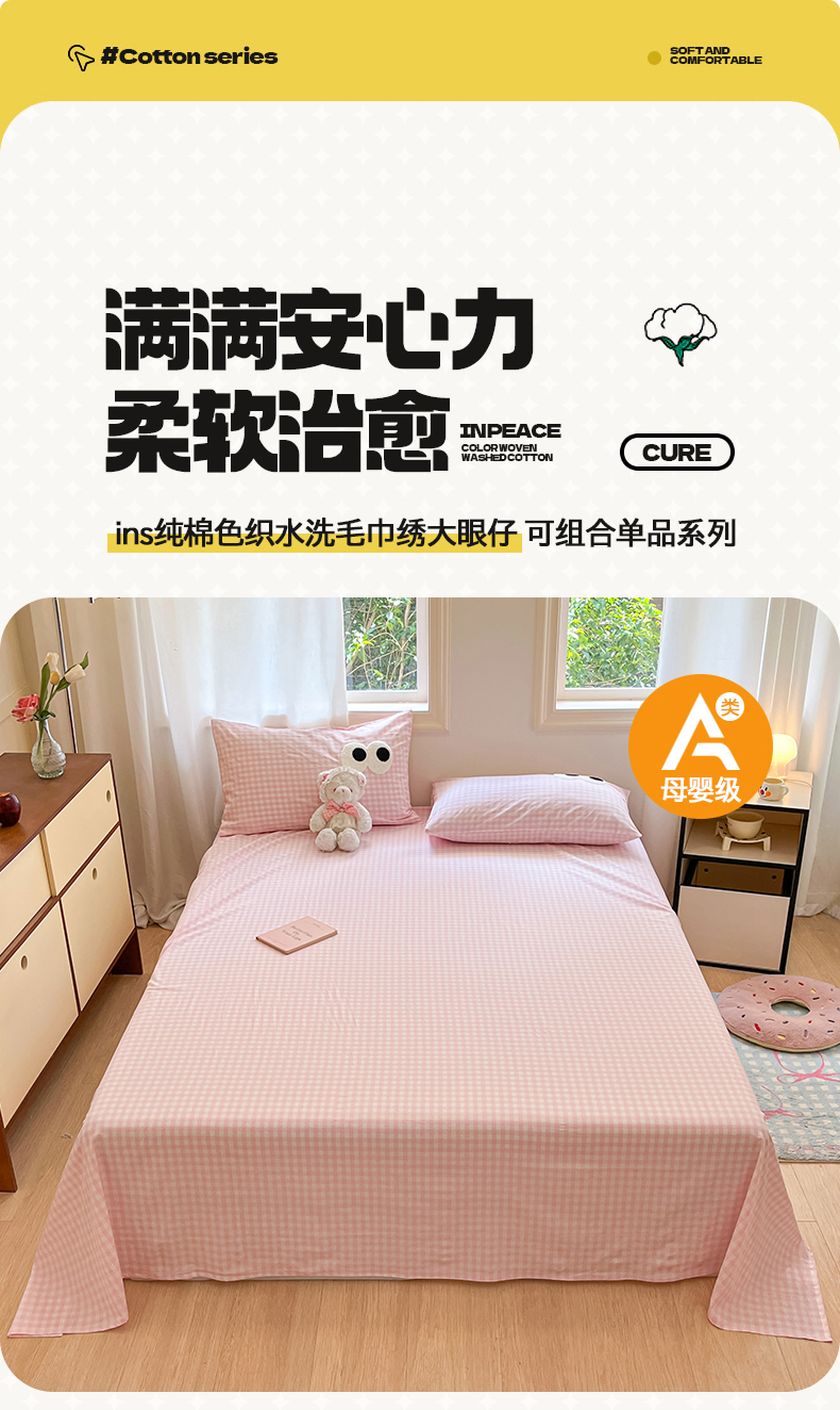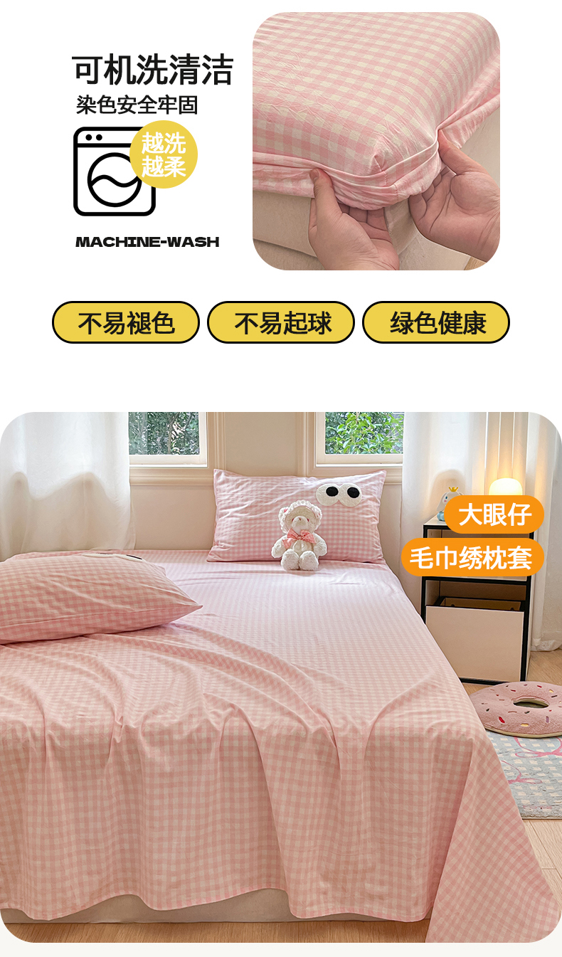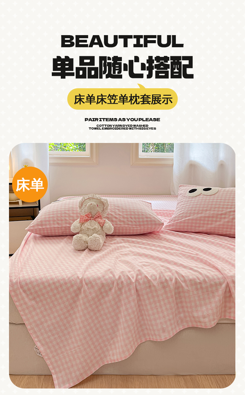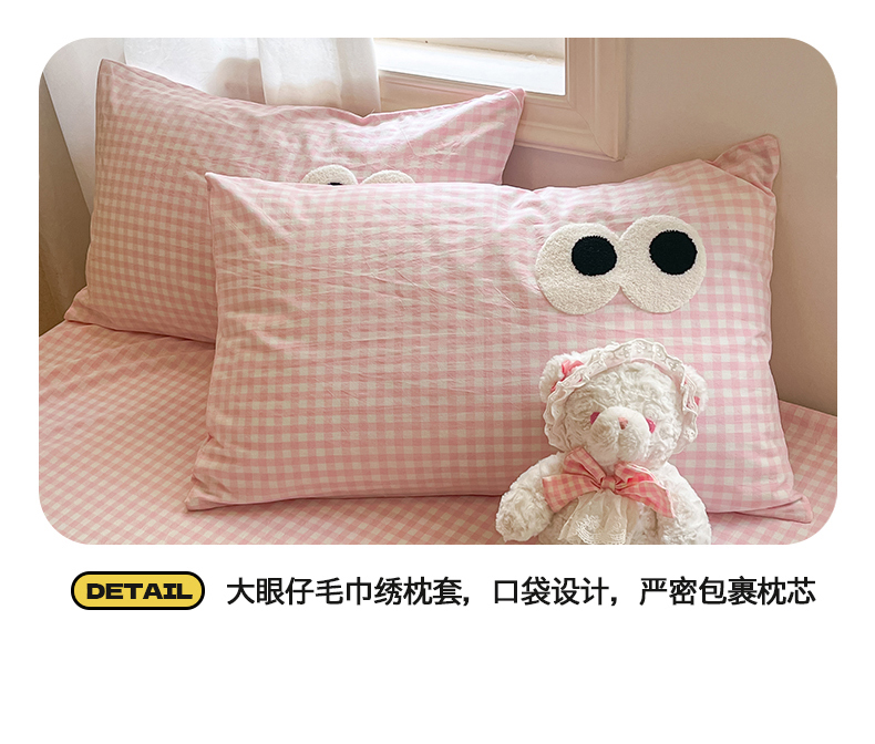 • 91家纺网 家纺一手货源 找家纺 桃子 2024新款ins纯棉色织水洗毛巾绣大眼仔单床笠 色织水洗棉-大眼仔粉格
