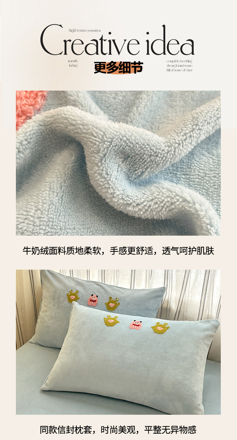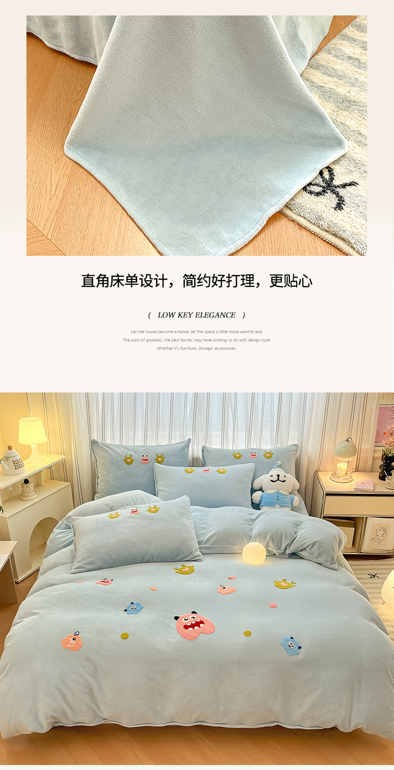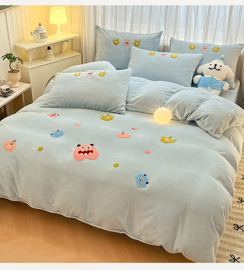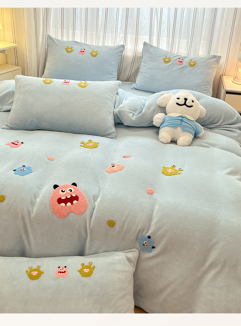商品名称:首尔家纺 2024新款卡通牛奶绒毛巾绣四件套 小怪兽-蓝