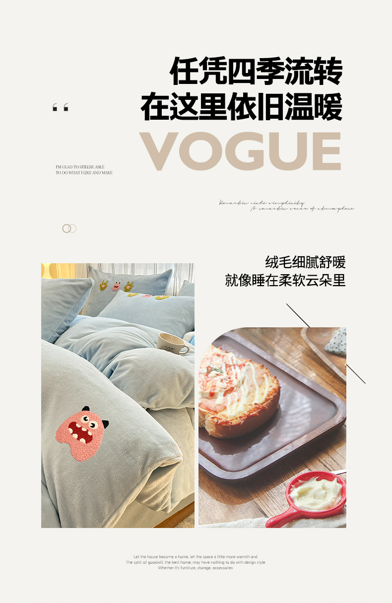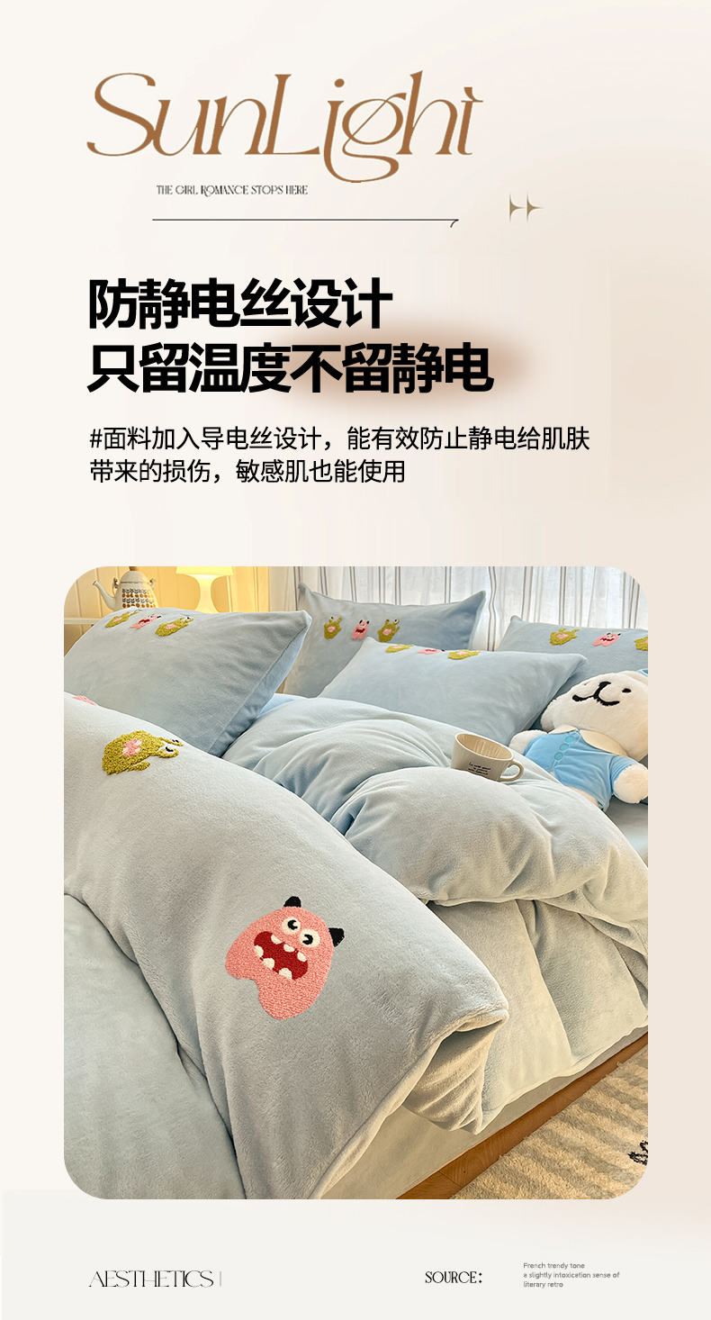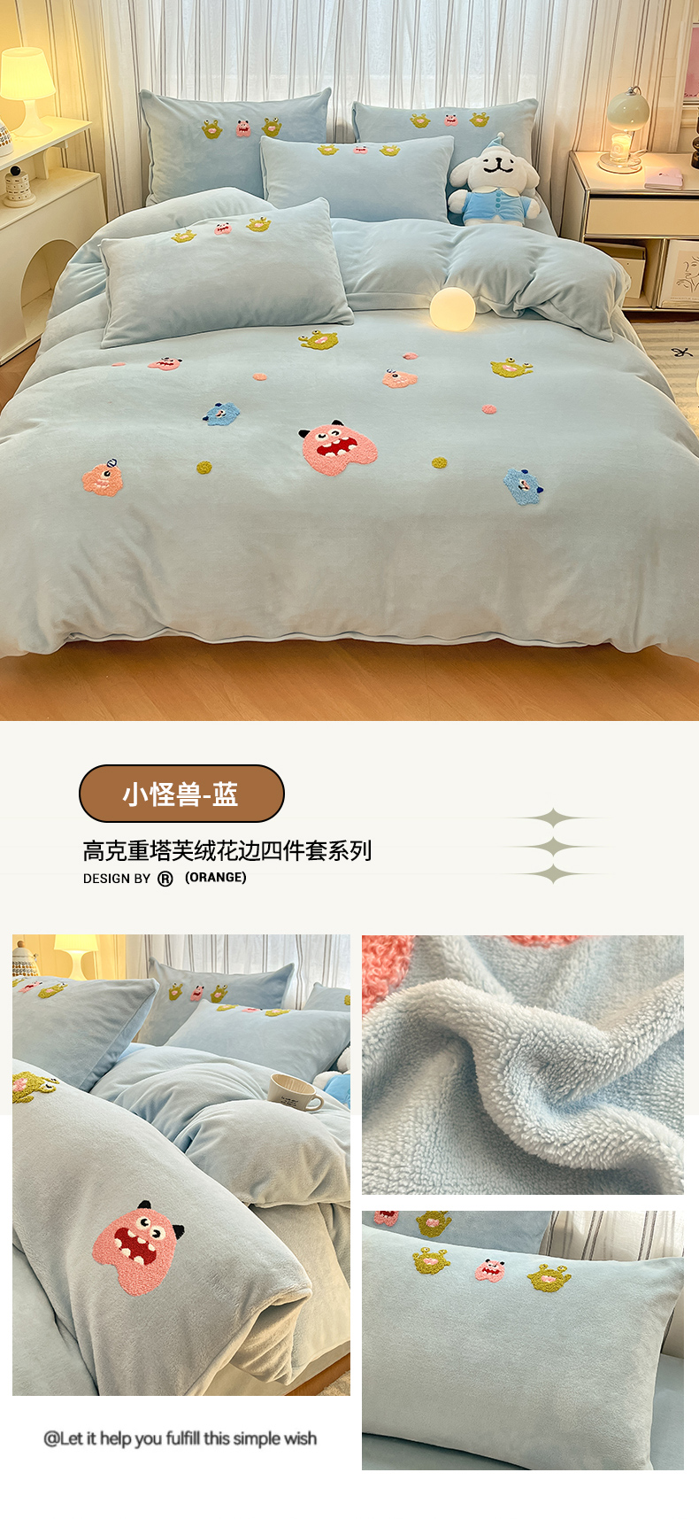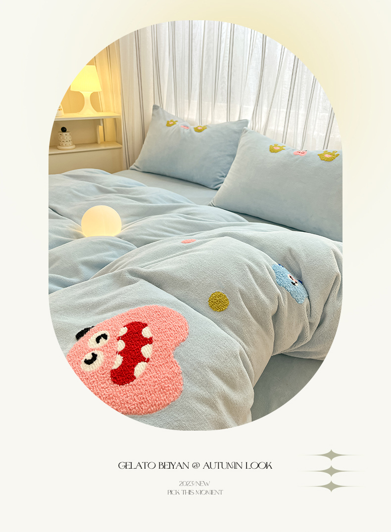 商品名称:首尔家纺 2024新款卡通牛奶绒毛巾绣四件套 小怪兽-蓝