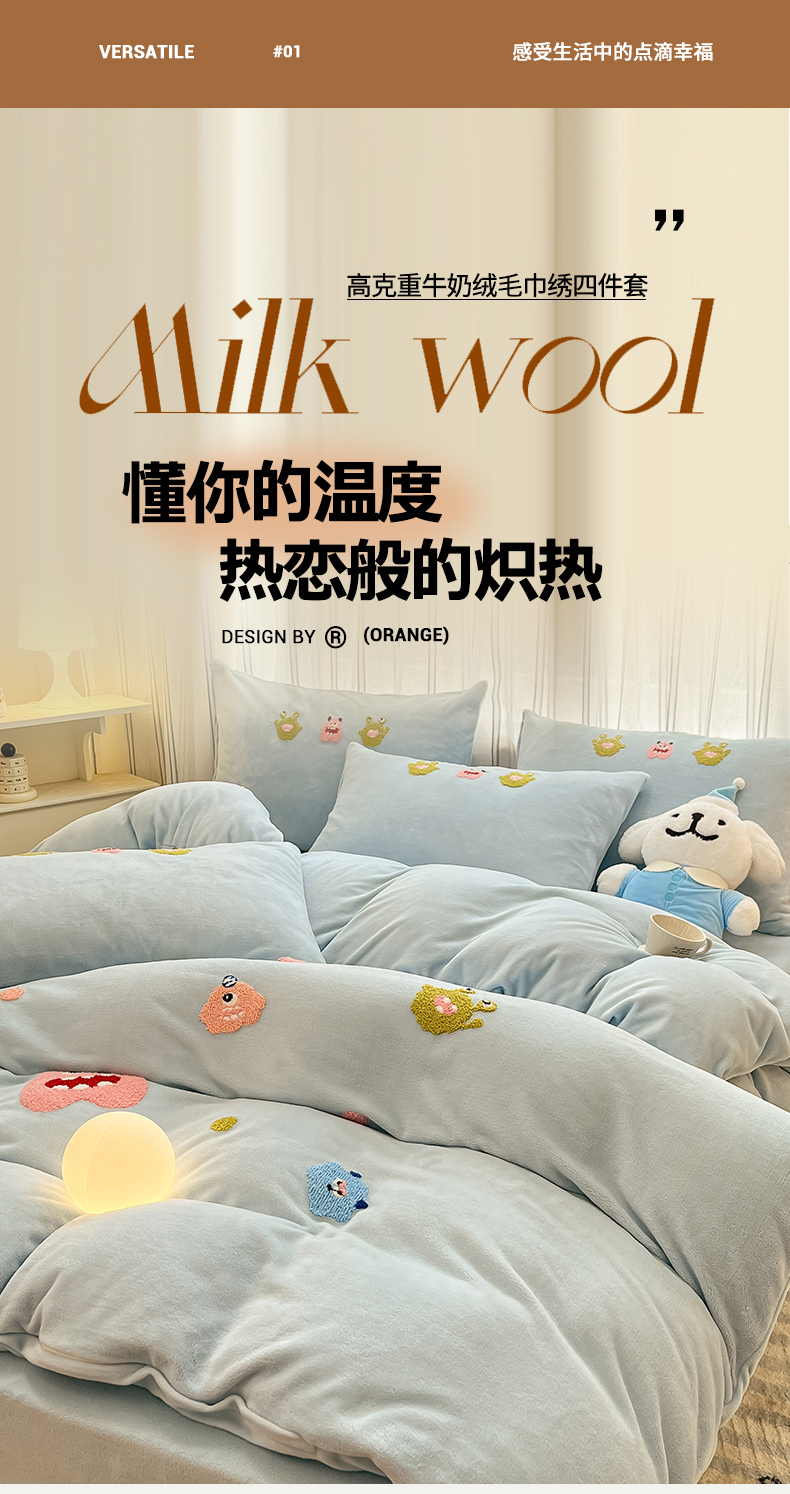 首尔家纺 2024新款卡通牛奶绒毛巾绣四件套 小怪兽-蓝