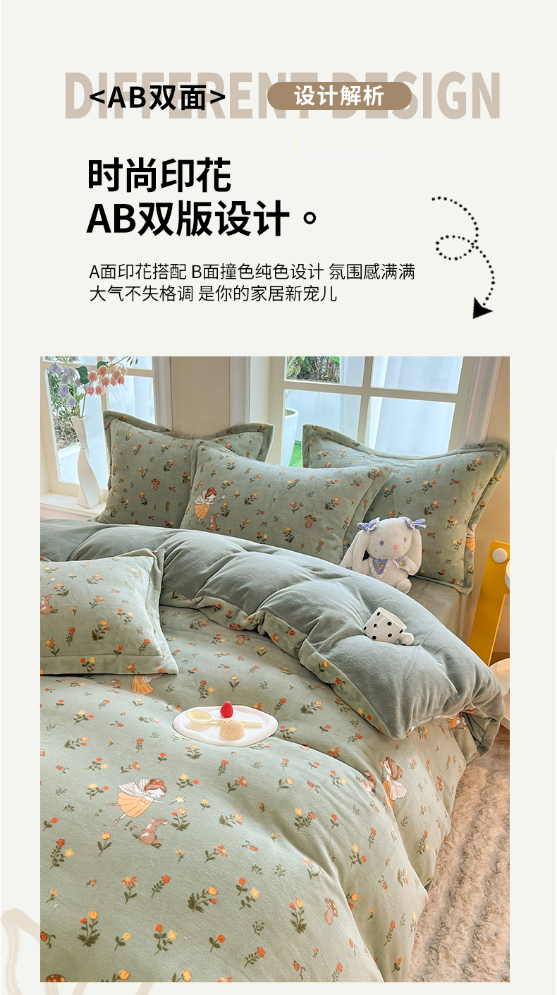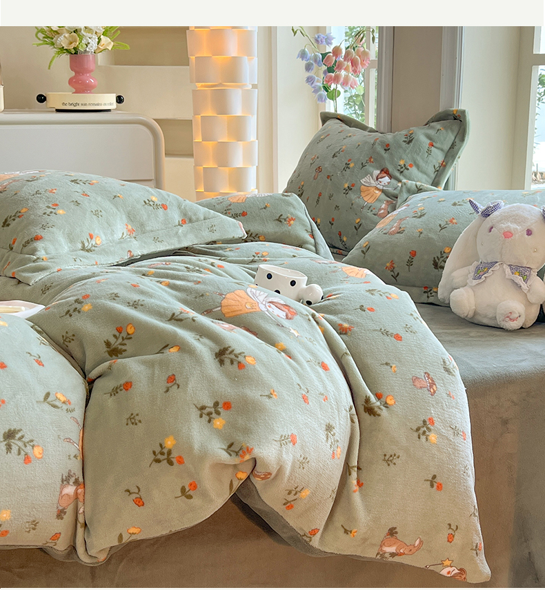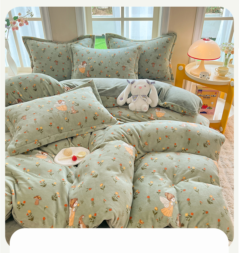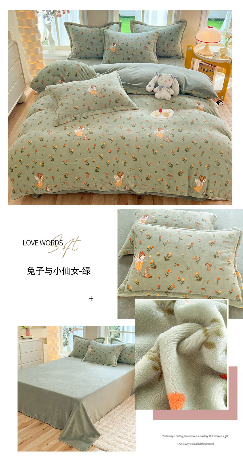 当前位置: 91家纺网 > 商品网购 > 床品套件 > 四件套 > 牛奶绒四件套 > 妖妖家纺 2024新款高克重200克印花牛奶绒四件套 兔子与小仙女-绿