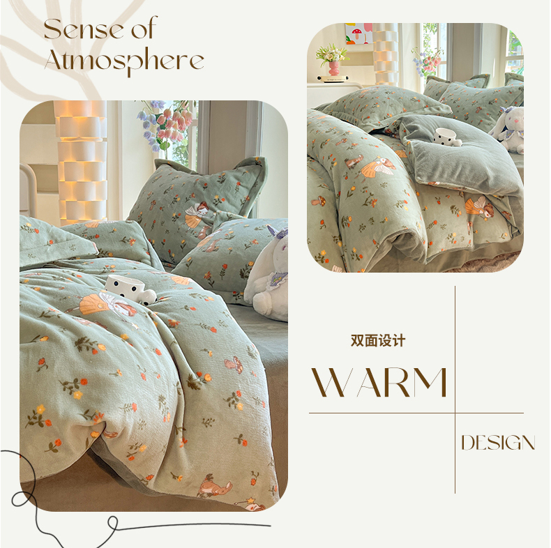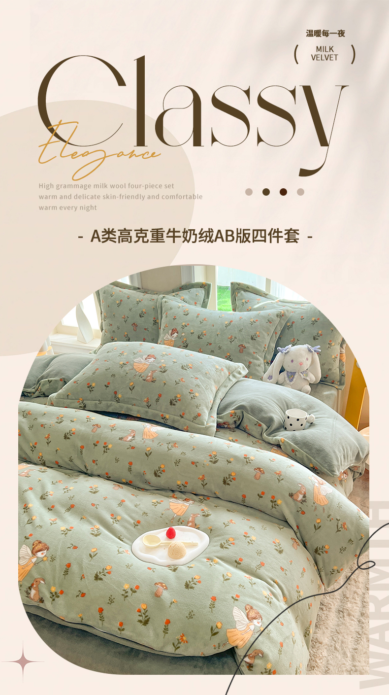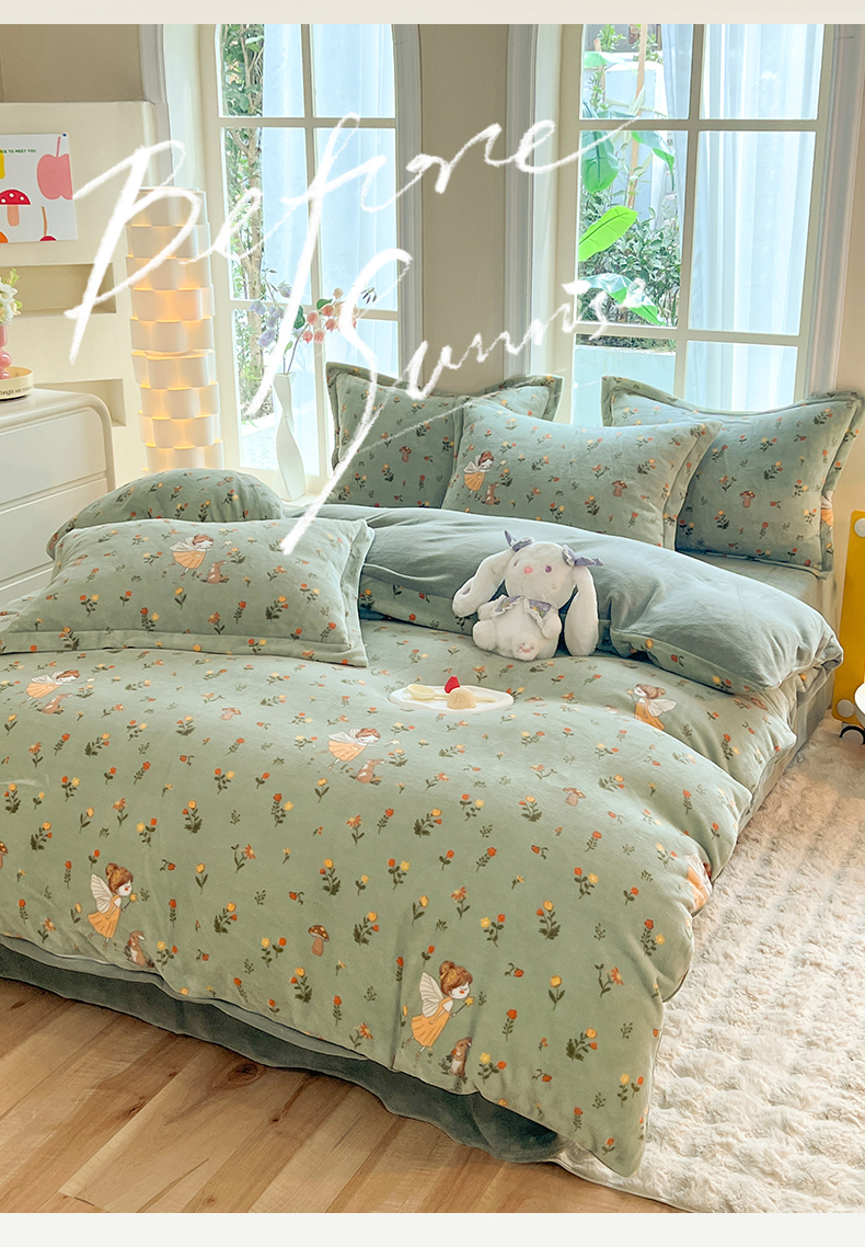 当前位置: 91家纺网 > 商品网购 > 床品套件 > 四件套 > 牛奶绒四件套 > 妖妖家纺 2024新款高克重200克印花牛奶绒四件套 兔子与小仙女-绿