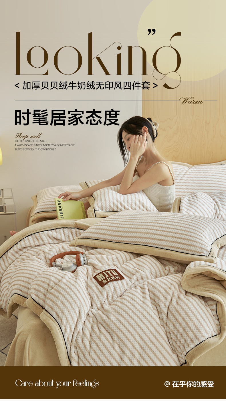 当前位置: 91家纺网 > 商品网购 > 床品套件 > 四件套 > 牛奶绒四件套 > 晨曦家纺 2024新款加厚贝贝绒牛奶绒无印风四件套 贝贝绒-奶咖