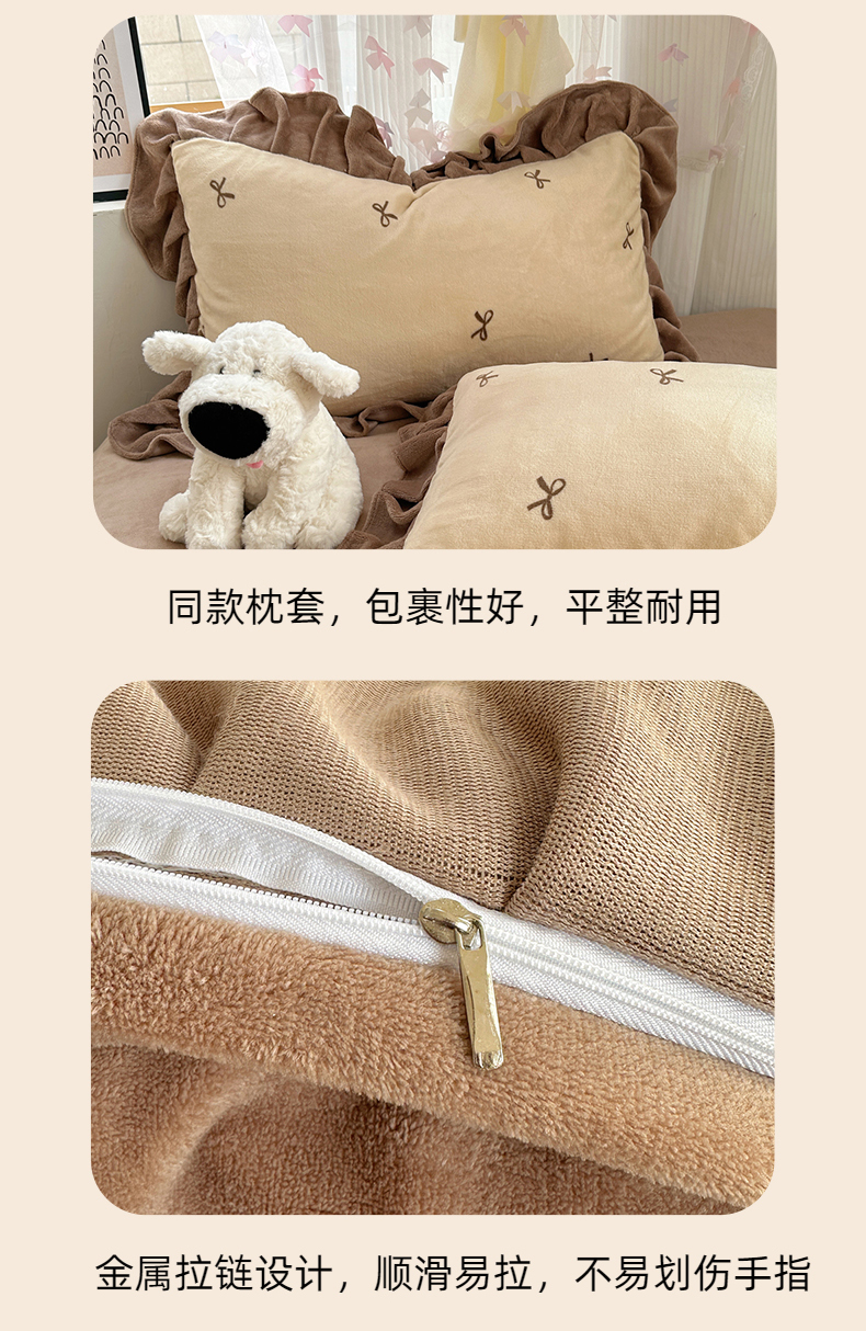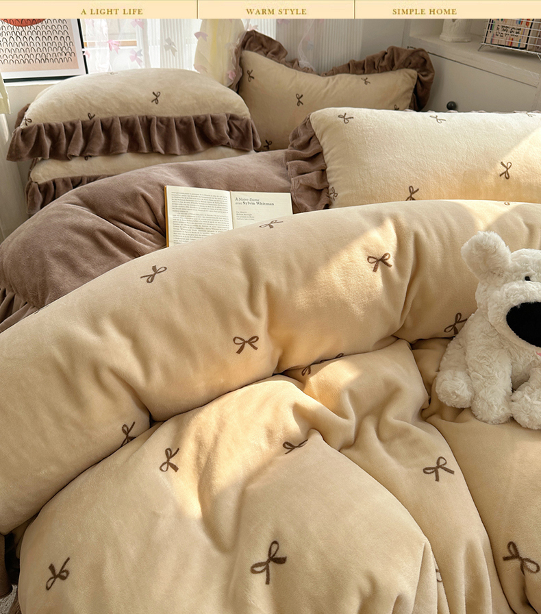 当前位置: 91家纺网 > 商品网购 > 床品套件 > 四件套 > 牛奶绒四件套 > 十里居 2024新款韩版蝴蝶结花边款牛奶绒四件套 蝴蝶结-米咖