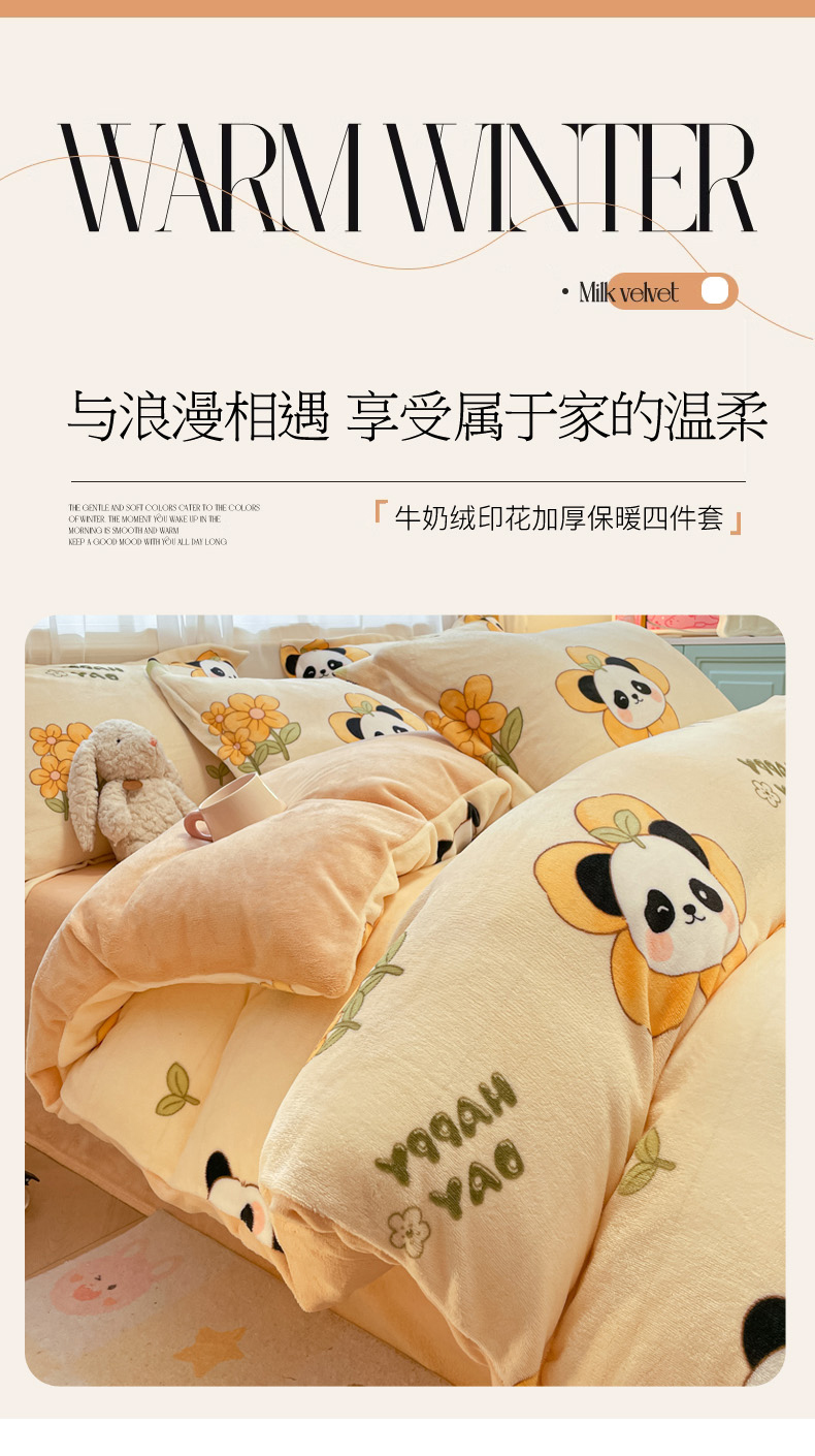 当前位置: 91家纺网 > 商品网购 > 床品套件 > 四件套 > 牛奶绒四件套 > 柒月 2024新款小清新牛奶绒印花加厚保暖四件套 花花熊猫