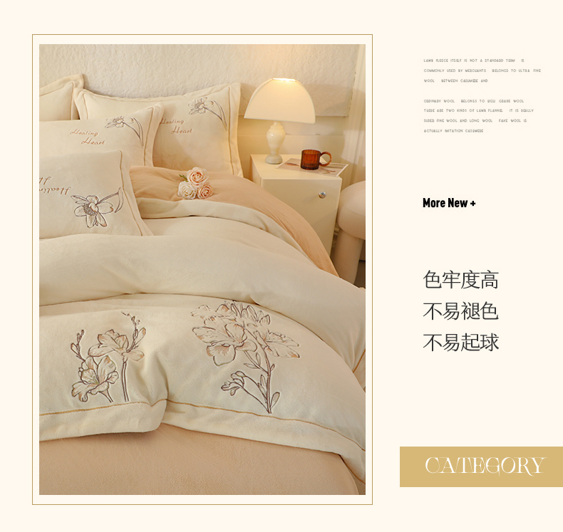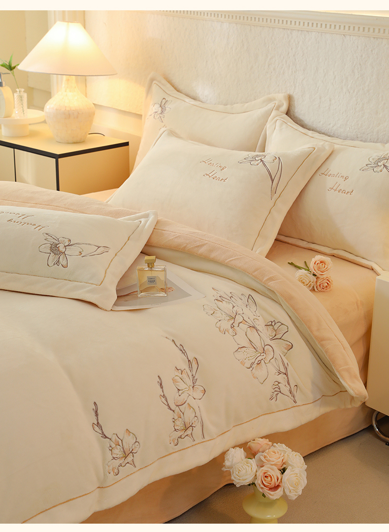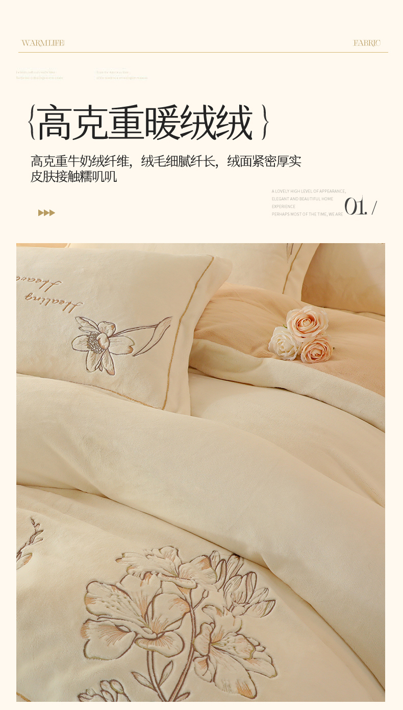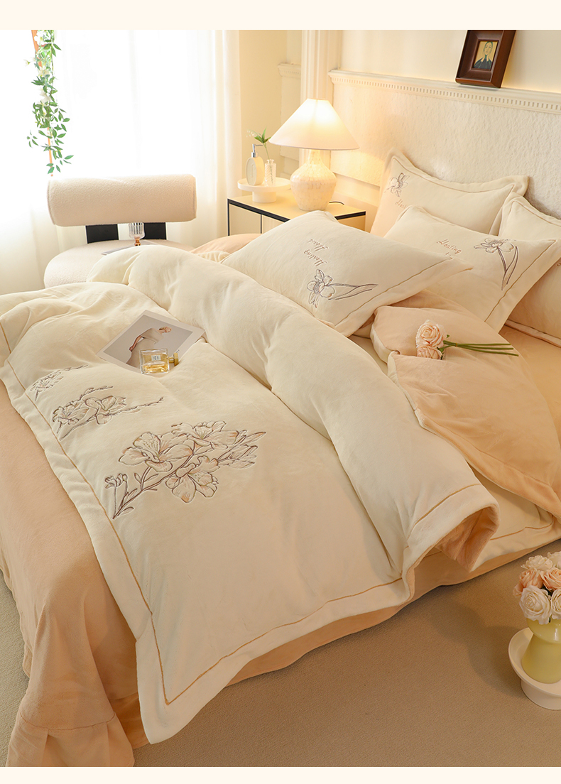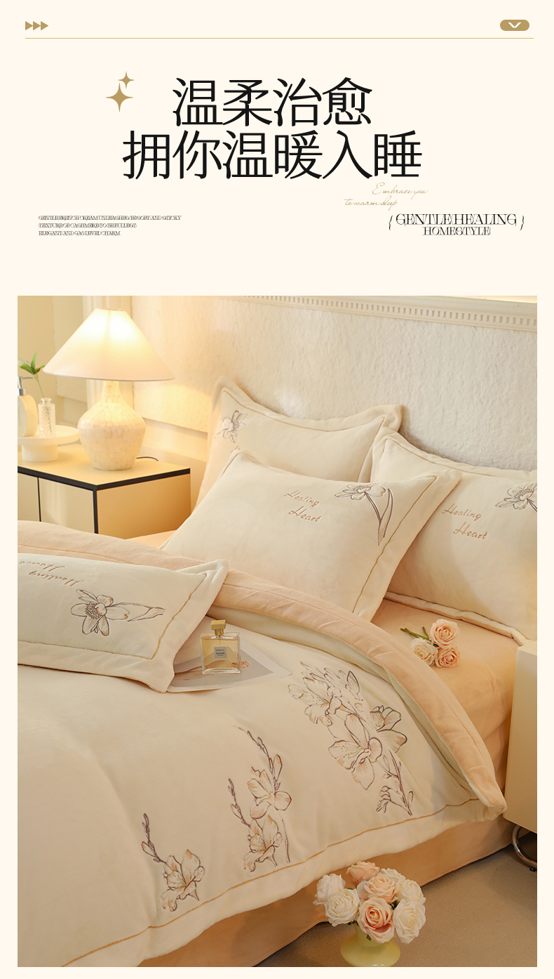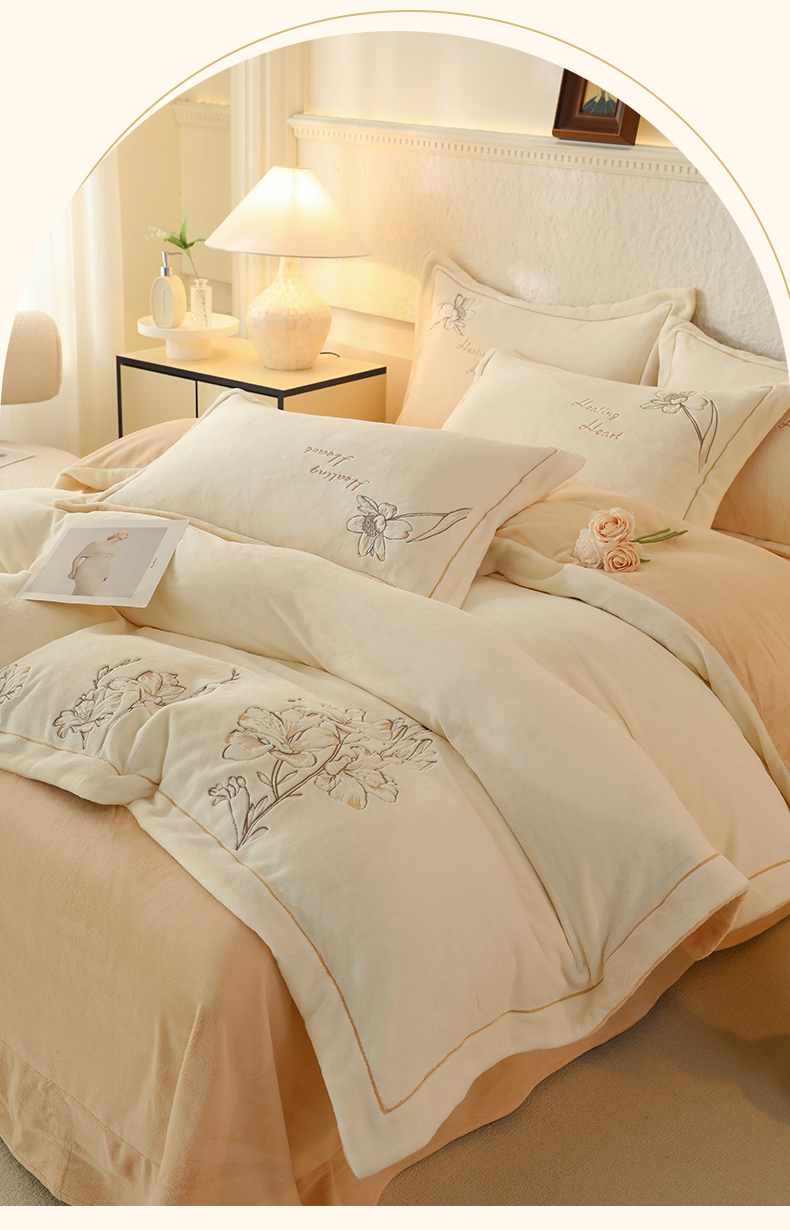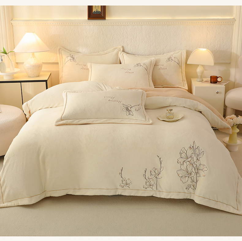 商品名称:暖洋 2024新款暖绒绒全消光牛奶绒四件套纯色牛奶绒刺绣四件套 奶白