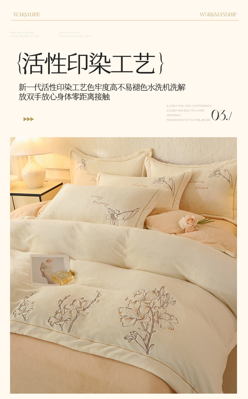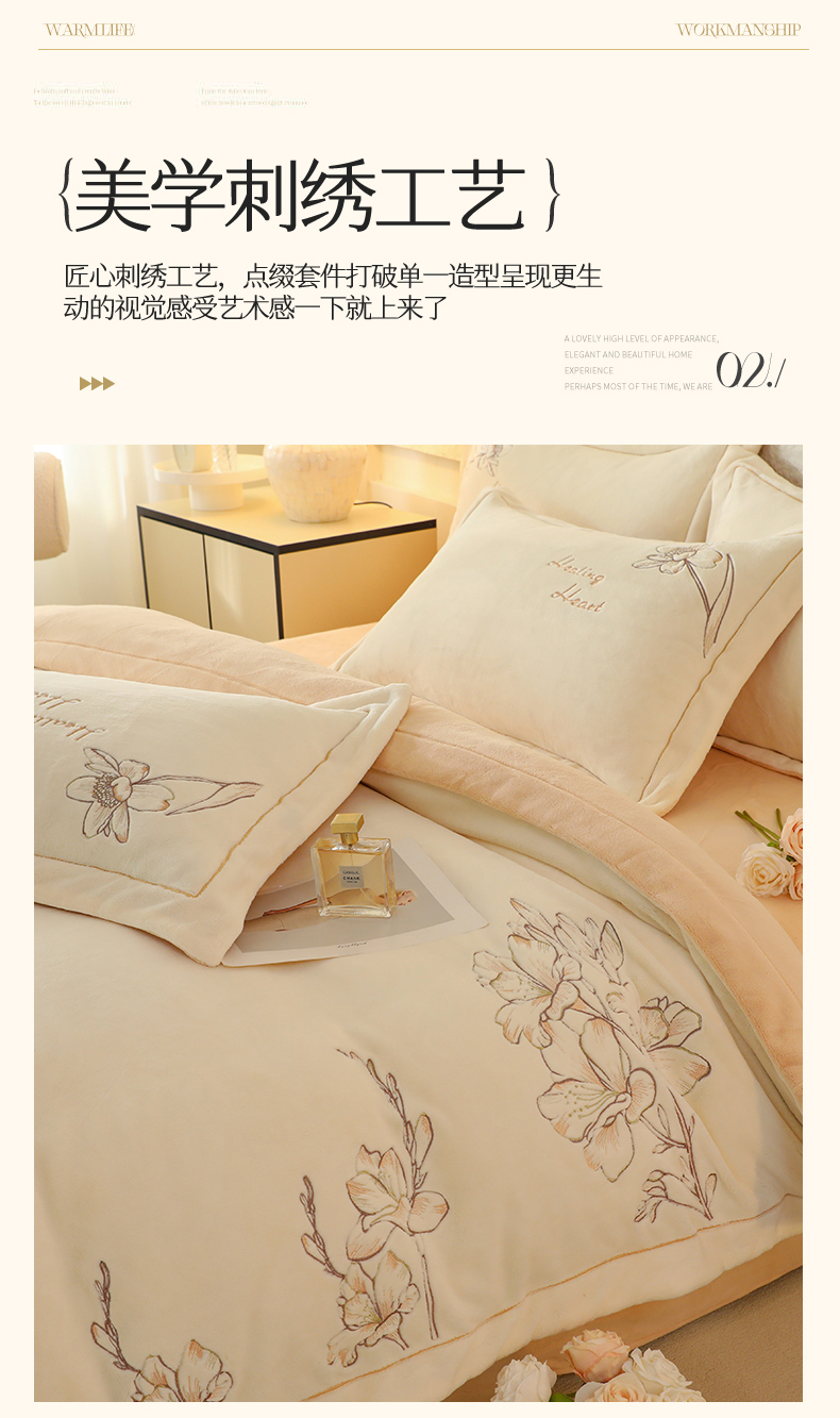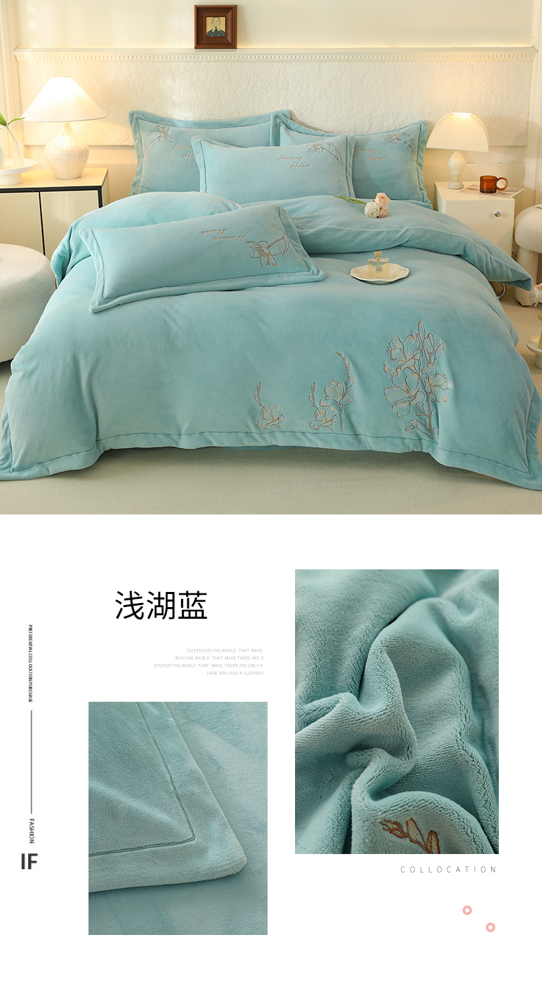 (总)暖洋 2024新款A类暖芙绒纯色刺绣工艺款牛奶绒四件套,爱码橙,湖绿色,蓝灰,藕粉,香槟色,杏仁,银灰色,玉色,富贵,血青,胭脂红