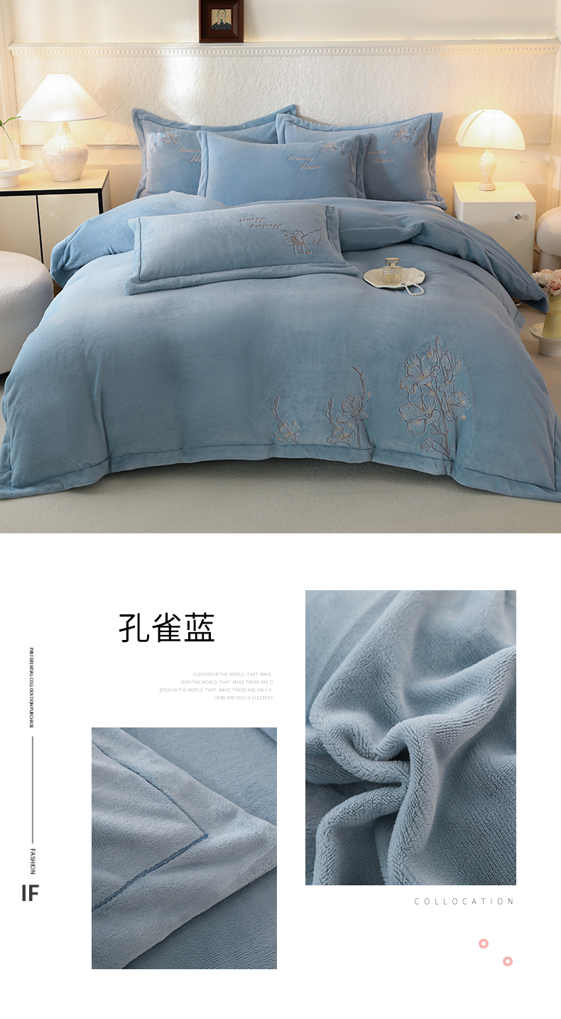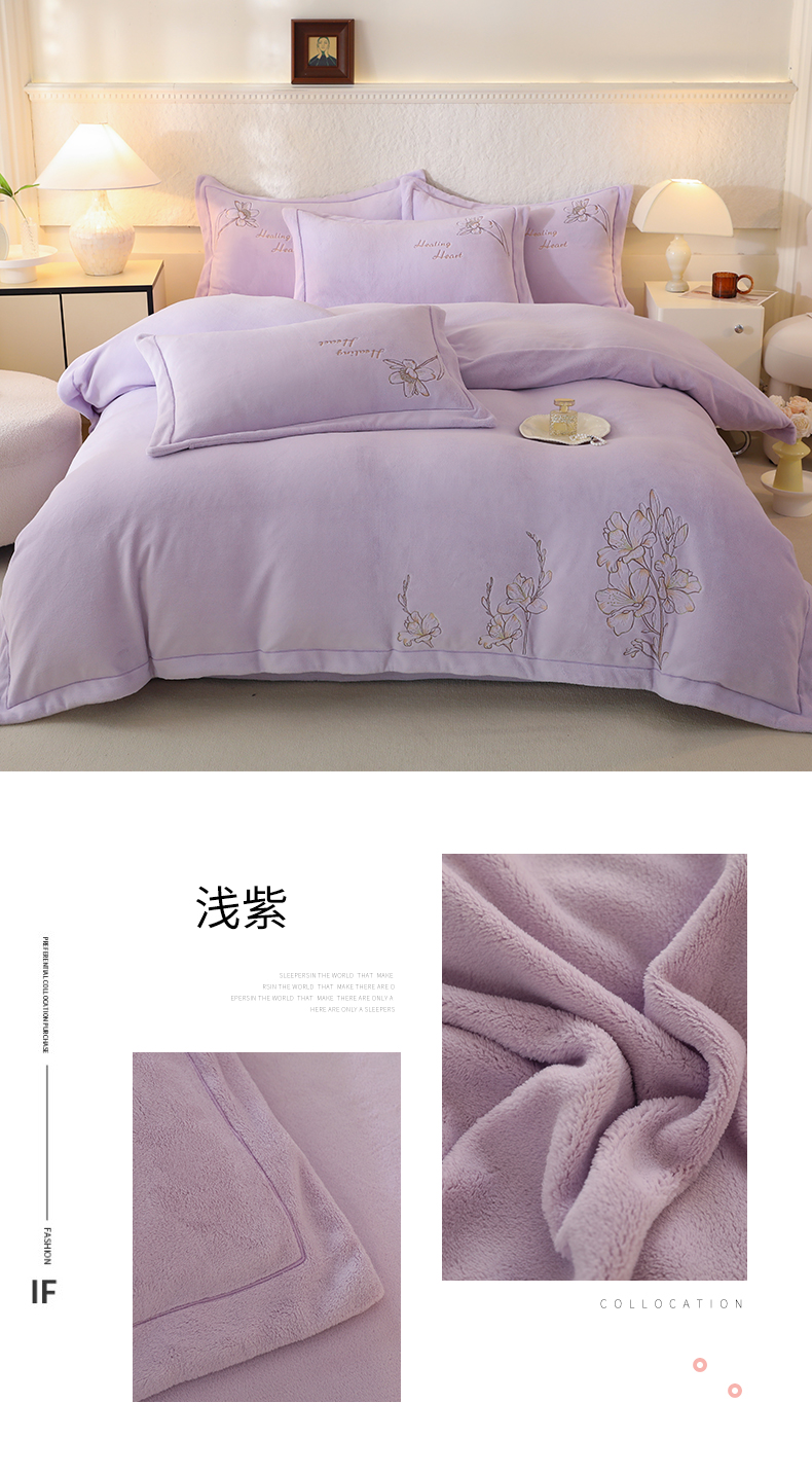 (总)暖洋 2024新款暖绒绒全消光牛奶绒四件套纯色牛奶绒刺绣四件套,豆沙粉,公主粉,孔雀蓝,奶白,浅湖蓝,浅紫,月光灰