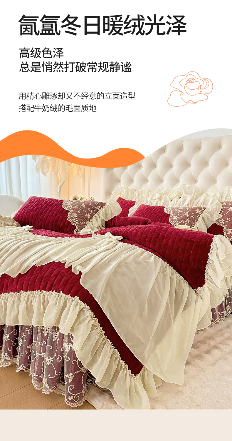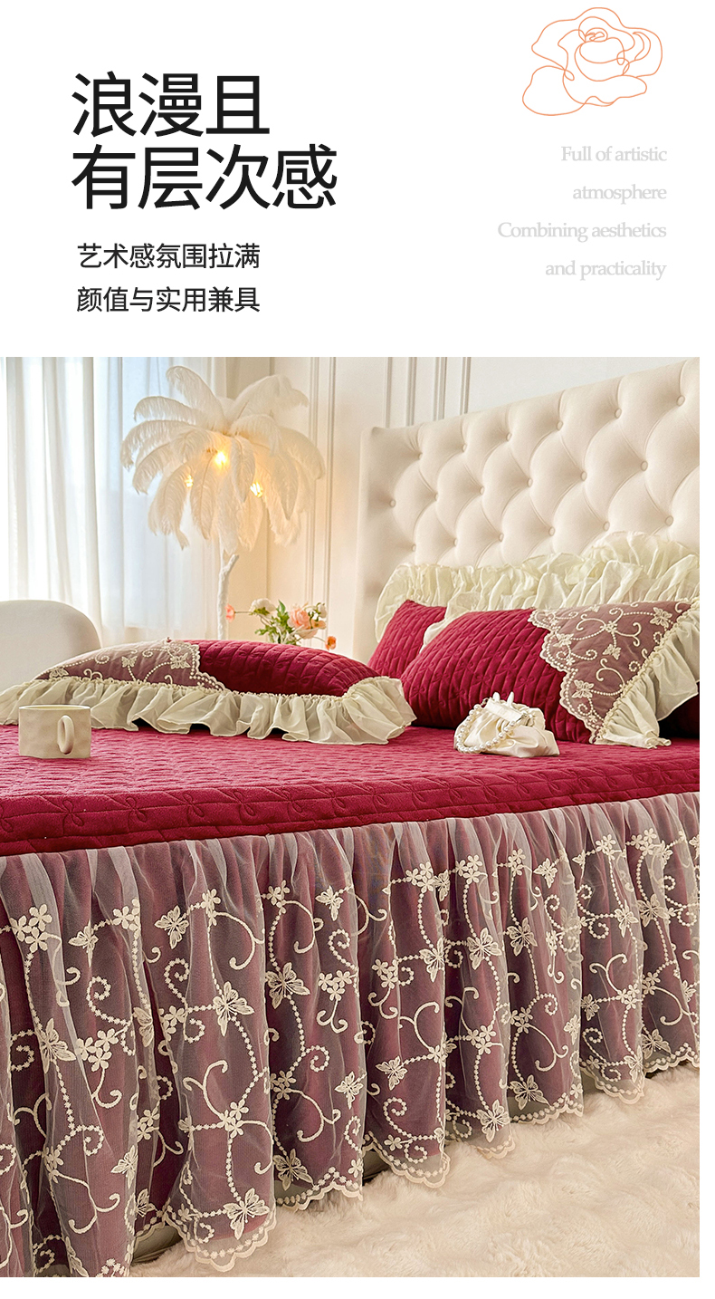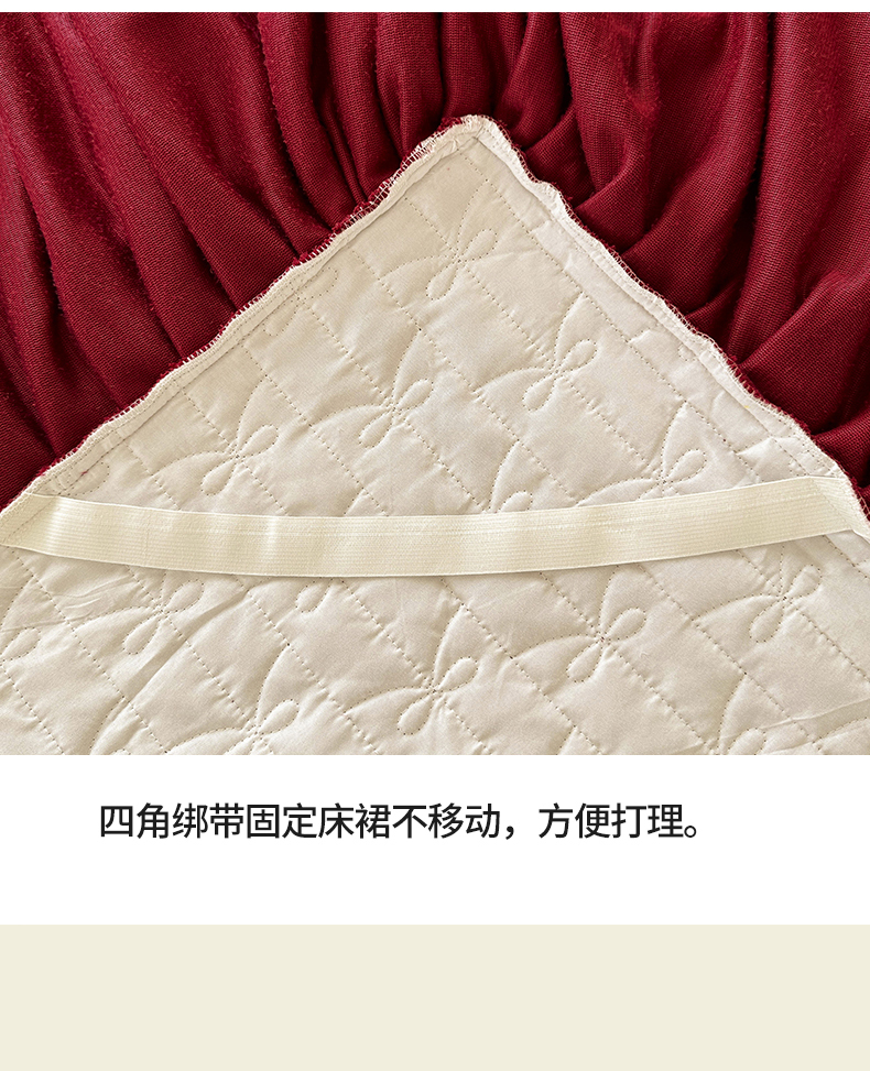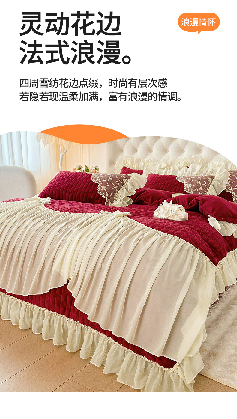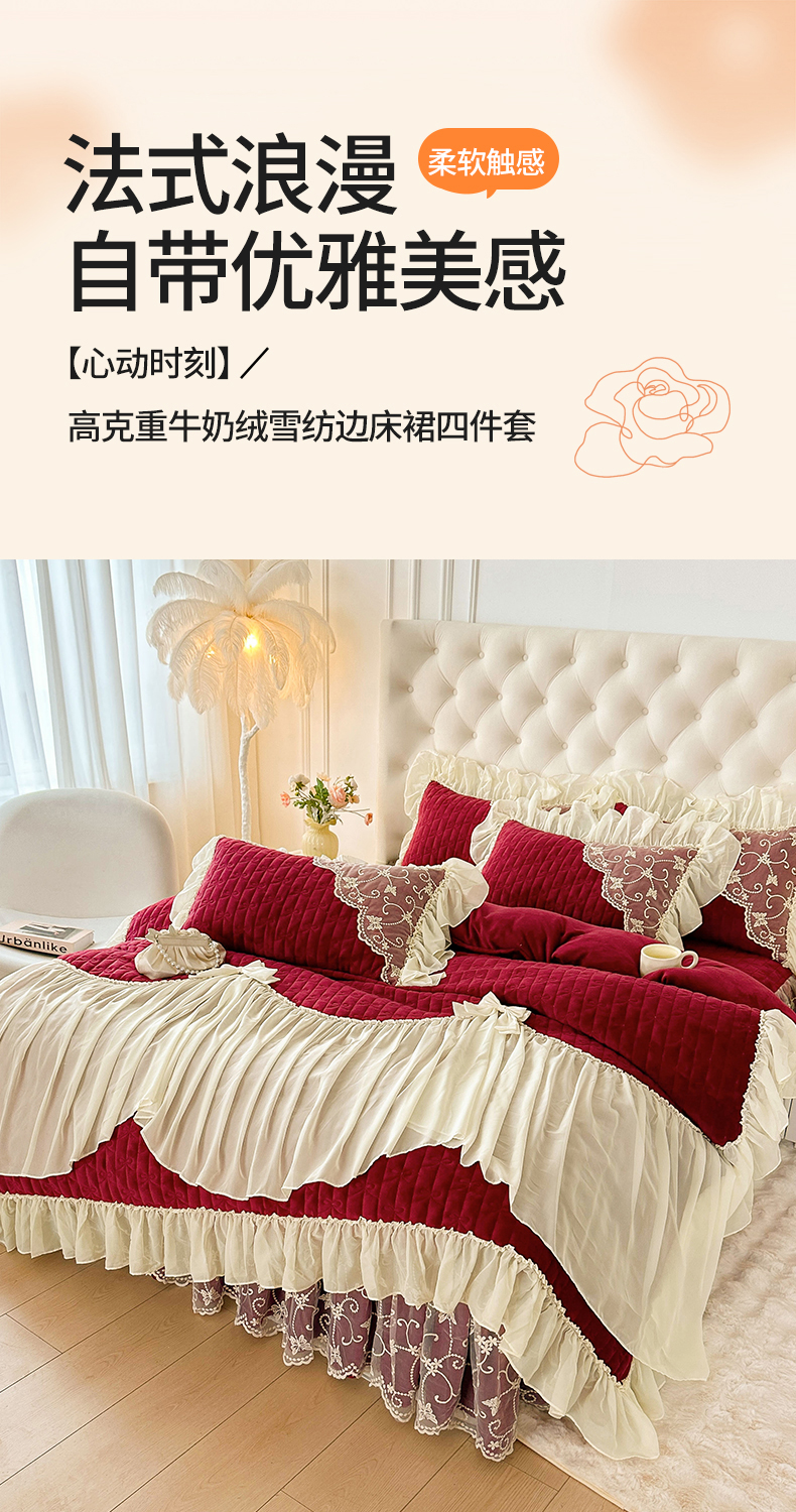 当前位置: 91家纺网 > 商品网购 > 床品套件 > 四件套 > 其它四件套 > 罗艺轩 2024新款高克重牛奶雪纺边床裙四件套-羽蝶 酒红