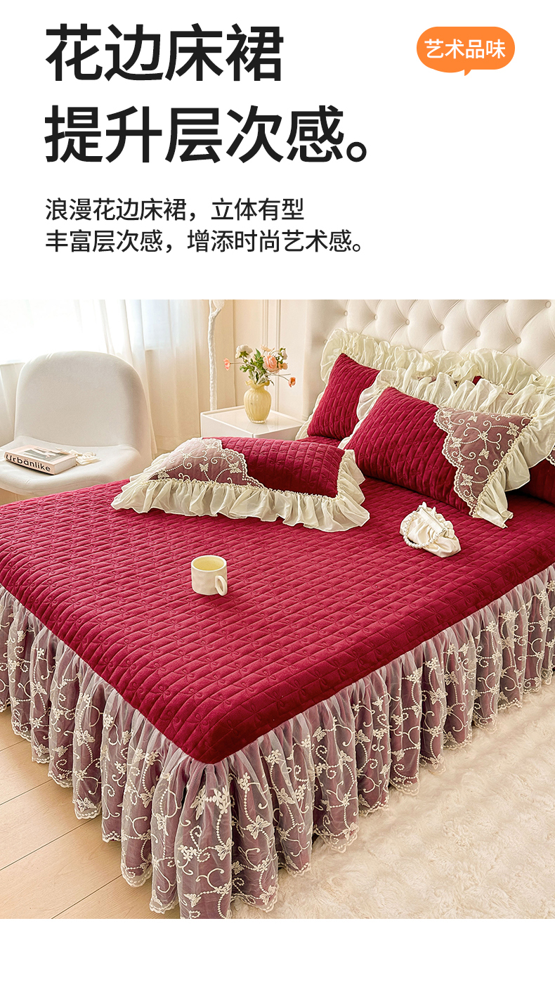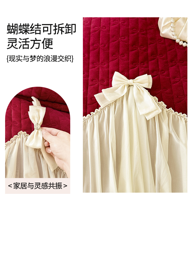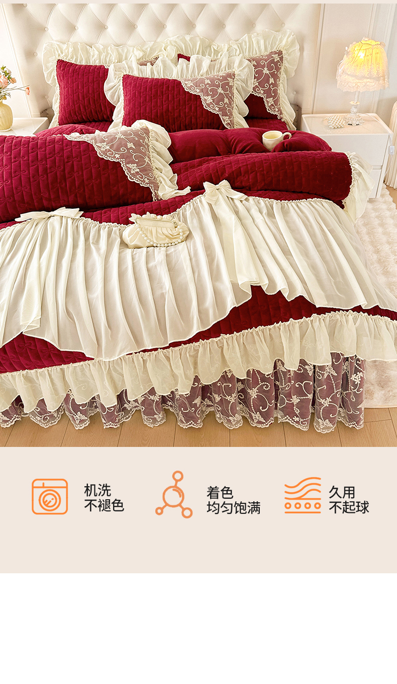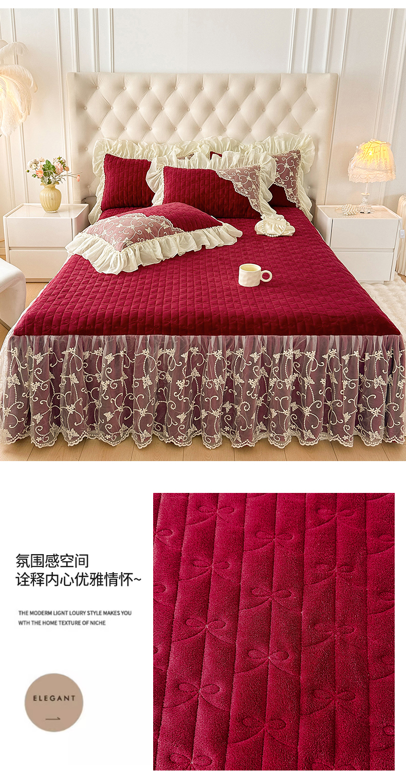 当前位置: 91家纺网 > 商品网购 > 床品套件 > 四件套 > 其它四件套 > 罗艺轩 2024新款高克重牛奶雪纺边床裙四件套-羽蝶 酒红