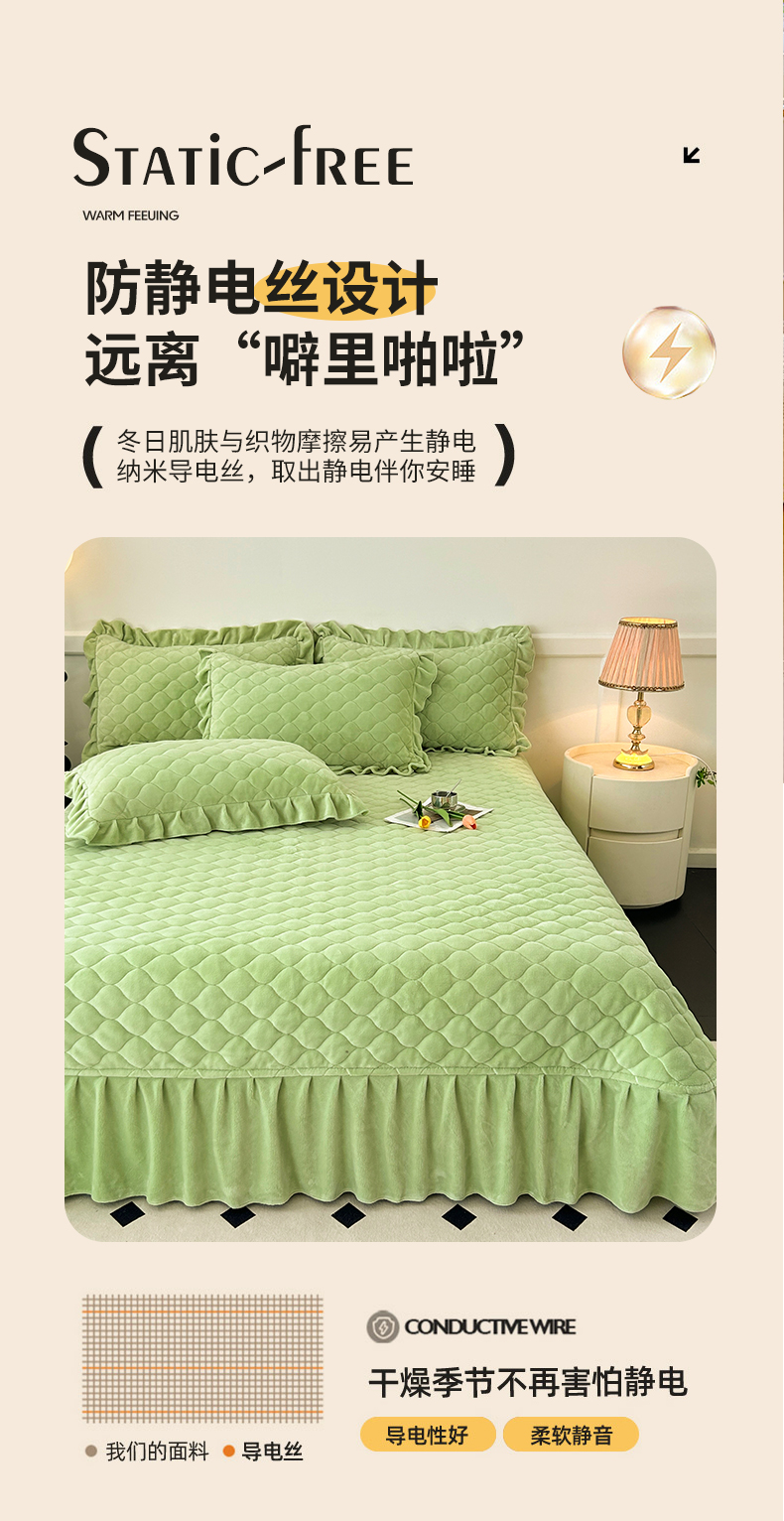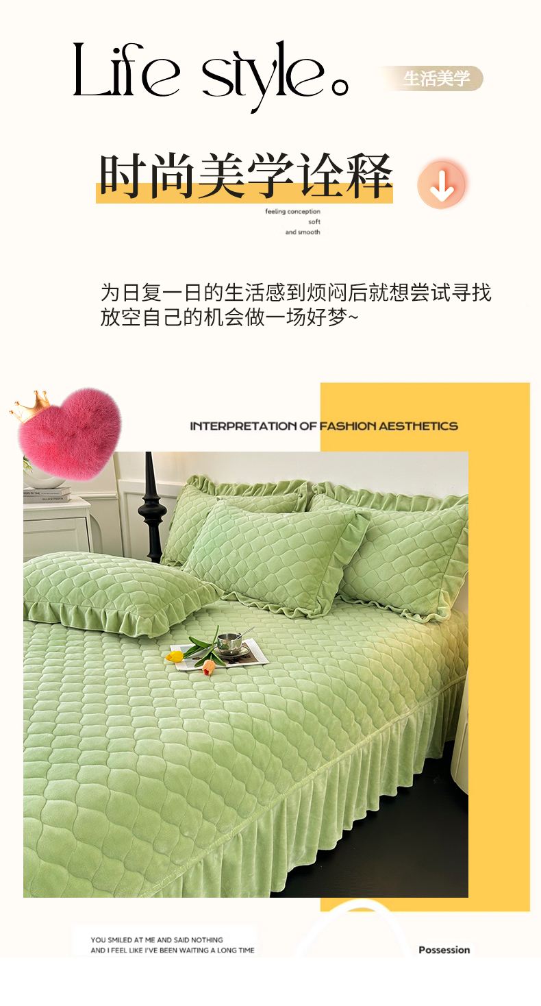 (总)屹成家纺2025新款水晶绒夹棉绗缝蕾丝床裙三件套(塞纳河畔)床裙单件起售价不低于105元,大红,豆沙,翡翠绿,粉玉,橄榄绿,蔚蓝,银灰