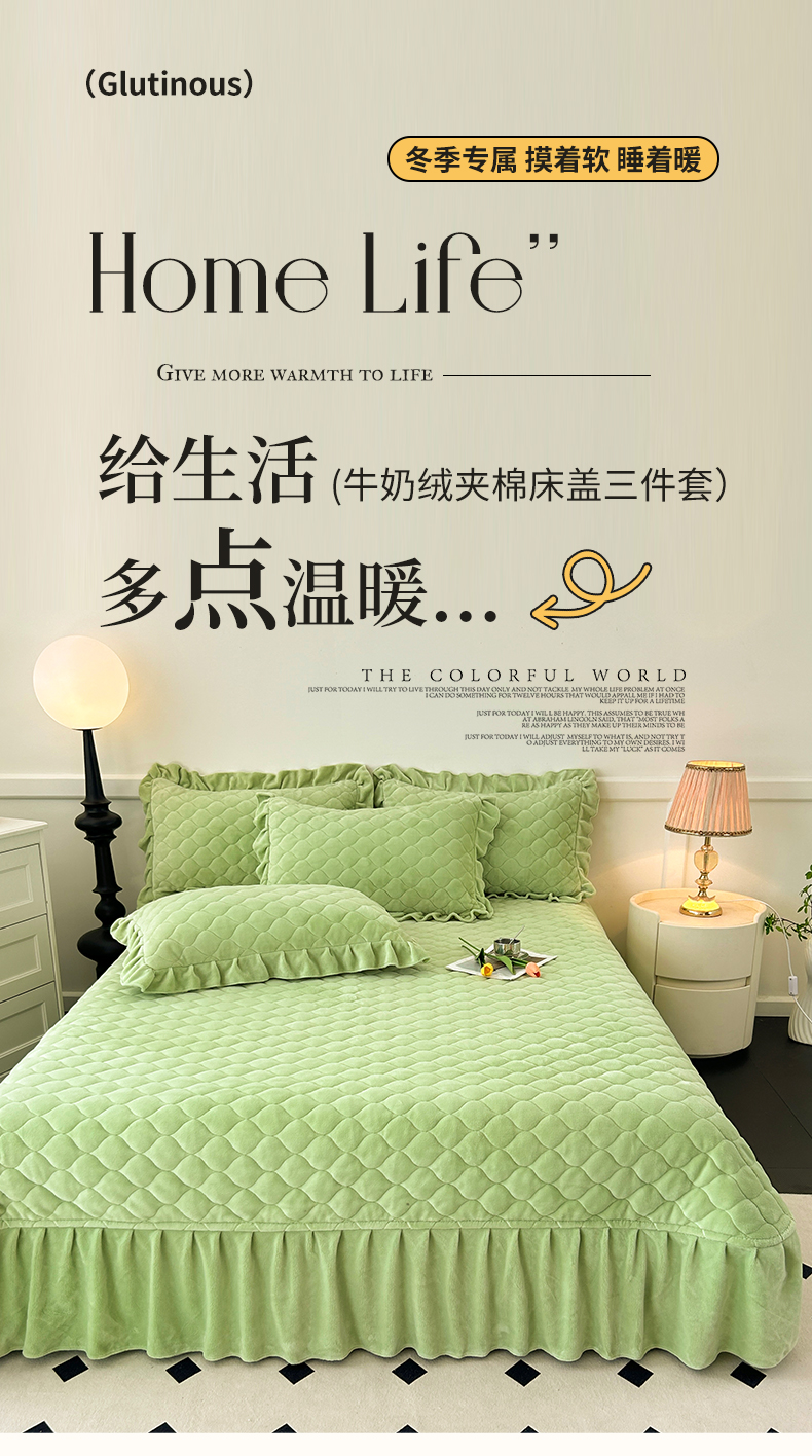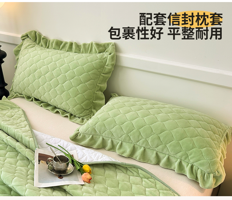 商品名称:屹成家纺 2024新款牛奶绒拼接款床盖三件套 拼接款-嫩绿