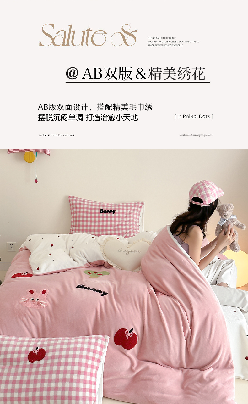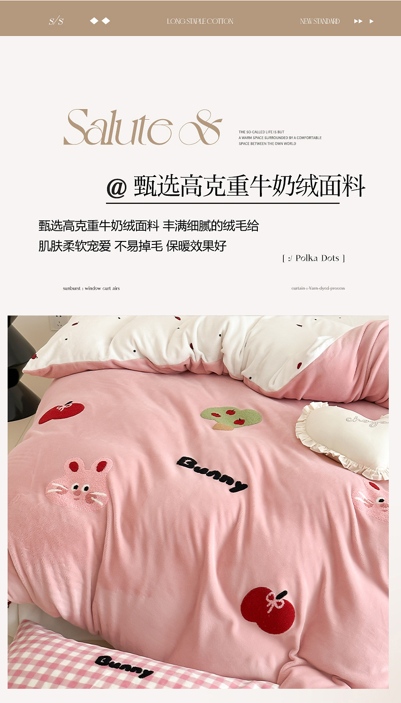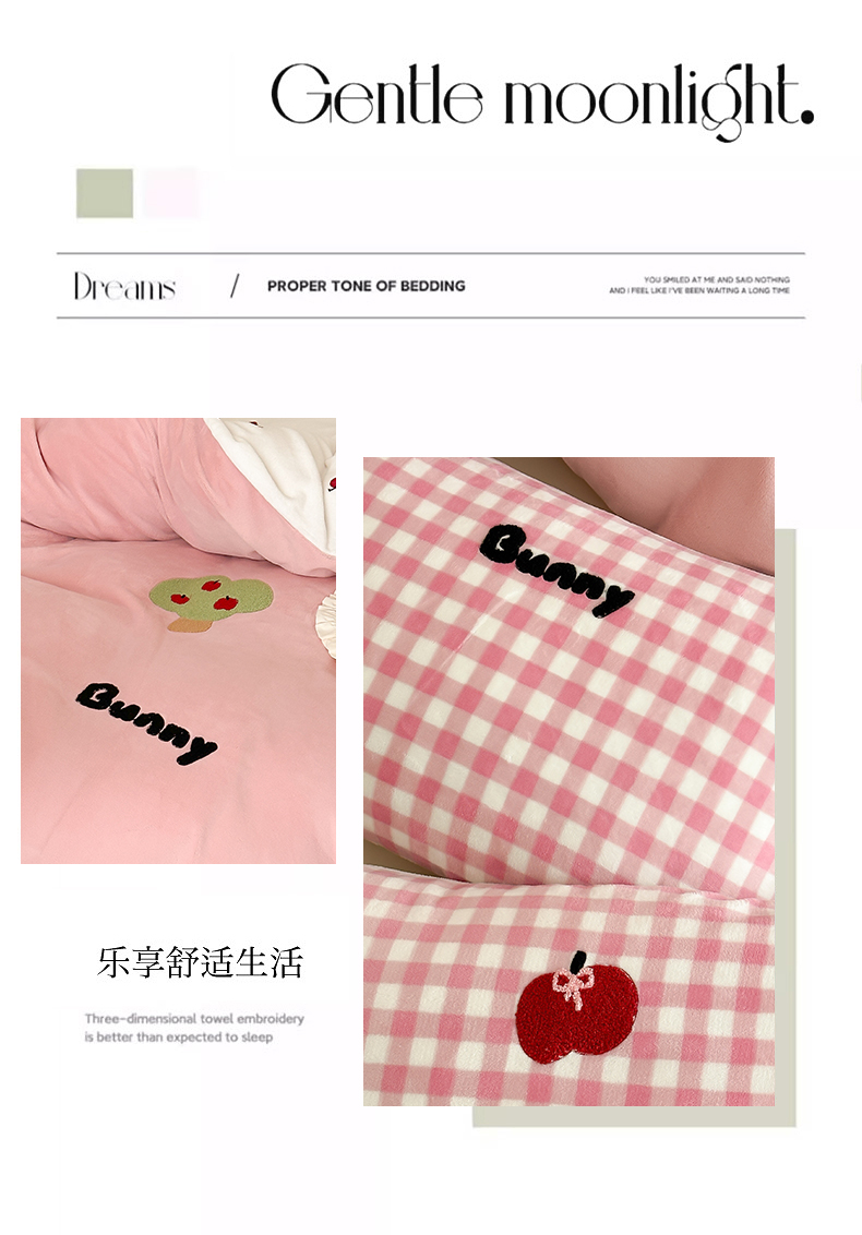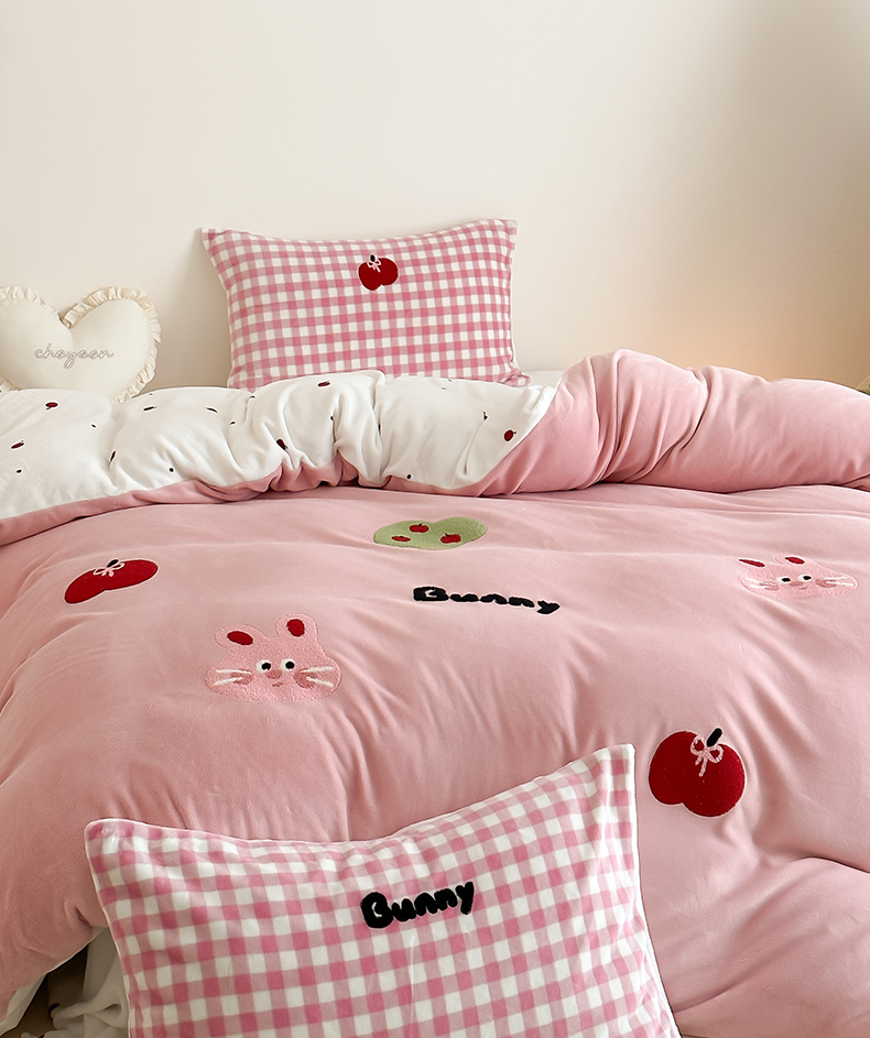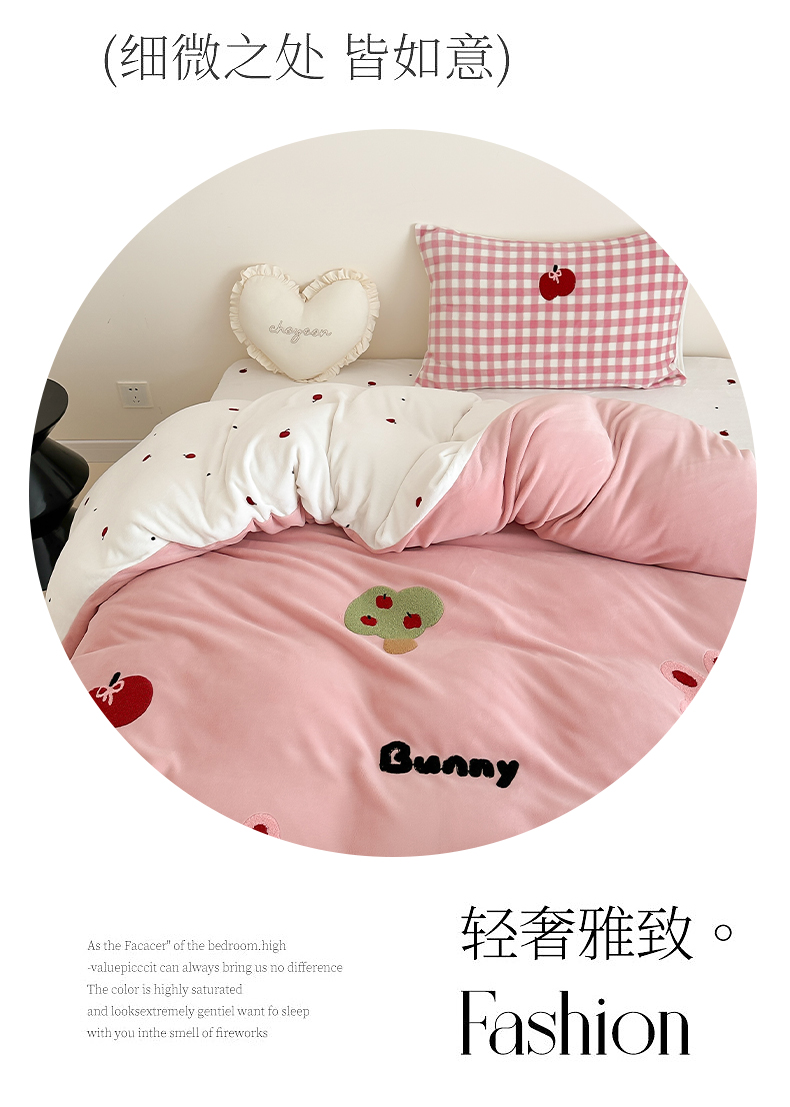 当前位置: 91家纺网 > 商品网购 > 床品套件 > 四件套 > 牛奶绒四件套 > 时光里 2024新款牛奶绒绣花款四件套 苹果兔