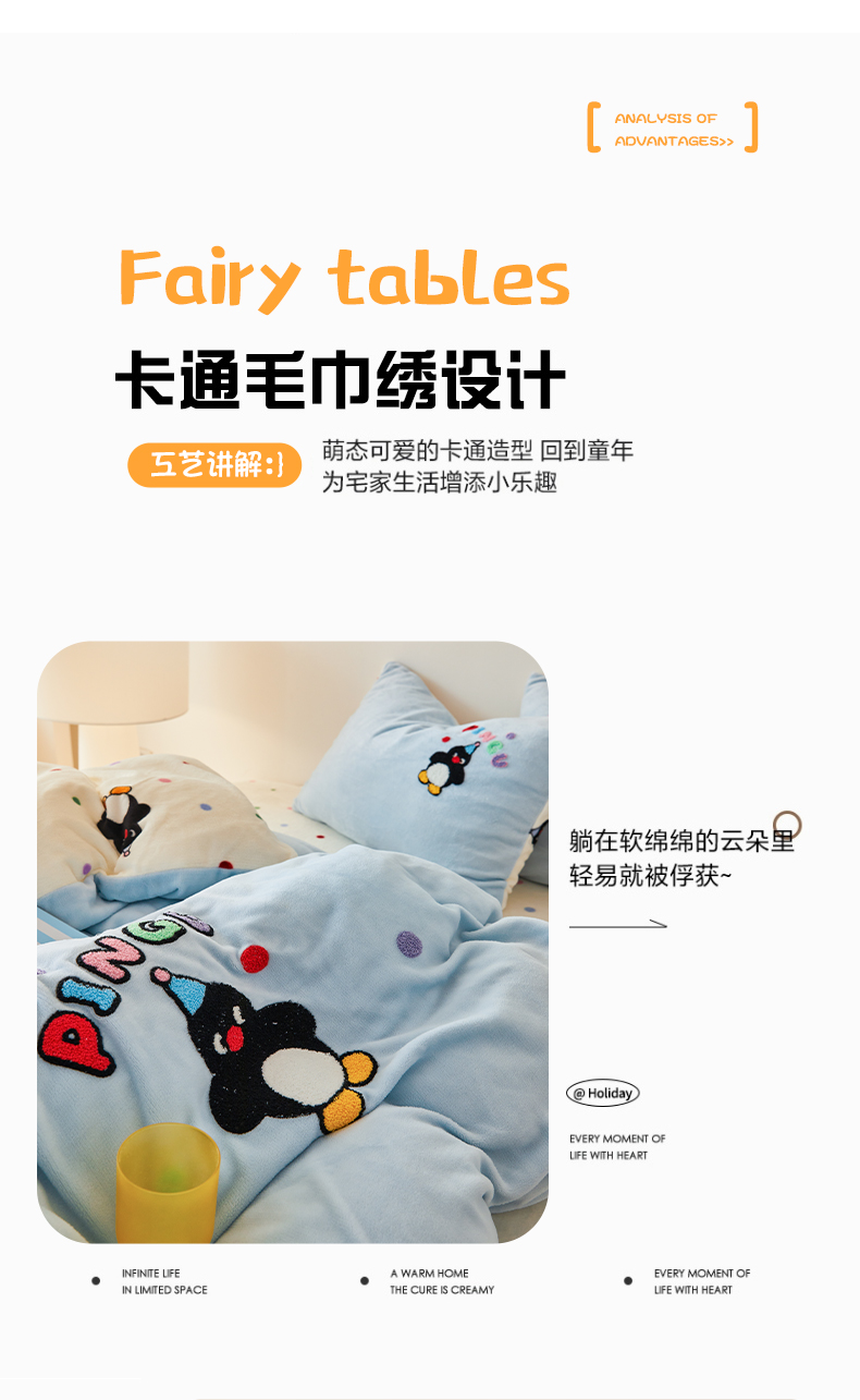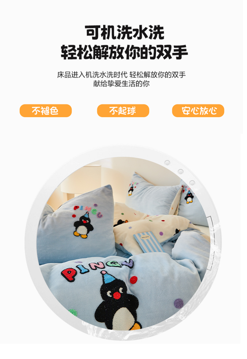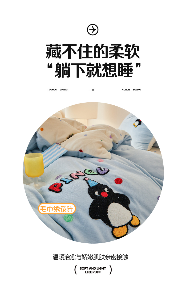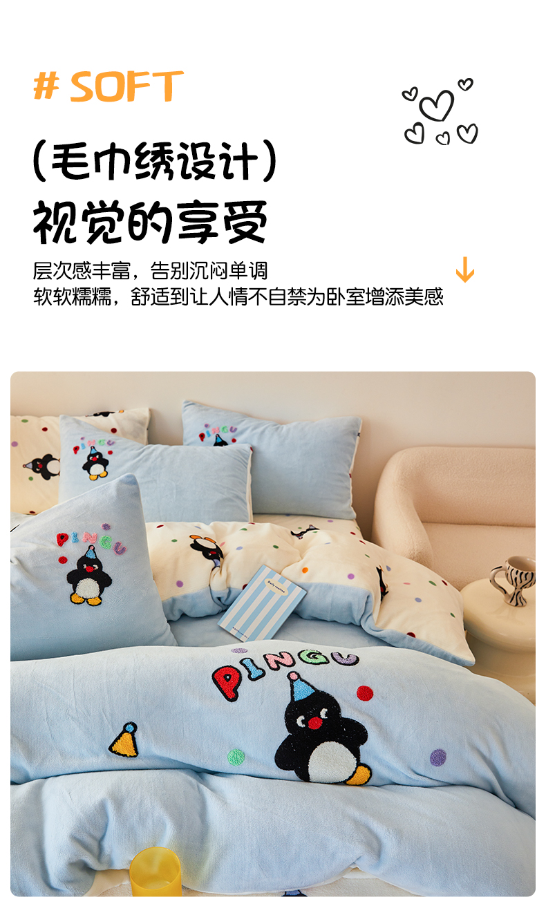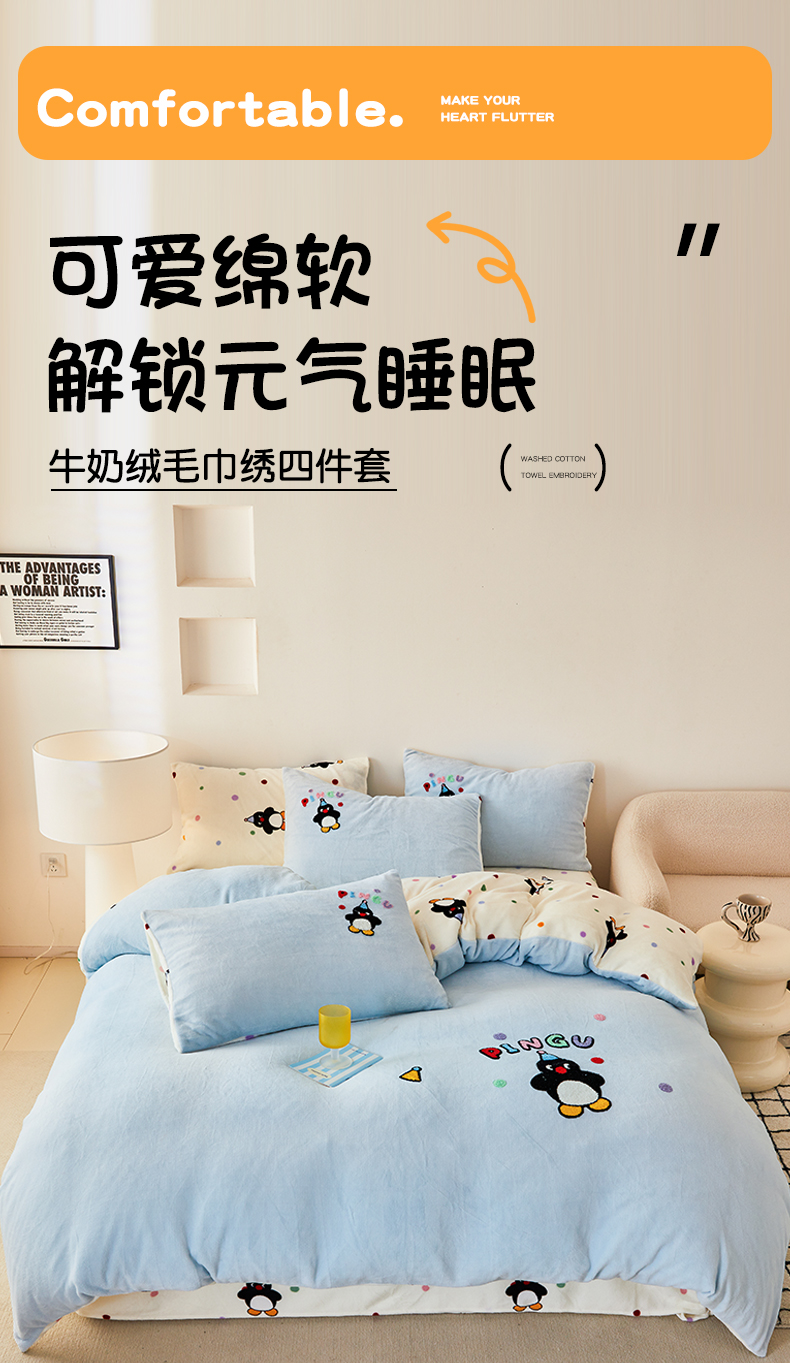 商品名称:娜娜 2024新款高克重牛奶绒毛巾绣四件套 企鹅宝贝