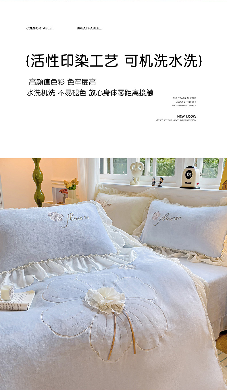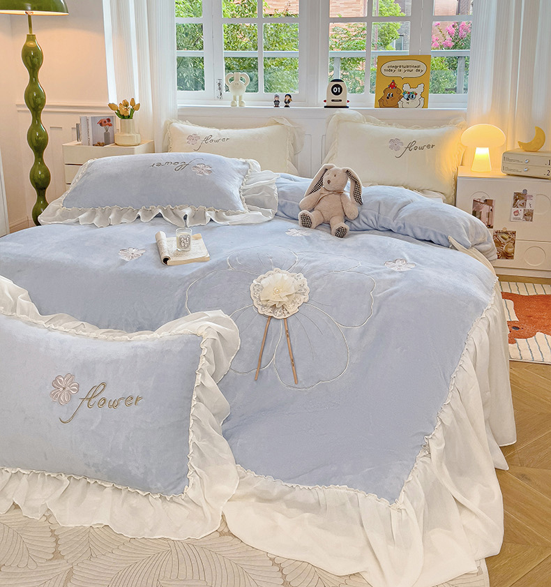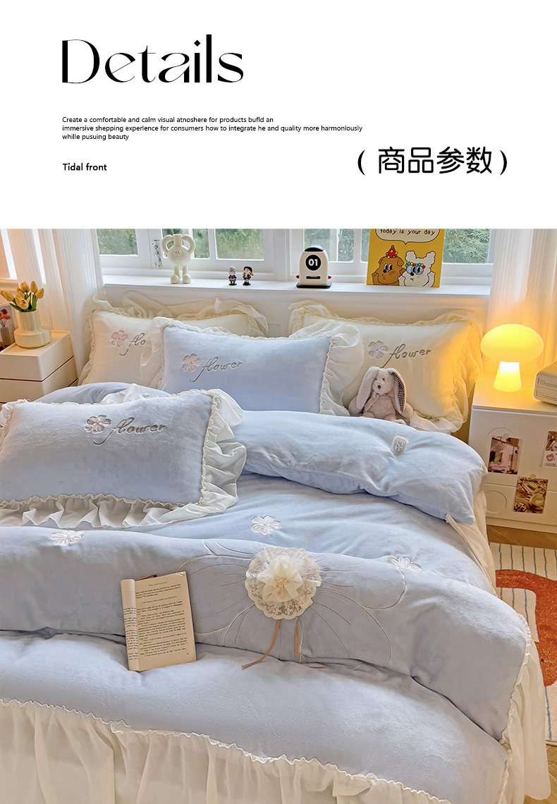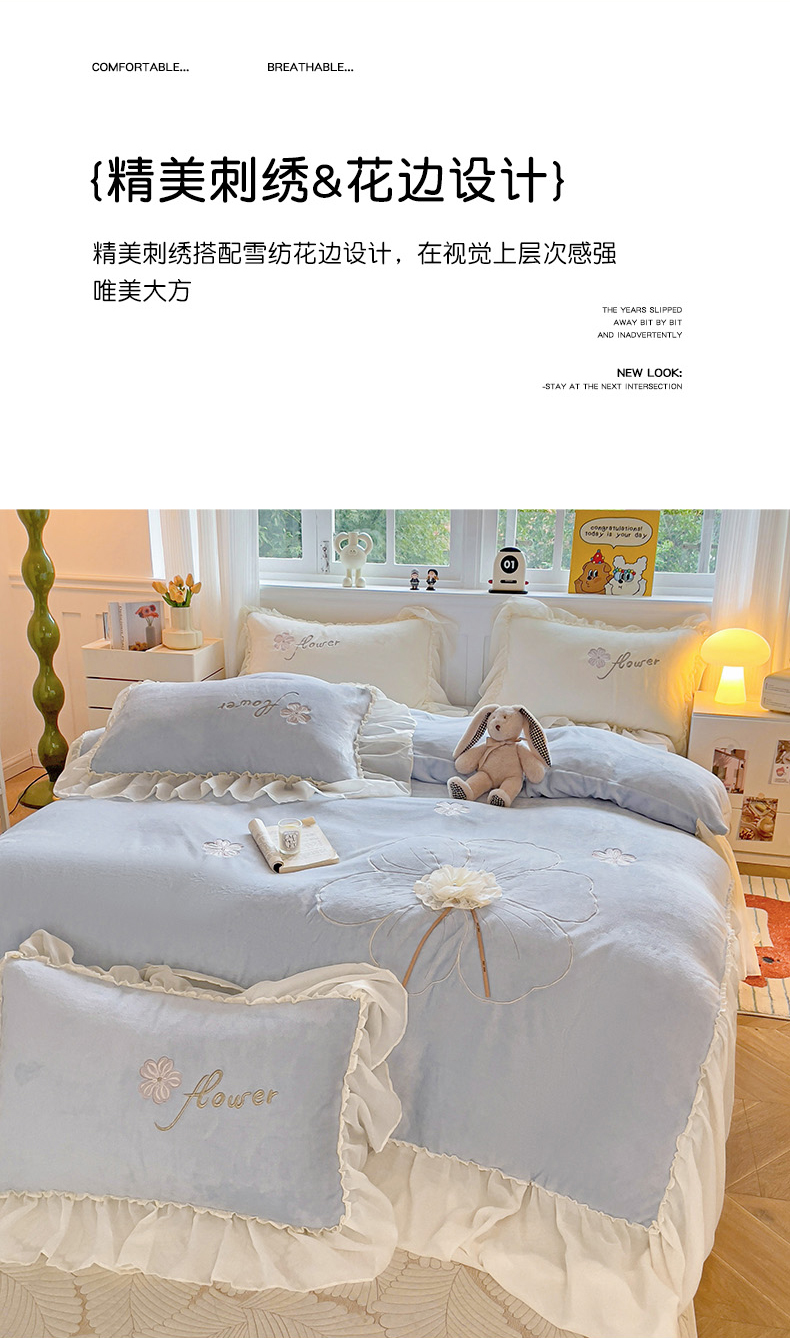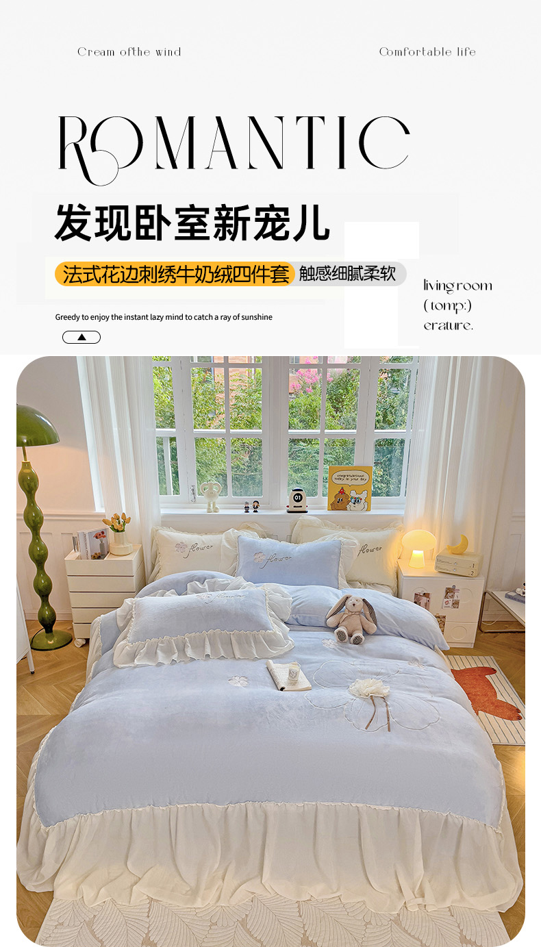 娜娜 2024新款法式花边牛奶绒刺绣四件套-花蕊-花香引蝶系列 花蕊-天空蓝