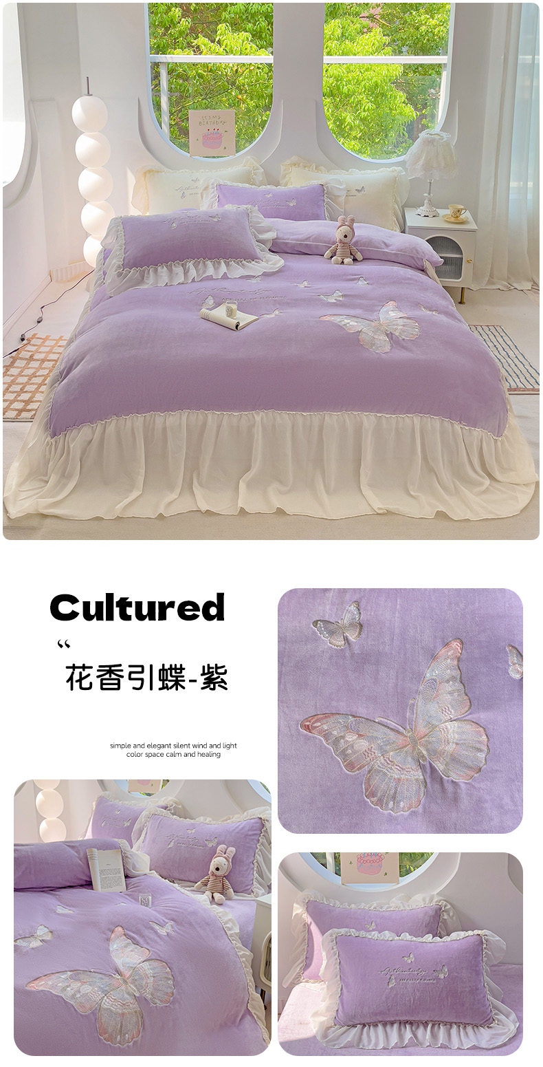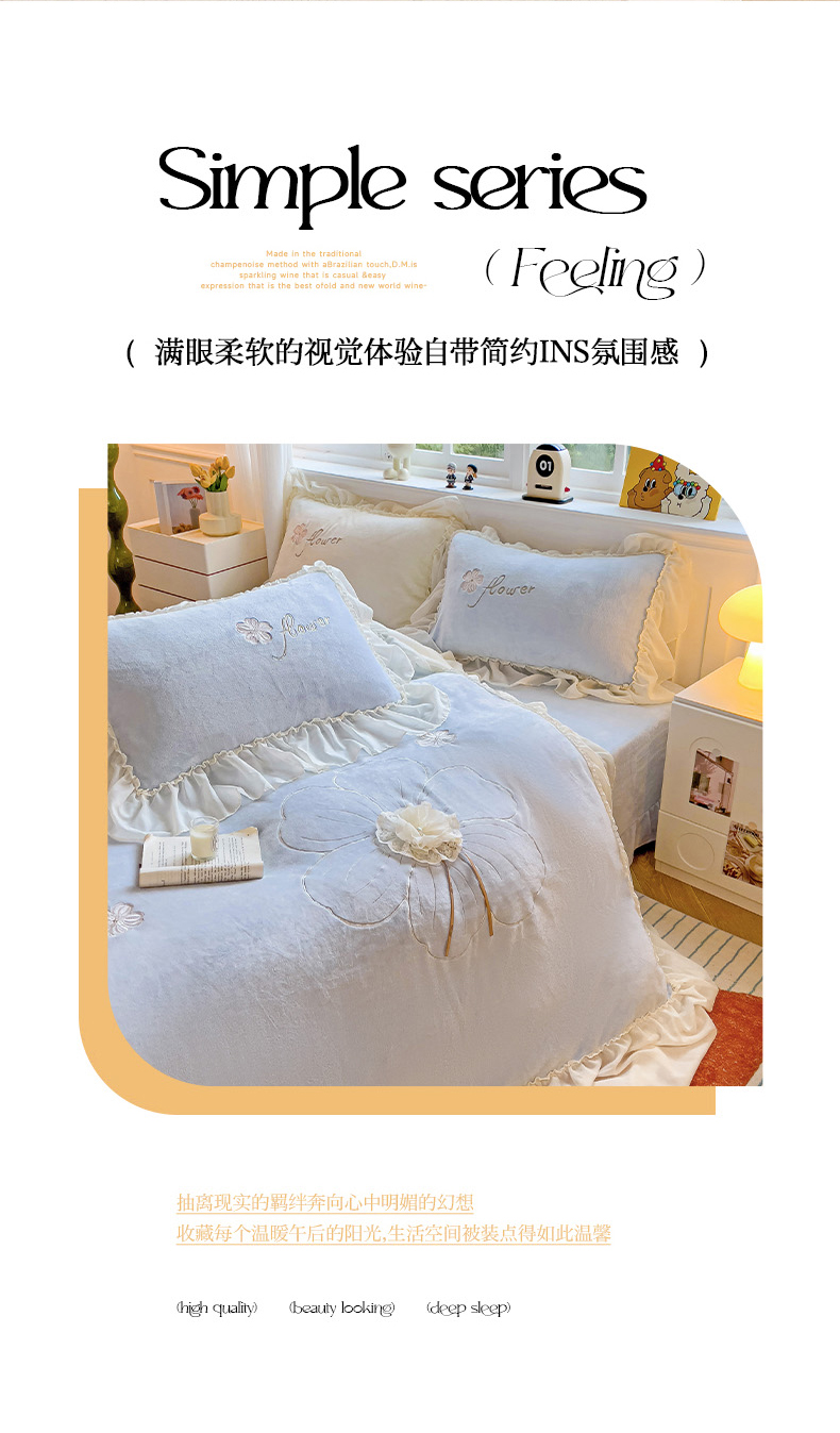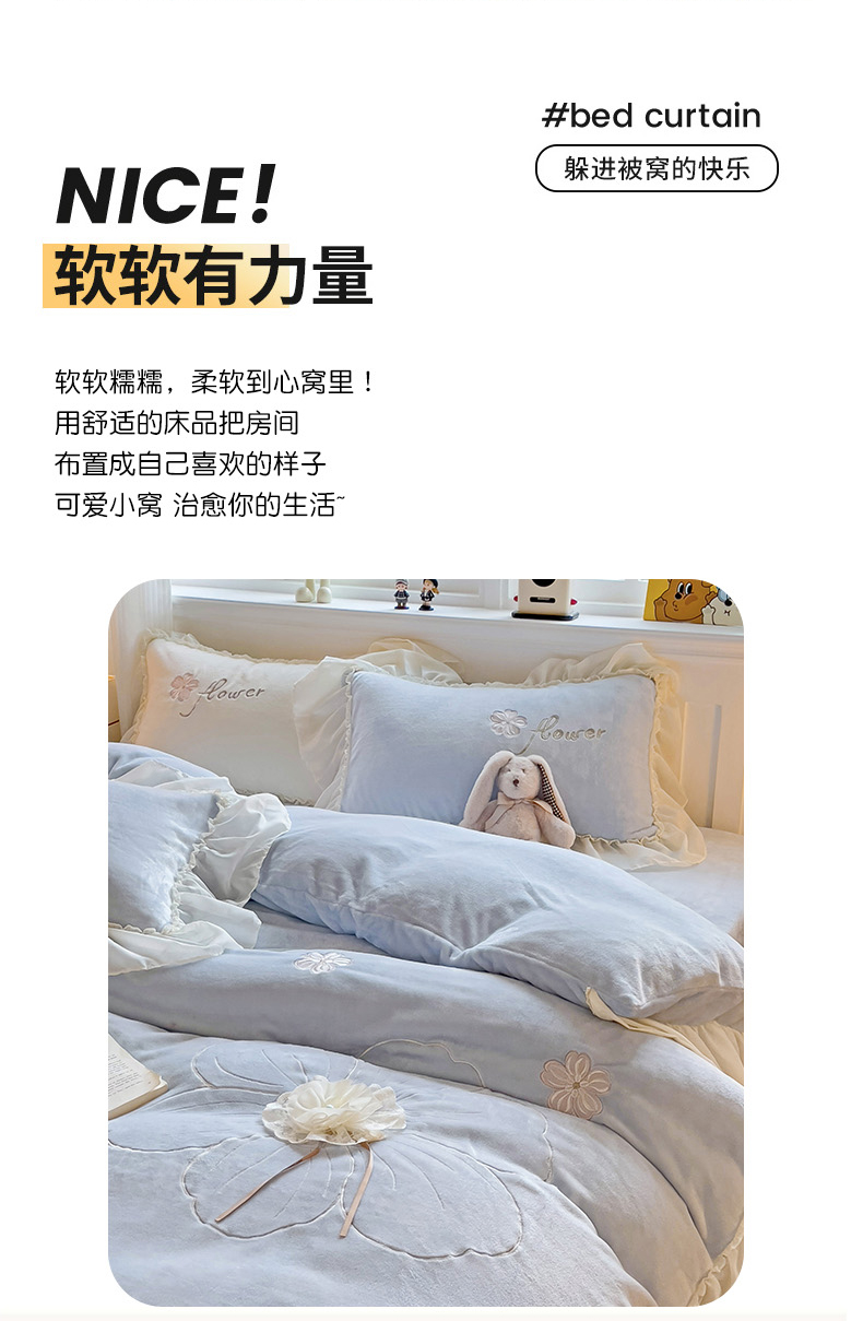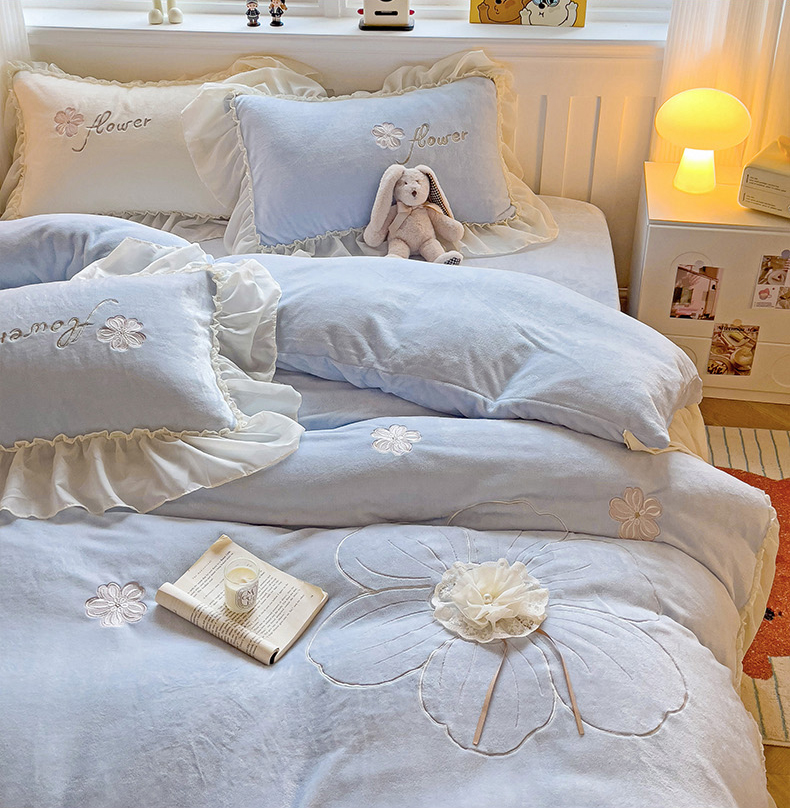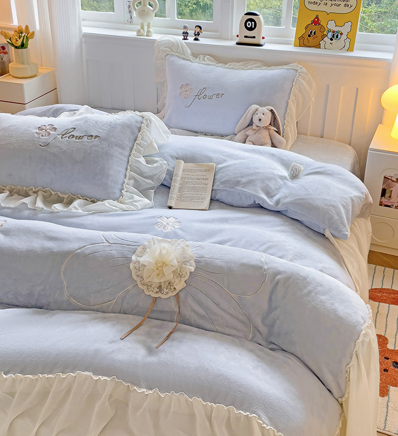娜娜 2024新款法式花边牛奶绒刺绣四件套-花蕊-花香引蝶系列 花蕊-天空蓝