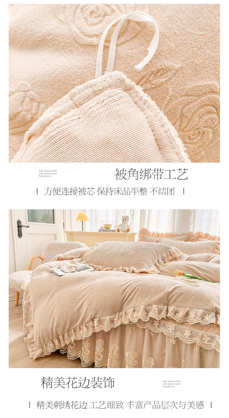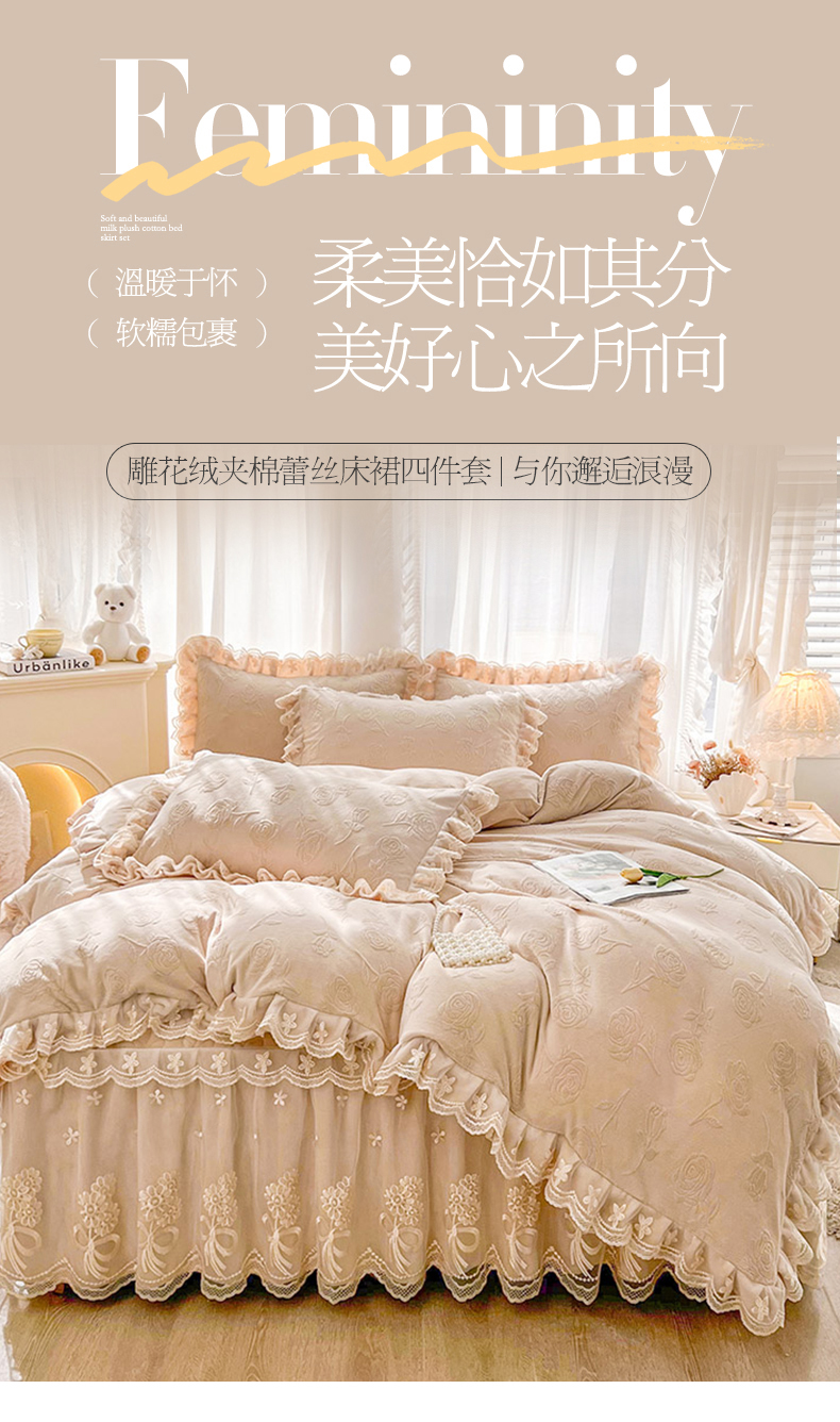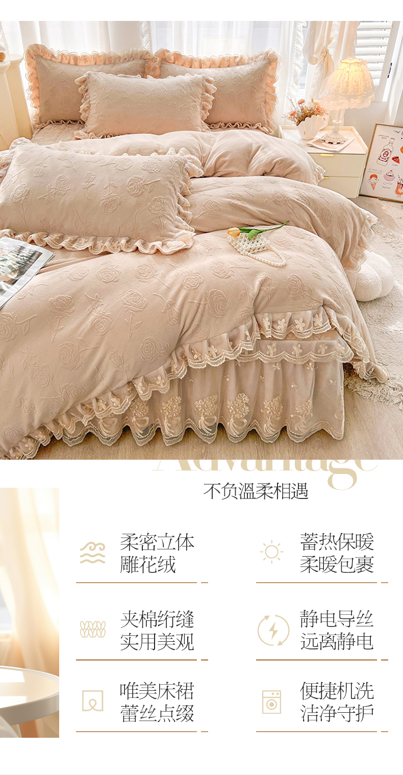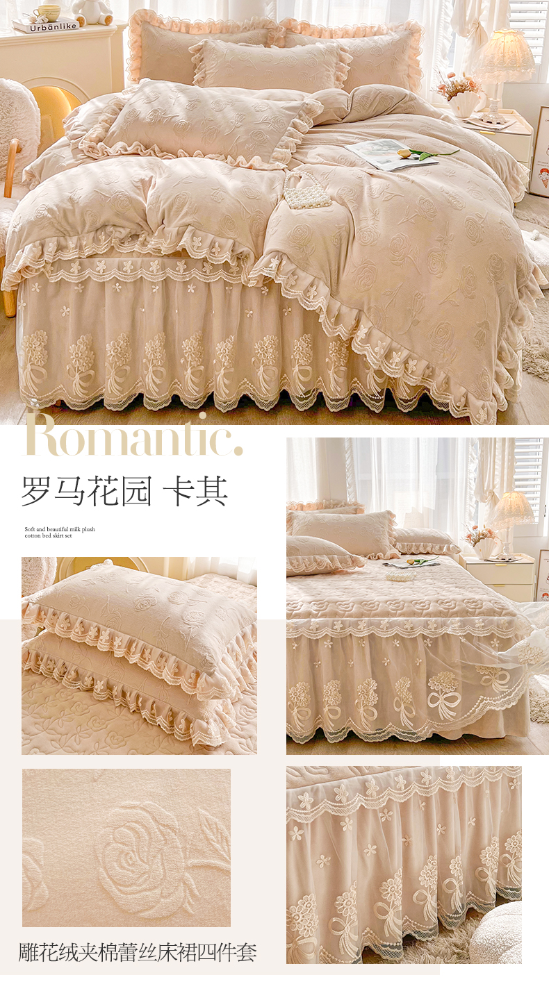 当前位置: 91家纺网 > 商品网购 > 床品套件 > 四件套 > 牛奶绒四件套 > 虹星家纺 2024新款雕花夹棉蕾丝牛奶绒床裙四件套-罗马花园 罗马花园 卡其