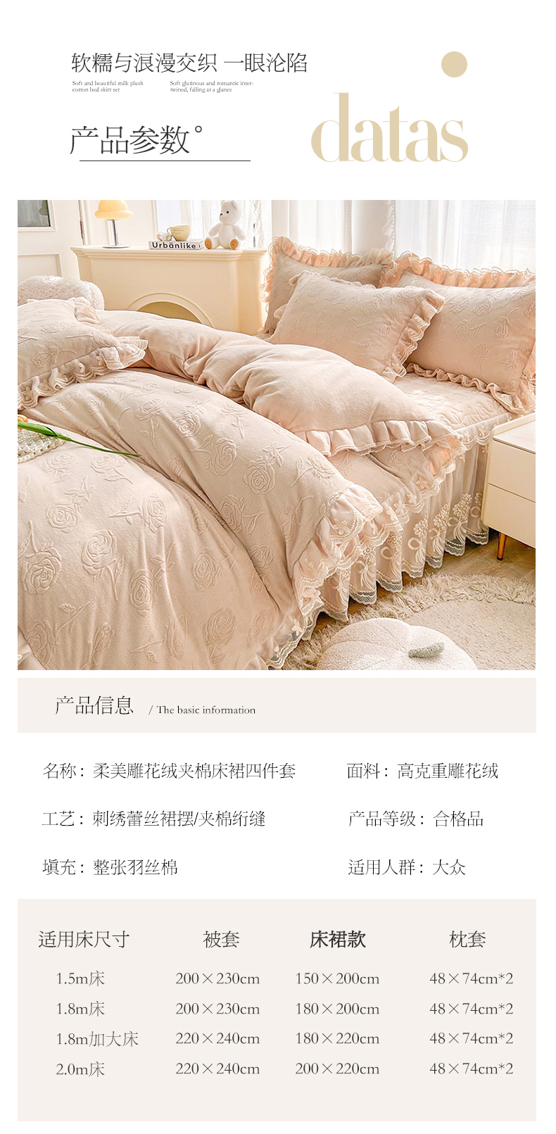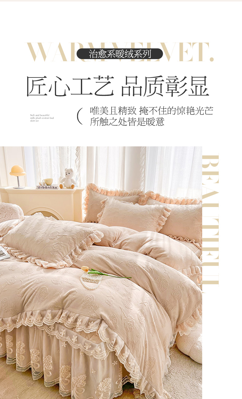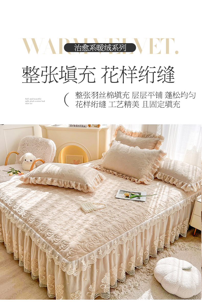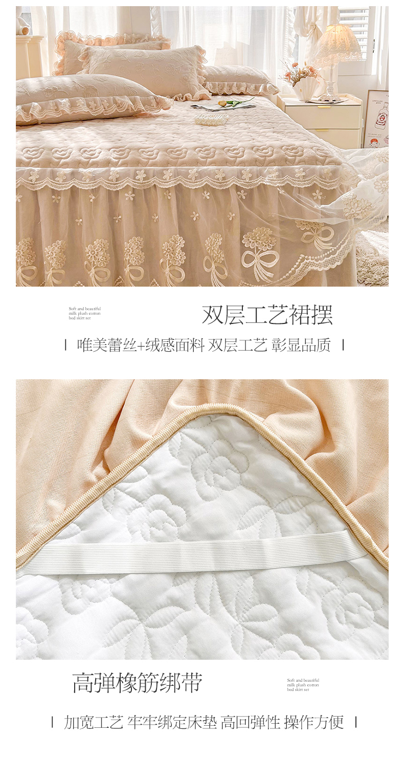 当前位置: 91家纺网 > 商品网购 > 床品套件 > 四件套 > 牛奶绒四件套 > 虹星家纺 2024新款雕花夹棉蕾丝牛奶绒床裙四件套-罗马花园 罗马花园 卡其