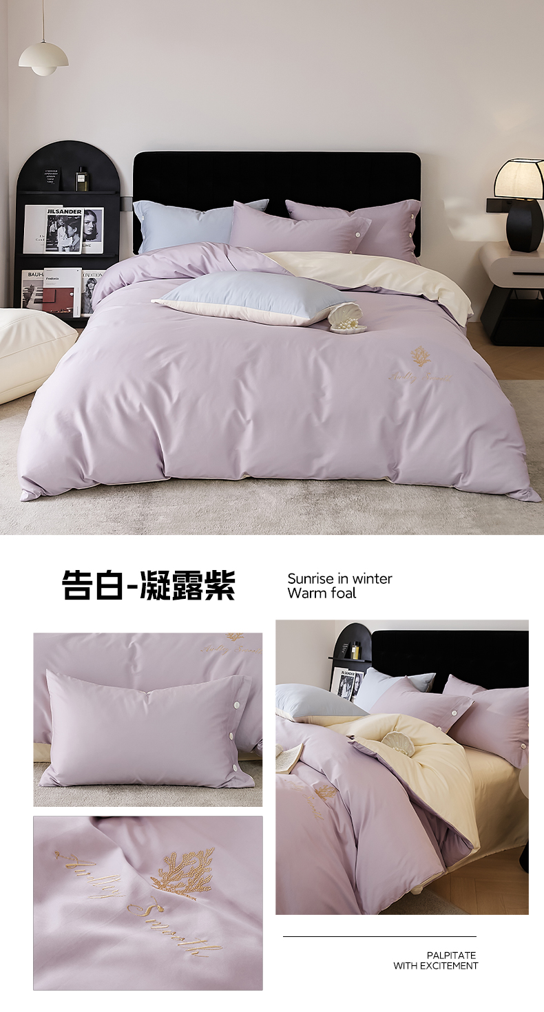 当前位置: 91家纺网 > 商品网购 > 床品套件 > 四件套 > 长绒棉四件套 > 2024新款60S长绒棉珊瑚绣花款四件套-告白系列(常规版) 告白-凝露紫