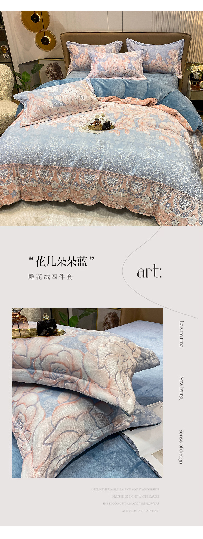 商品名称:金喜 2024新款230克AB版雕花牛奶绒加厚四件套-雅风 雅风-花朵蓝