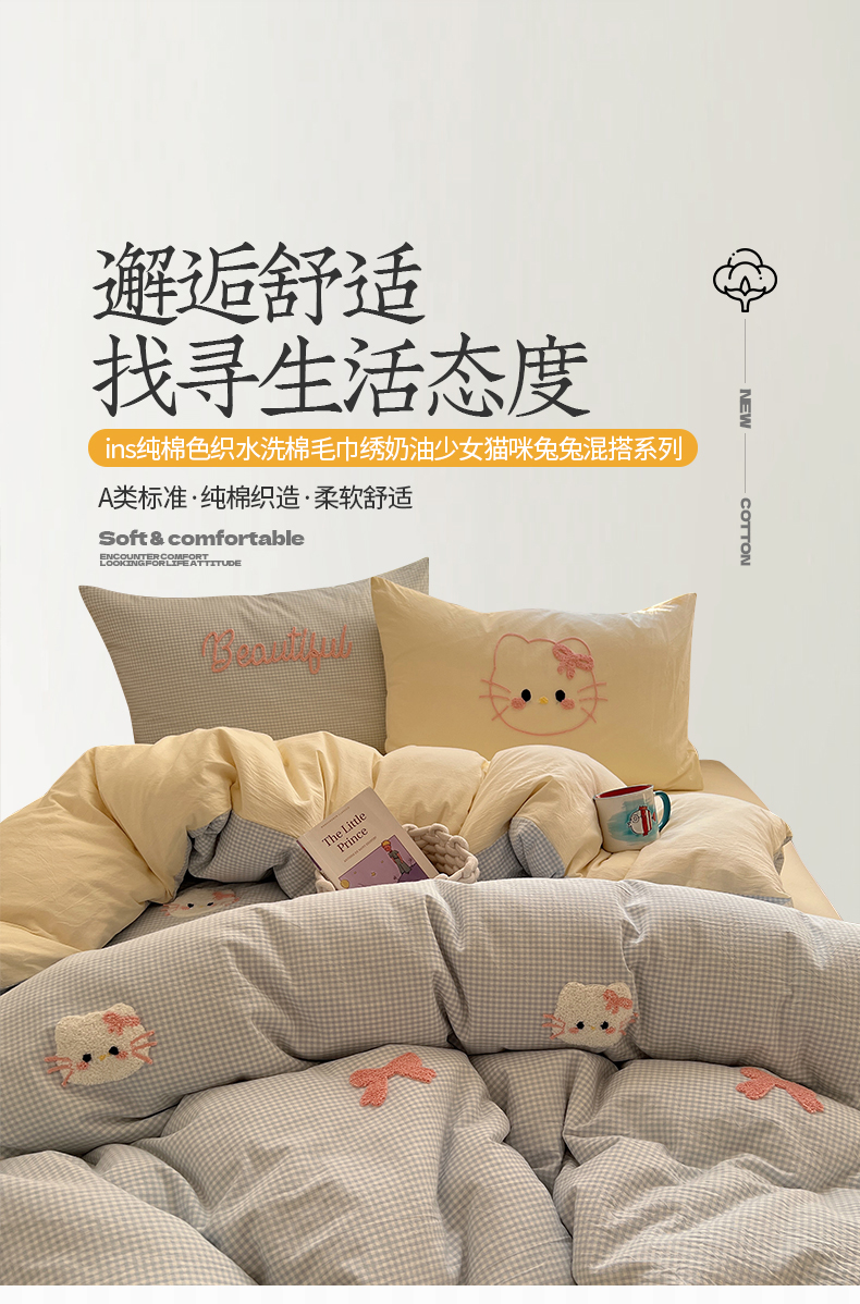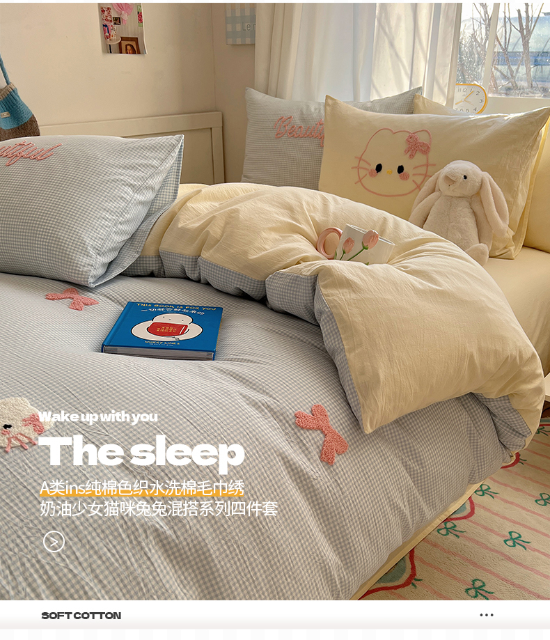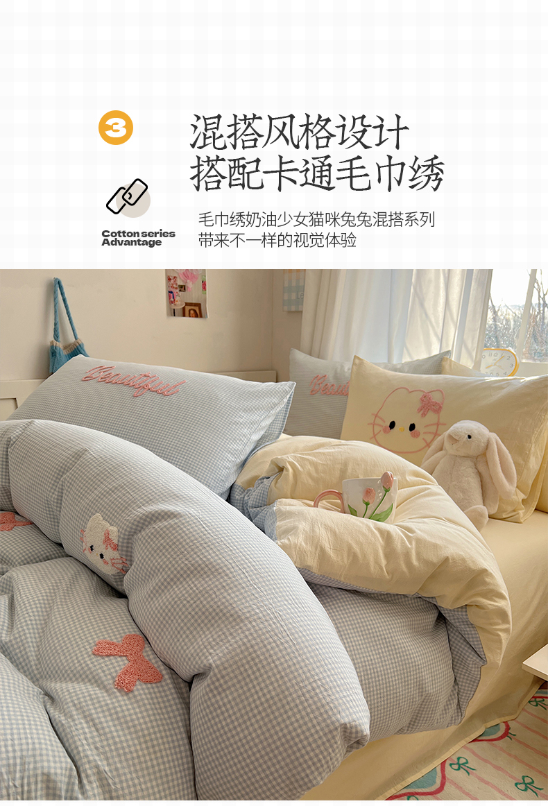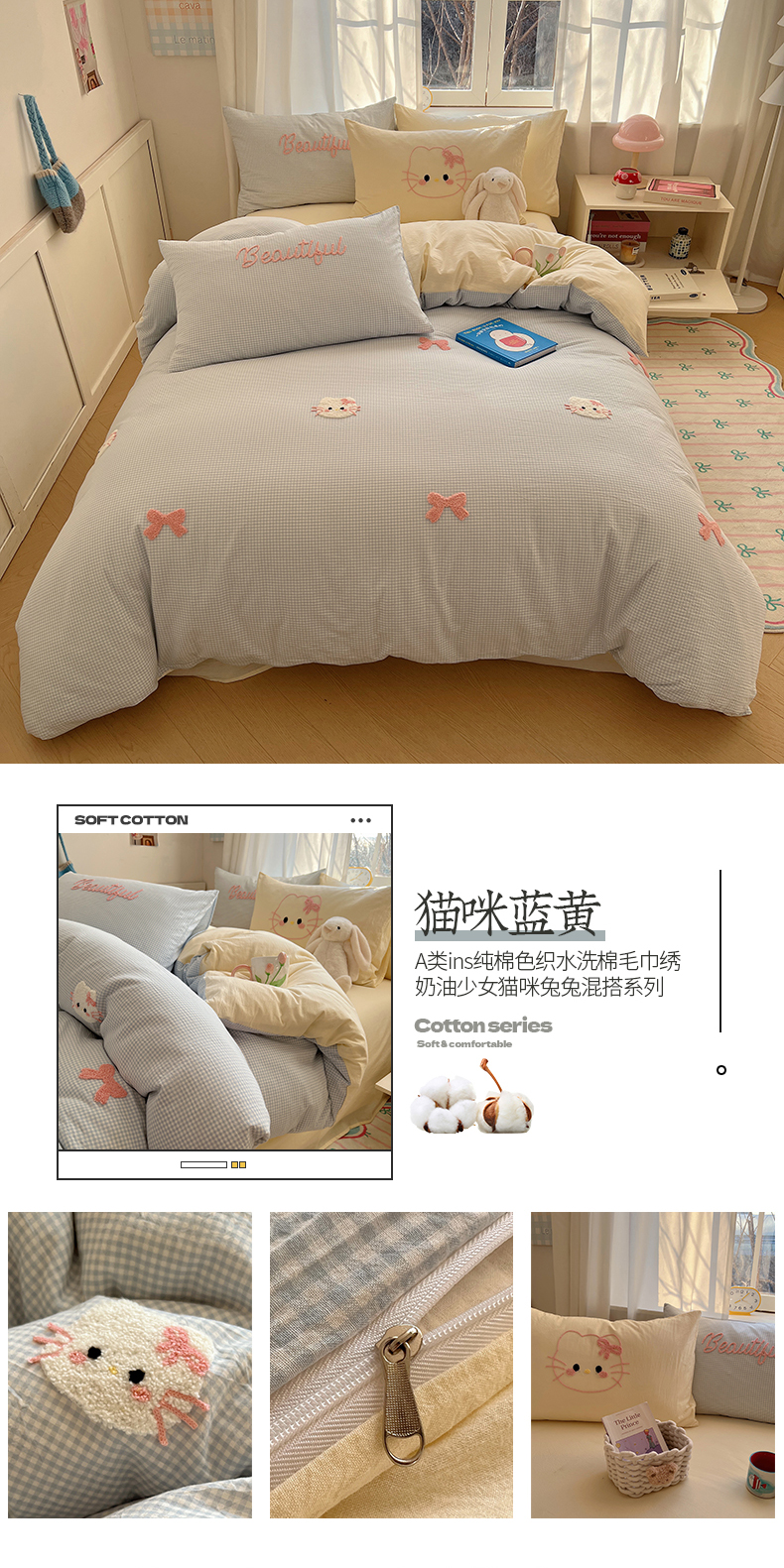 当前位置: 91家纺网 > 商品网购 > 床品套件 > 四件套 > 水洗棉四件套 > 桃子家居 2025新款A类ins纯棉色织水洗棉毛巾绣奶油少女猫咪兔兔混搭系列四件套 色织水洗棉-猫咪蓝黄