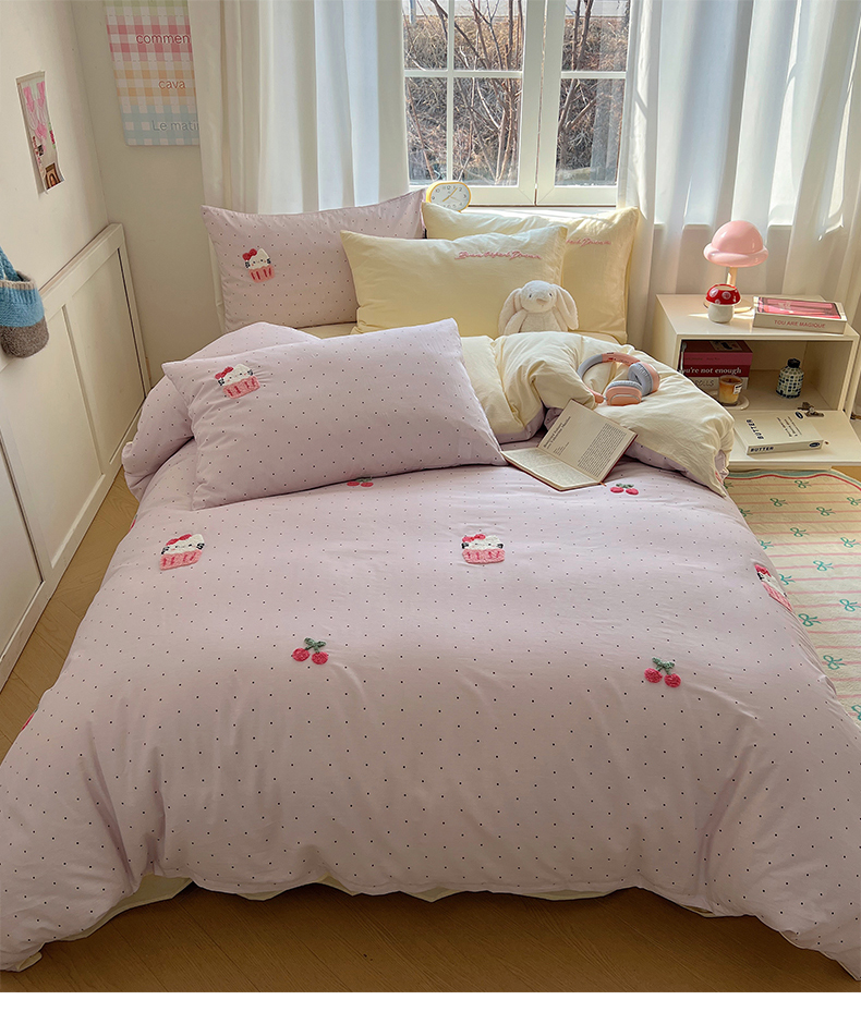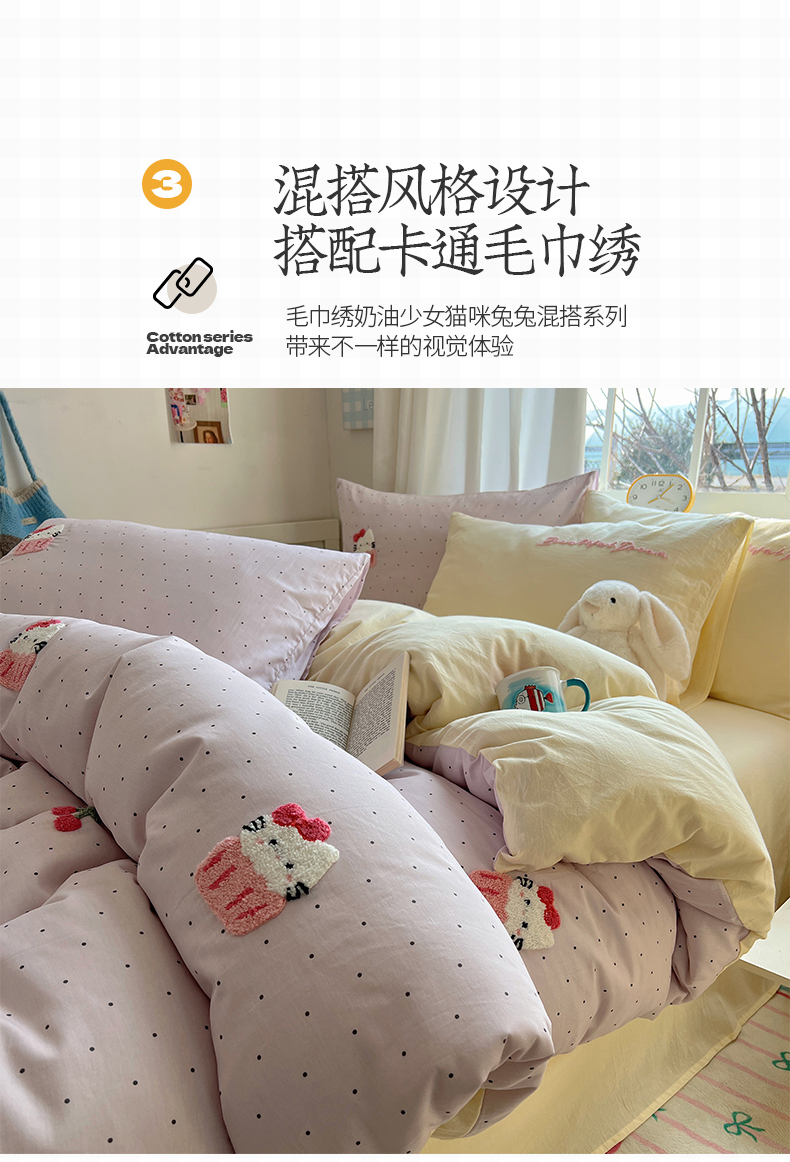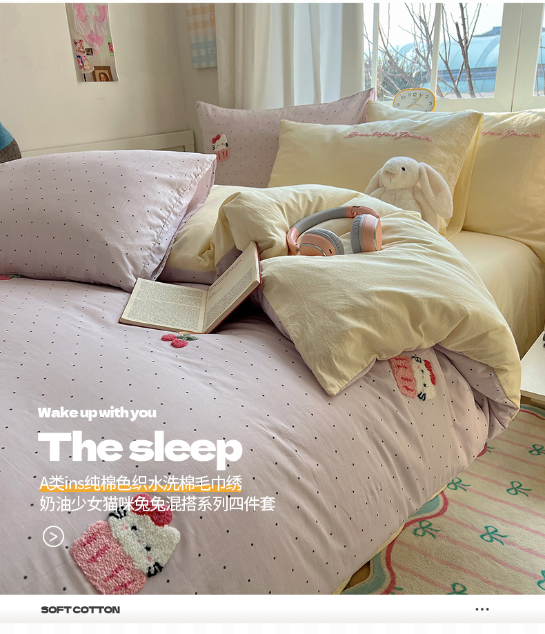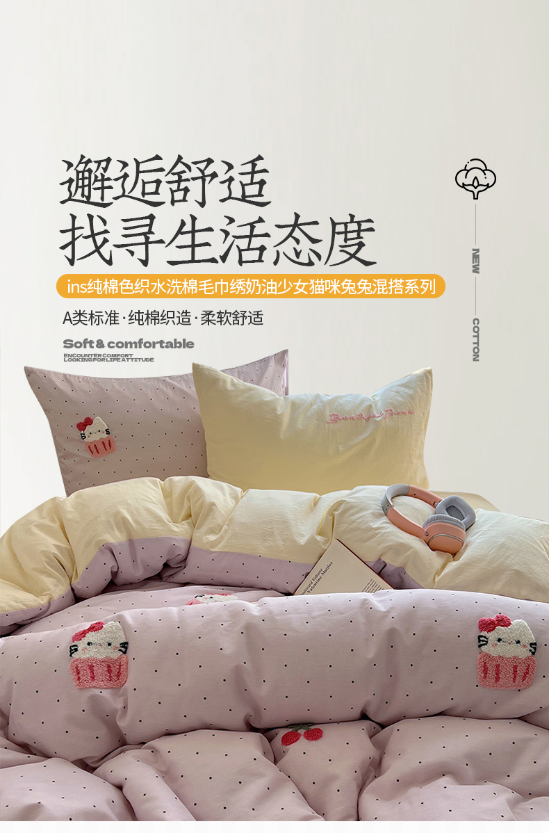 当前位置: 91家纺网 > 商品网购 > 床品套件 > 四件套 > 水洗棉四件套 > 桃子家居 2025新款A类ins纯棉色织水洗棉毛巾绣奶油少女猫咪兔兔混搭系列四件套 色织水洗棉-樱桃猫咪紫黄