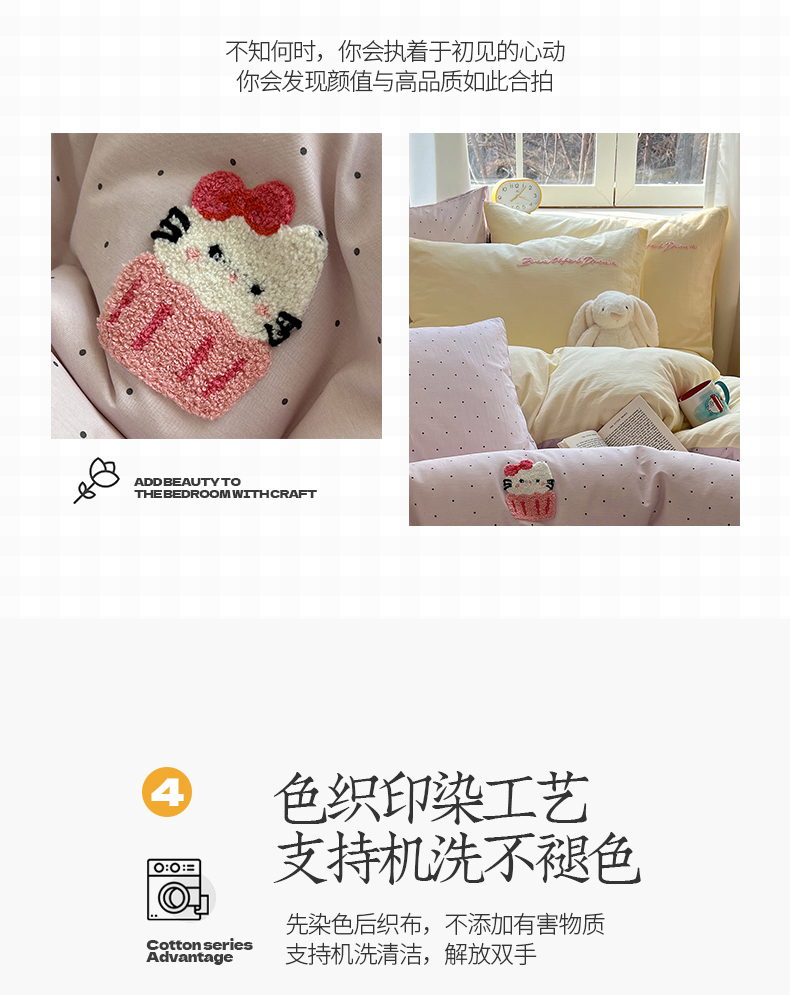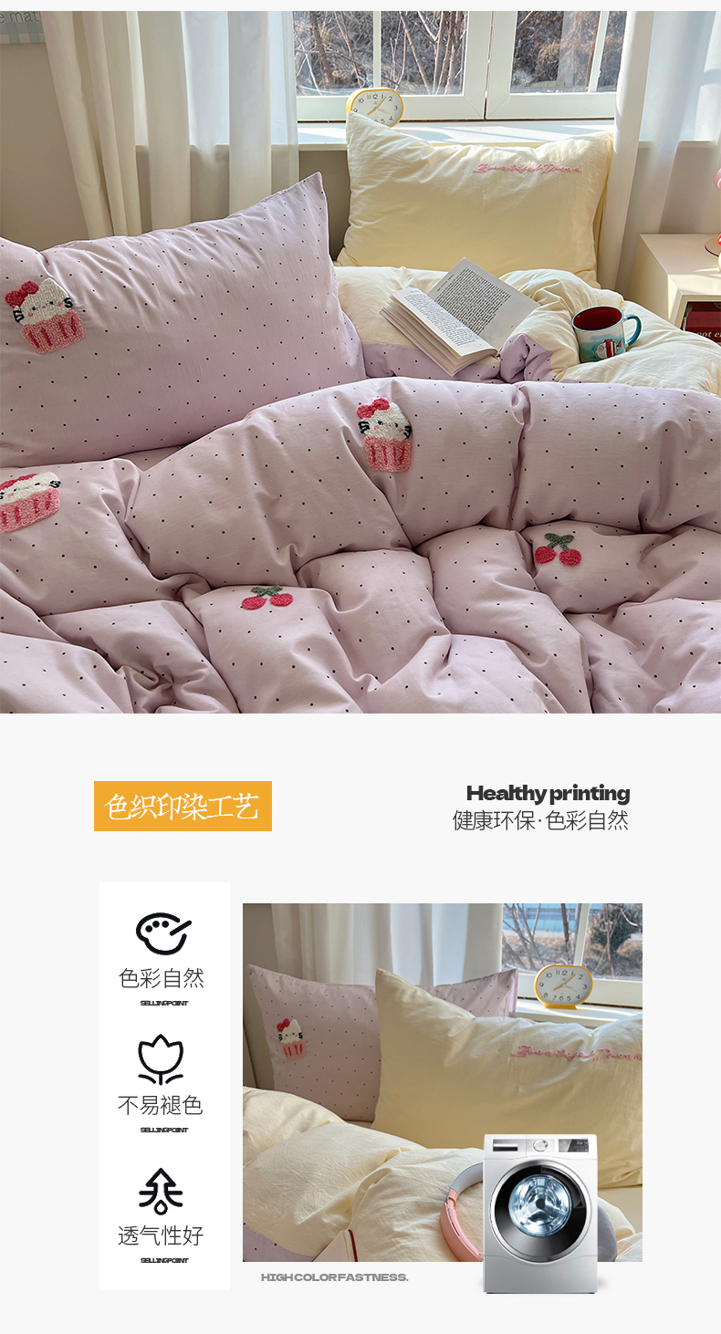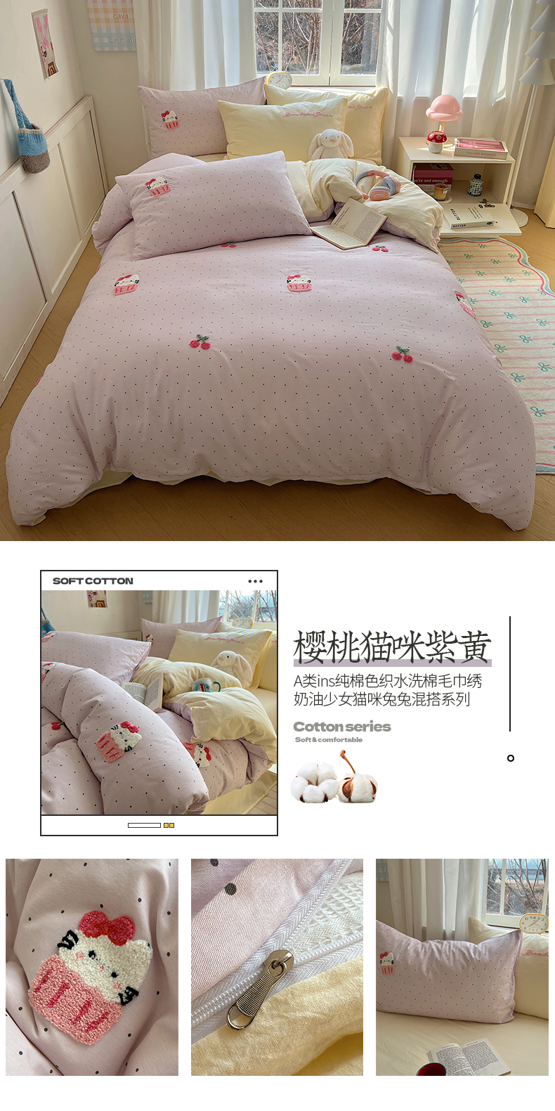 当前位置: 91家纺网 > 商品网购 > 床品套件 > 四件套 > 水洗棉四件套 > 桃子家居 2025新款A类ins纯棉色织水洗棉毛巾绣奶油少女猫咪兔兔混搭系列四件套 色织水洗棉-樱桃猫咪紫黄