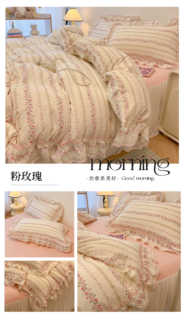 当前位置: 91家纺网 > 商品网购 > 床品套件 > 四件套 > 其它四件套 > 盼季家纺 2025新款公主风花边小清新水洗棉床上四件套床单被套床裙三件套-风格一 粉玫瑰