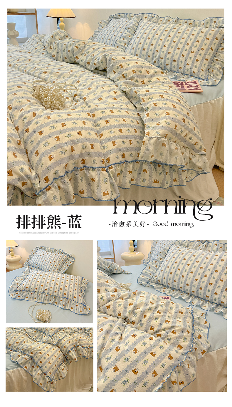 当前位置: 91家纺网 > 商品网购 > 床品套件 > 四件套 > 其它四件套 > 盼季家纺 2025新款公主风花边小清新水洗棉床上四件套床单被套床裙三件套-风格一 排排熊-蓝