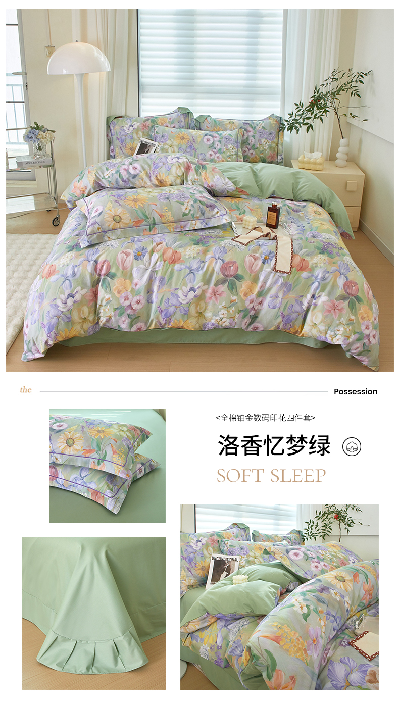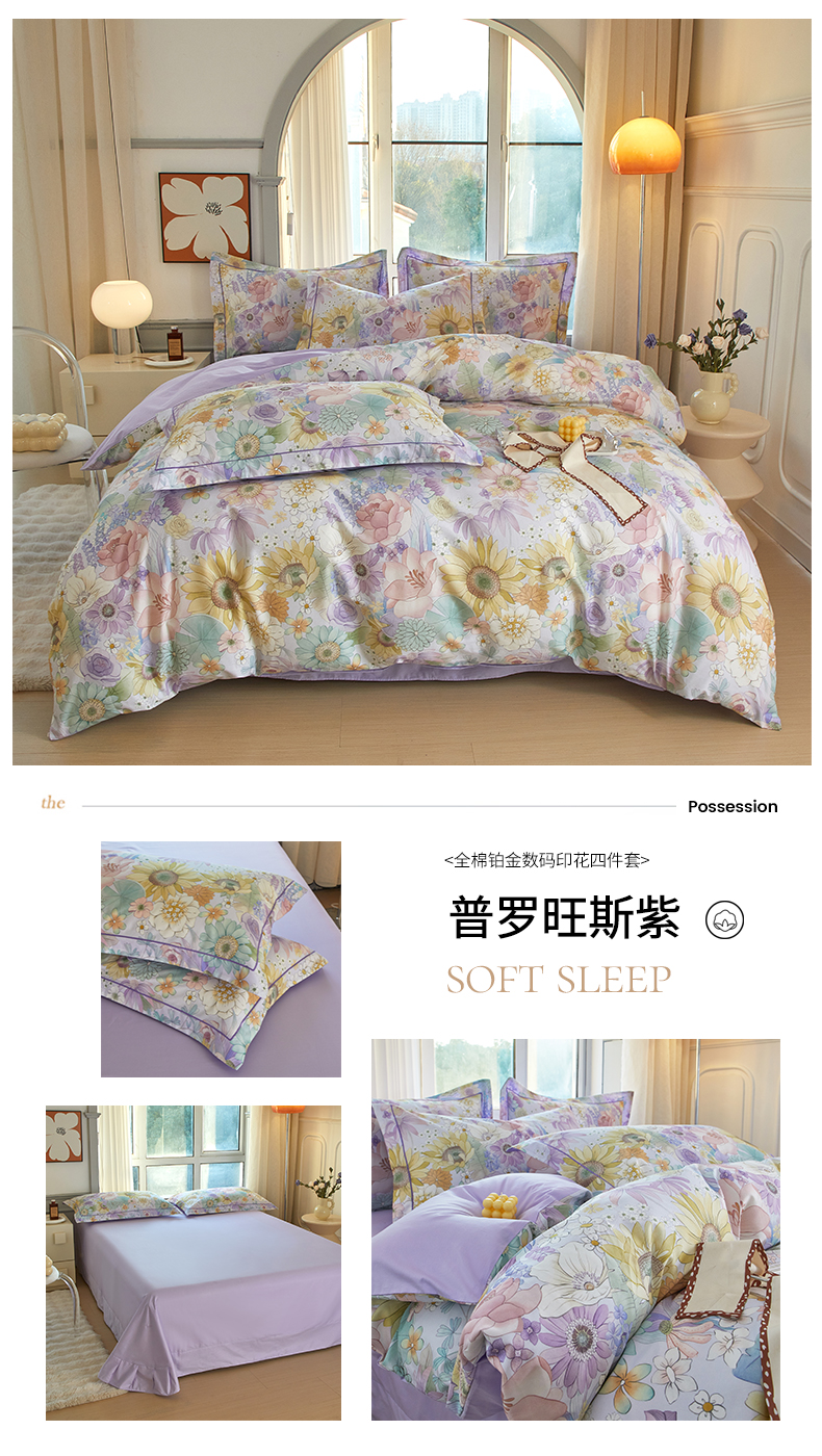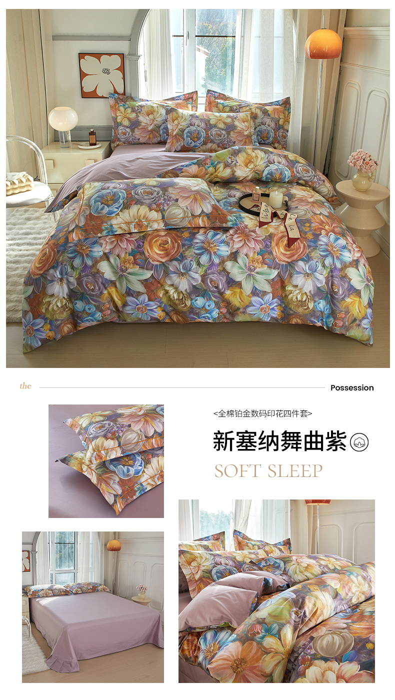 (总)启航家居 2025新款全棉铂金棉数码印花四件套,风香花倦,花的嫁纱,洛香忆梦绿,暮云春树灰,翩若惊鸿粉,普罗旺斯紫,新塞纳舞曲红,新塞纳舞曲紫