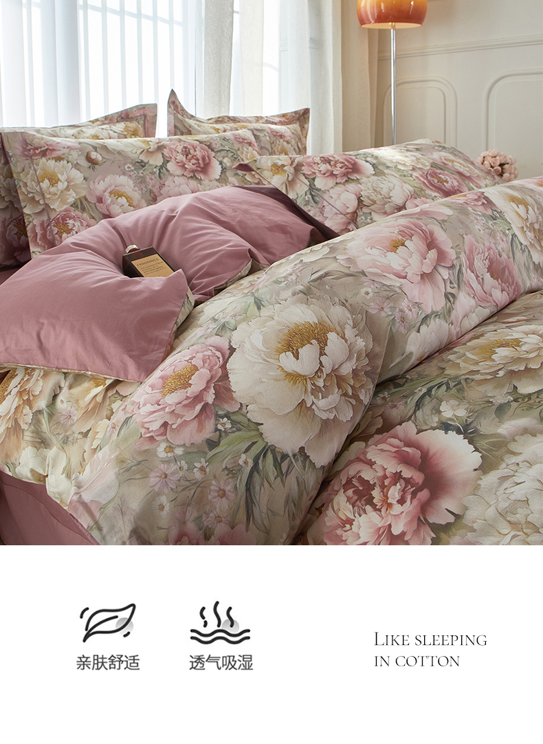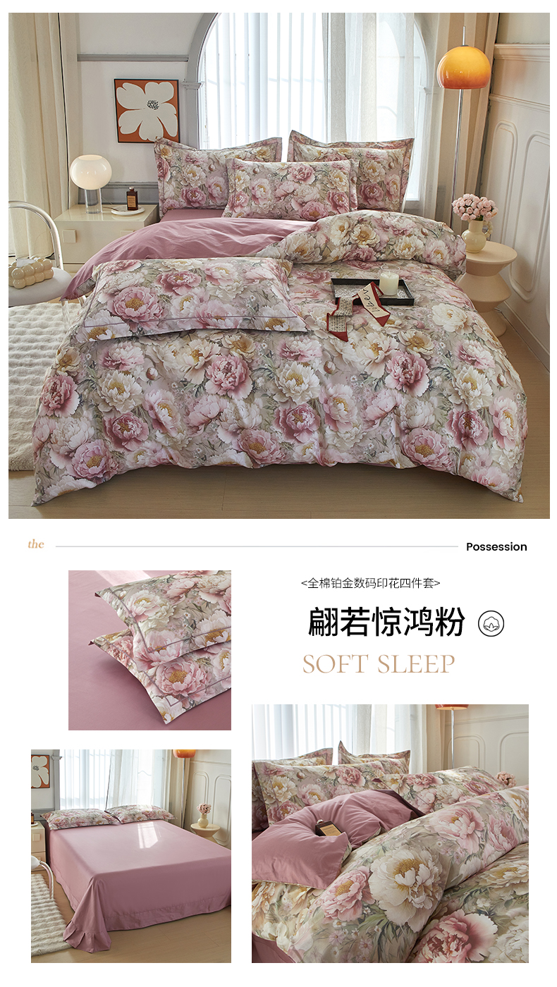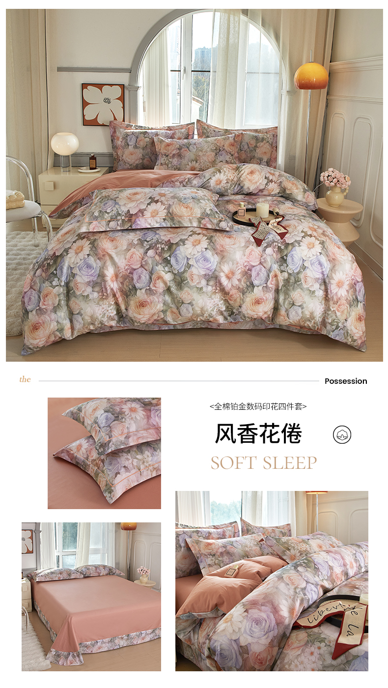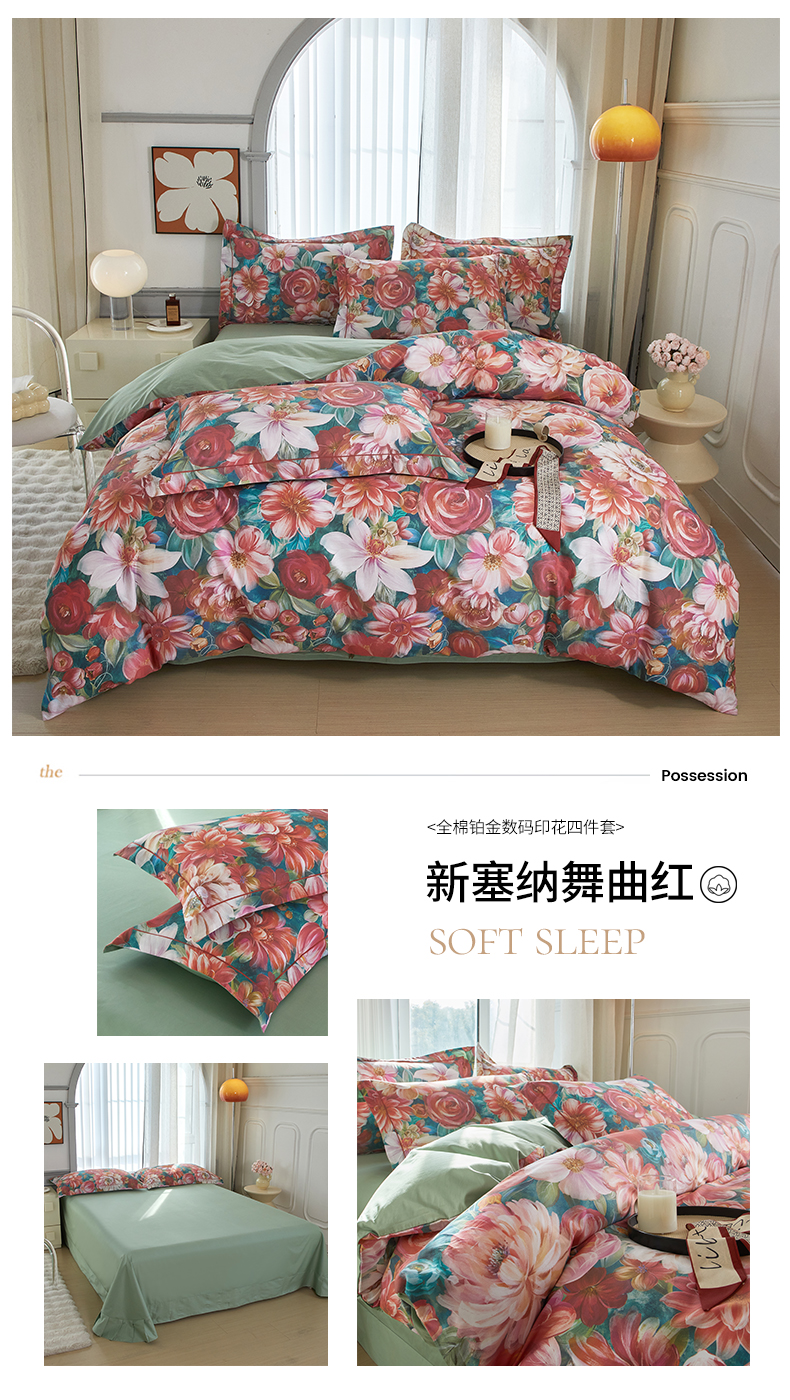 (总)启航家居 2025新款全棉铂金棉数码印花四件套,风香花倦,花的嫁纱,洛香忆梦绿,暮云春树灰,翩若惊鸿粉,普罗旺斯紫,新塞纳舞曲红,新塞纳舞曲紫