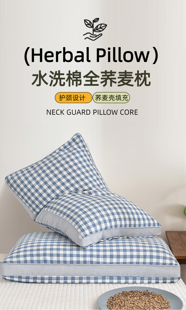 商品名称:纽乐家纺 2025新款水洗棉全荞麦枕枕头枕芯 蓝格子35*55