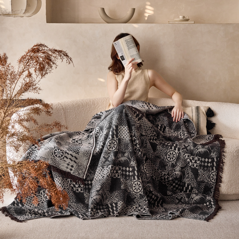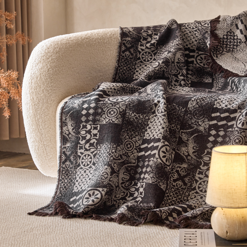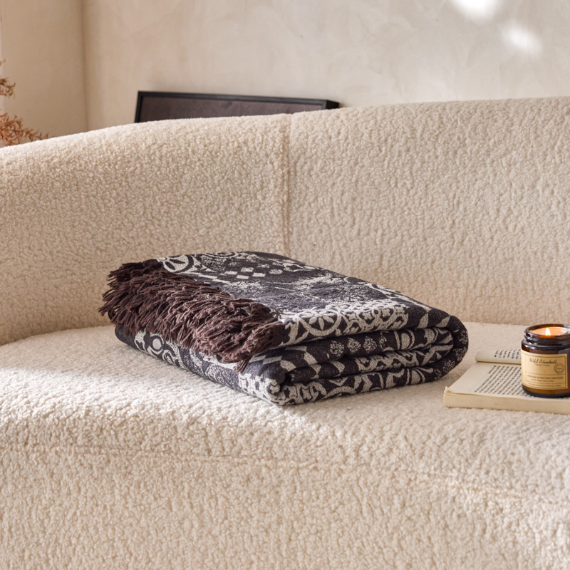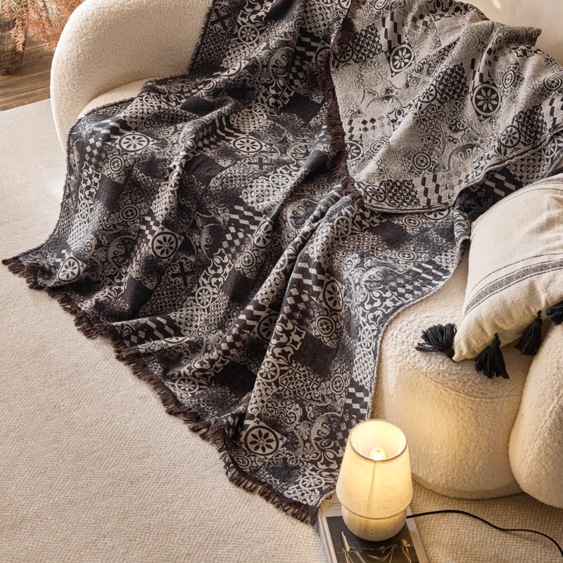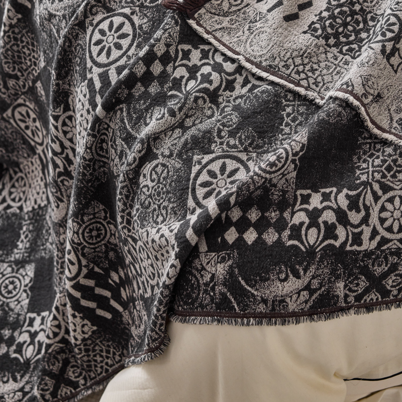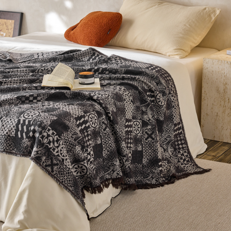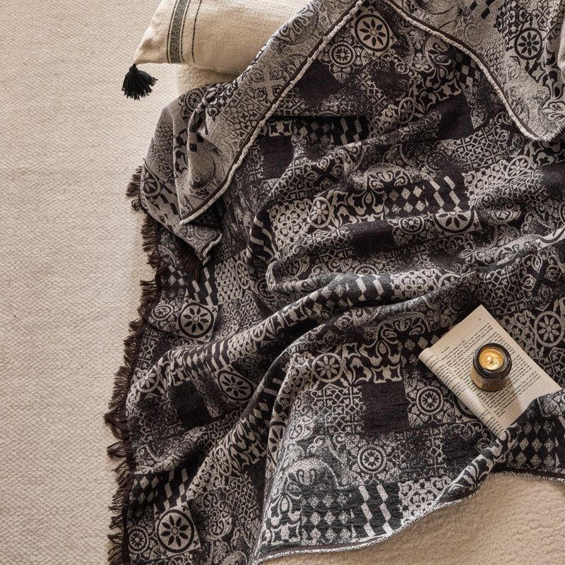 简家居 2025新款全棉色织纱布毯复古流苏毯 山茶---黑