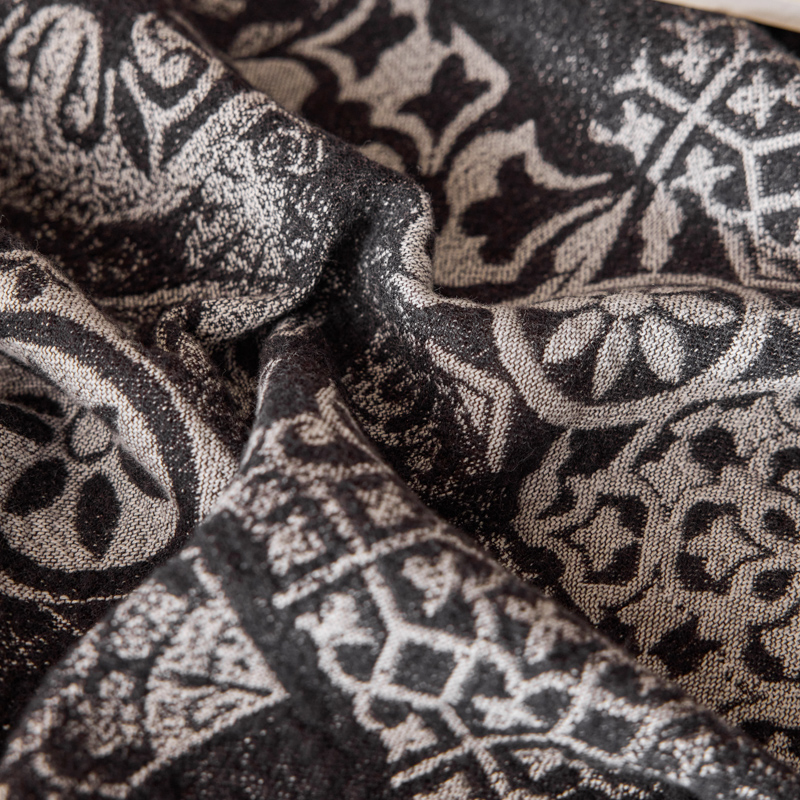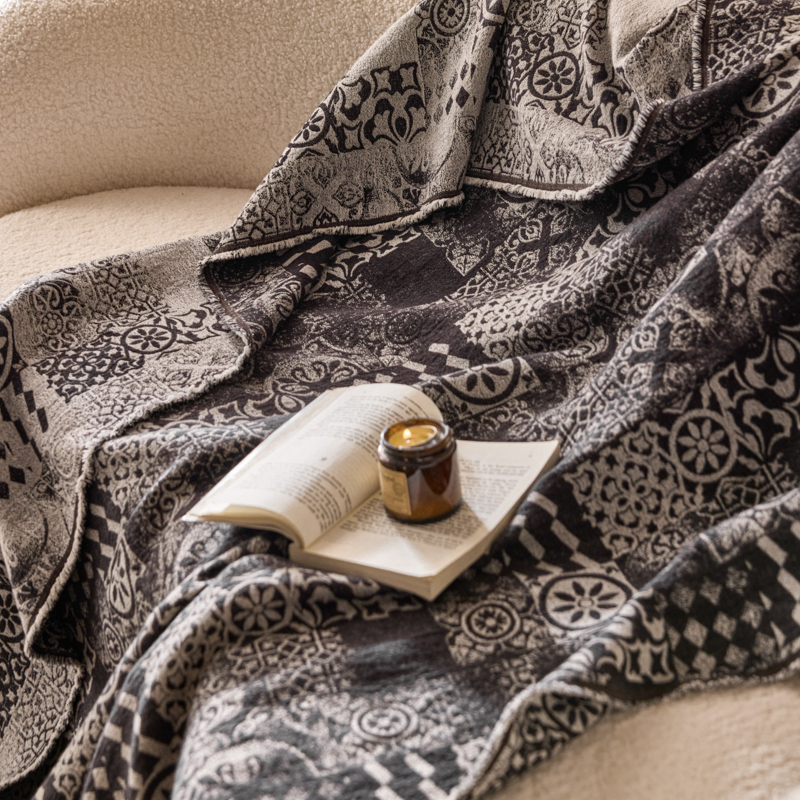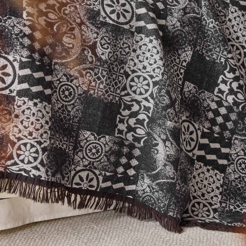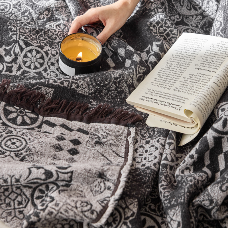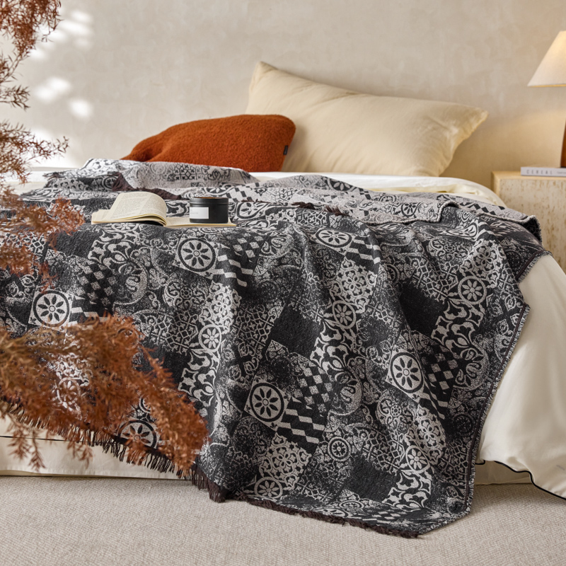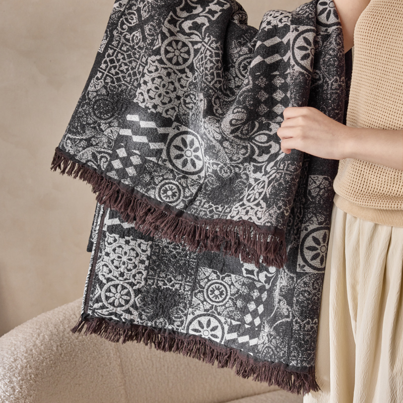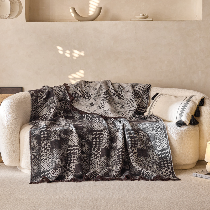 简家居 2025新款全棉色织纱布毯复古流苏毯 山茶---黑