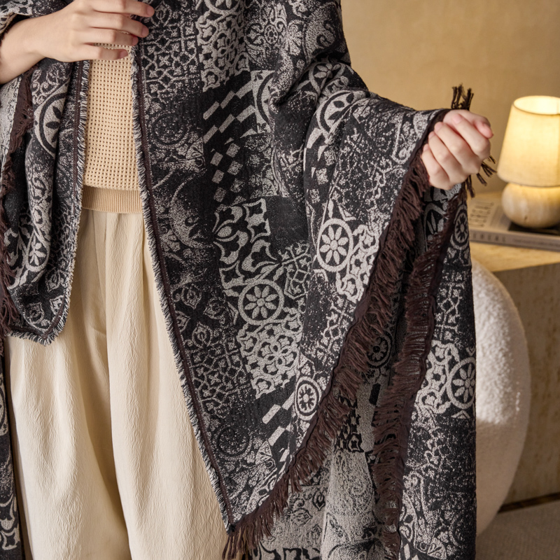 商品名称:简家居 2025新款全棉色织纱布毯复古流苏毯 山茶---黑