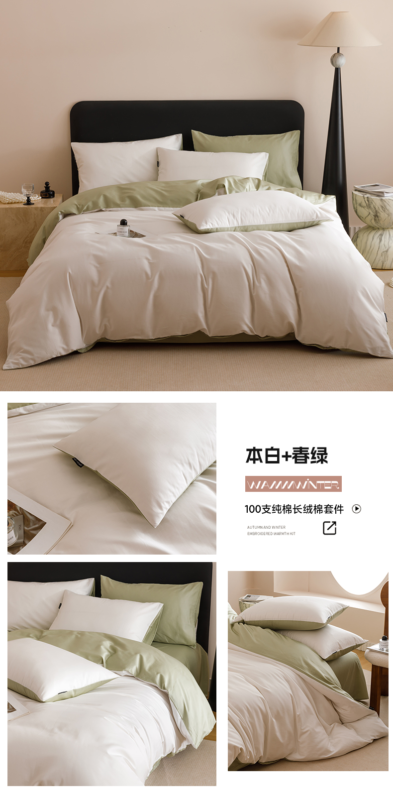 商品名称:2025新款60支纯棉长绒棉四件套 本白+春绿