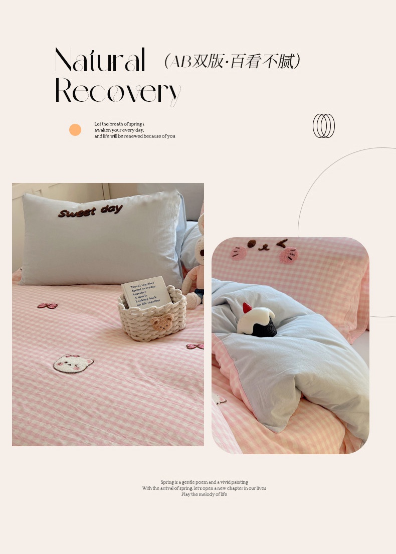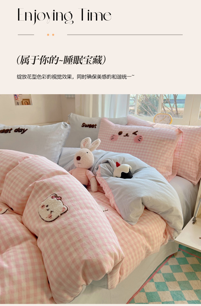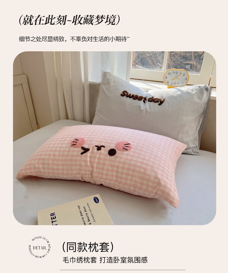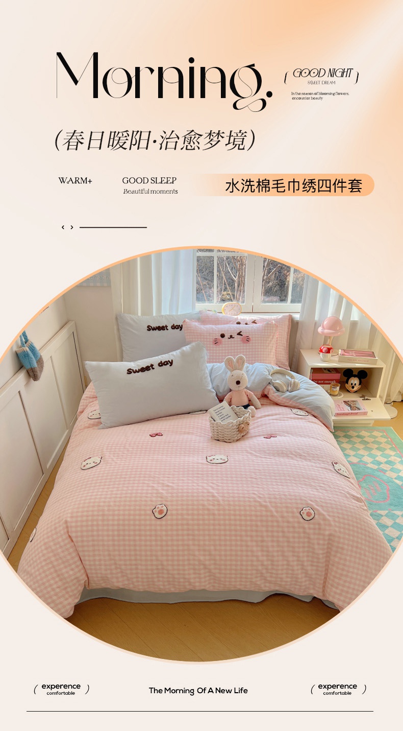 当前位置: 91家纺网 > 商品网购 > 床品套件 > 四件套 > 全棉普通四件套 > 丽涵家纺 2025新款色织水洗棉毛巾绣四件套-甜心小猫系列 甜心小猫-粉蓝-简单款